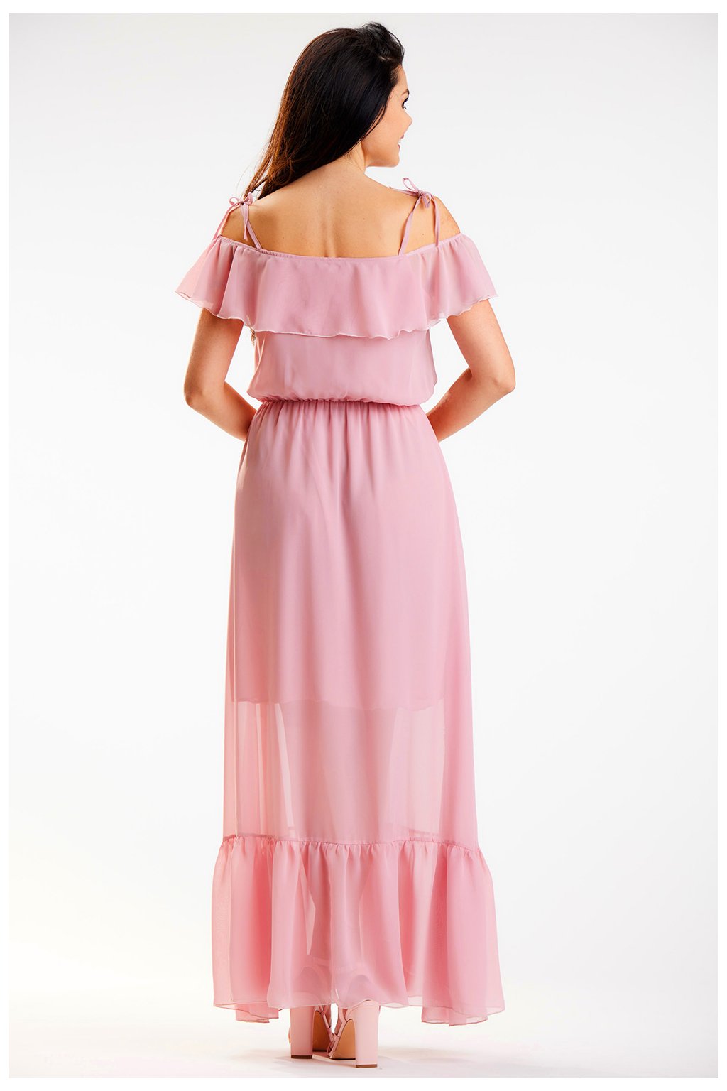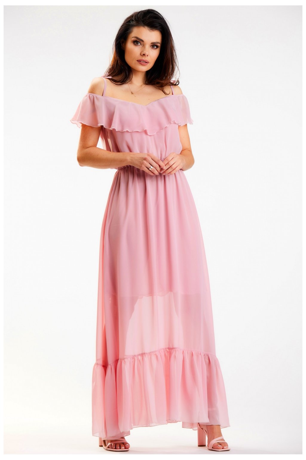 Maxi šaty s výstřihem ve španělském stylu. Horní část šatů zdobí volán. Guma zdůrazňuje pas. Šaty jsou vyrobeny z lehkého šifonu, který se krásně usazuje při chůzi. Spodek šatů je na podšívce. Navrženo a vyrobeno v Polsku.| Velikost | Délka | Obvod beder | Obvod prsou | Obvod v pase |