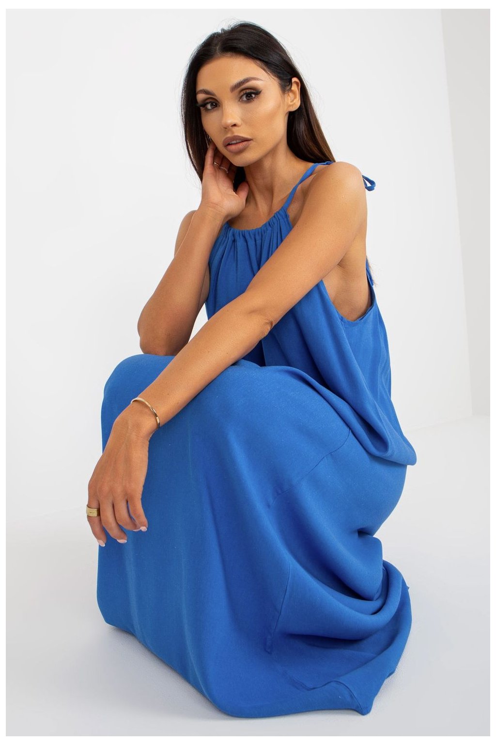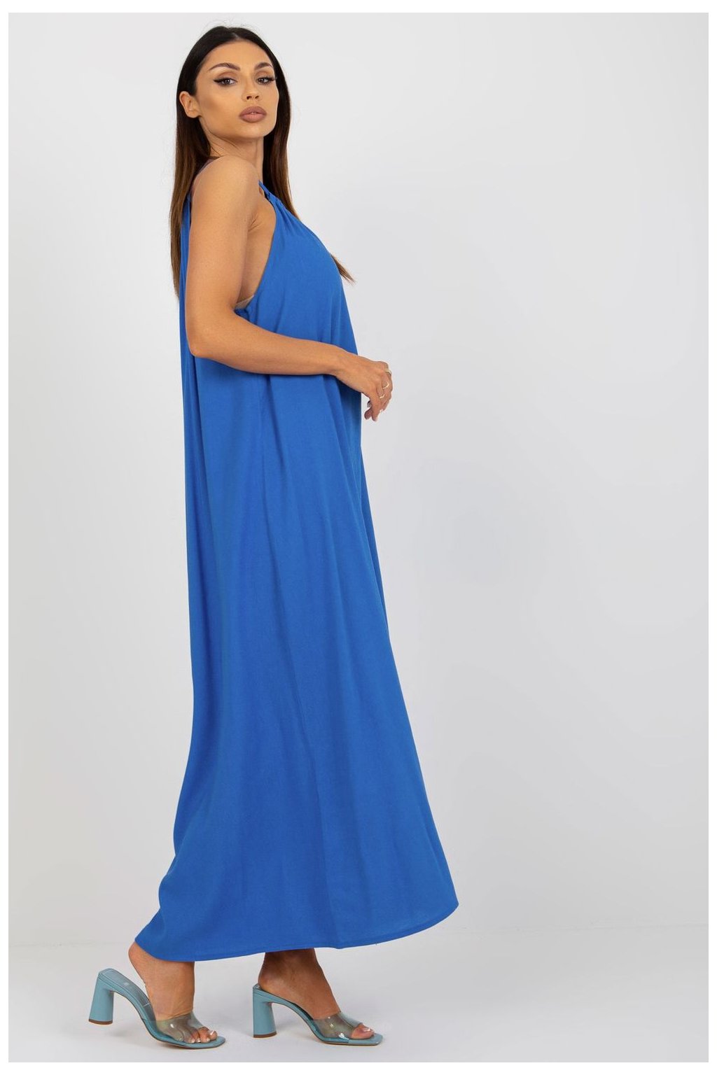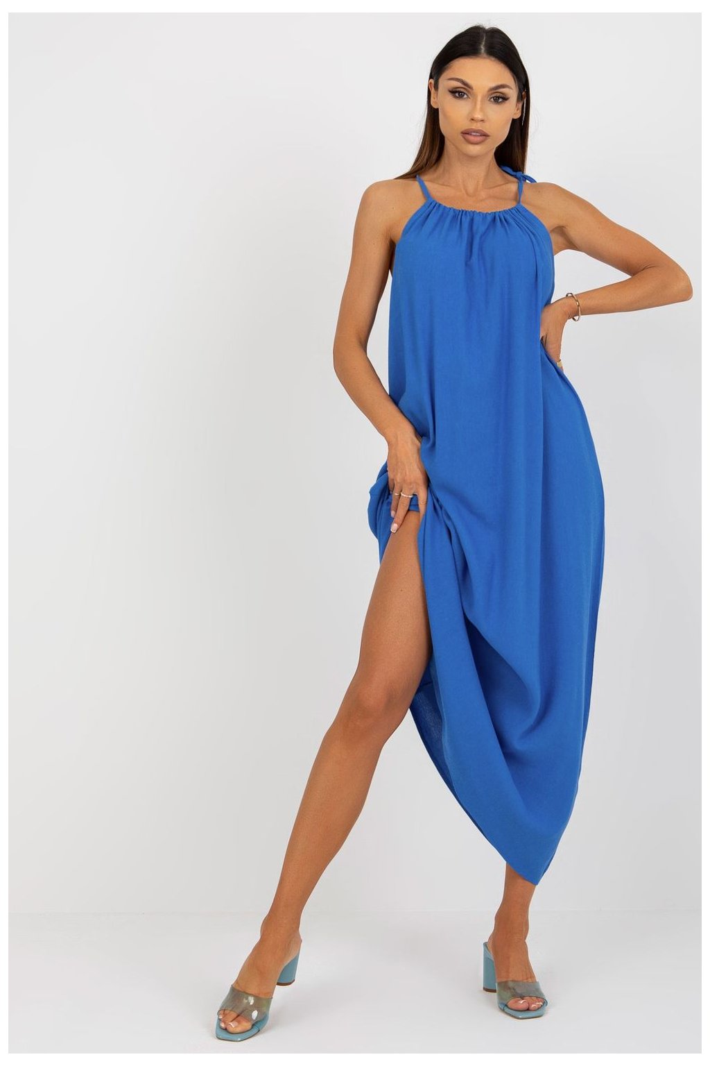 Parádní model volných šatů svázaných v pase. Delší záda a volánek ve výstřihu zdůrazňují ženské tvary. Boční rozparky pro elegantní a šik vzhled.