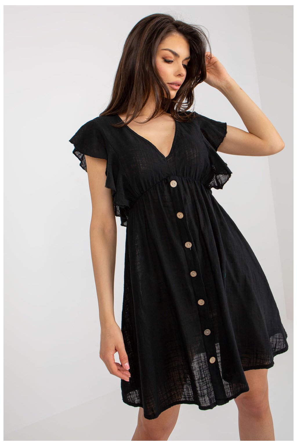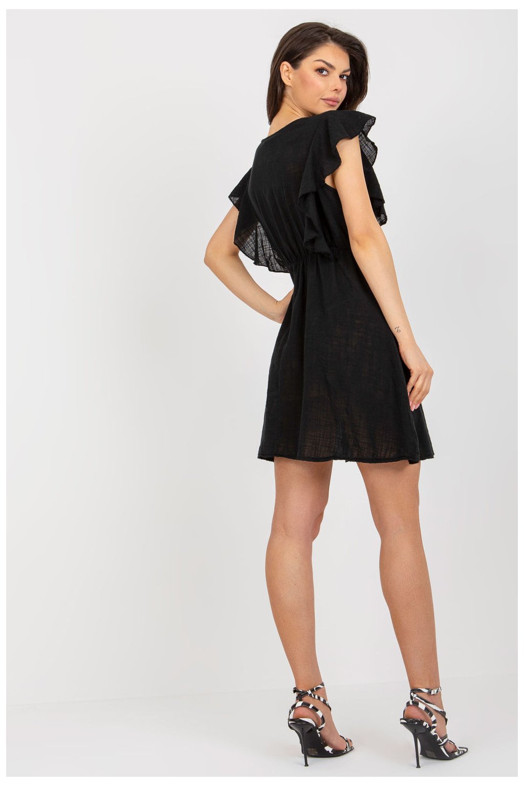 Elegantní midi šaty s asymetrickou kosticí a krátkými rukávy - černé. Šaty opticky zeštíhlují pas a zakrývají nedokonalosti v oblasti boků. Bez…