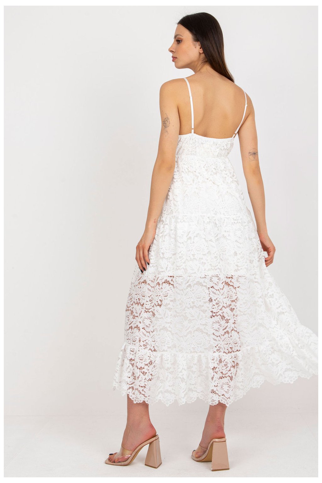 Elegantní pěnové šaty bez zad, vypasované za krkem. Mají asymetrické zapínání vpředu a skládanou sukni. Polyester