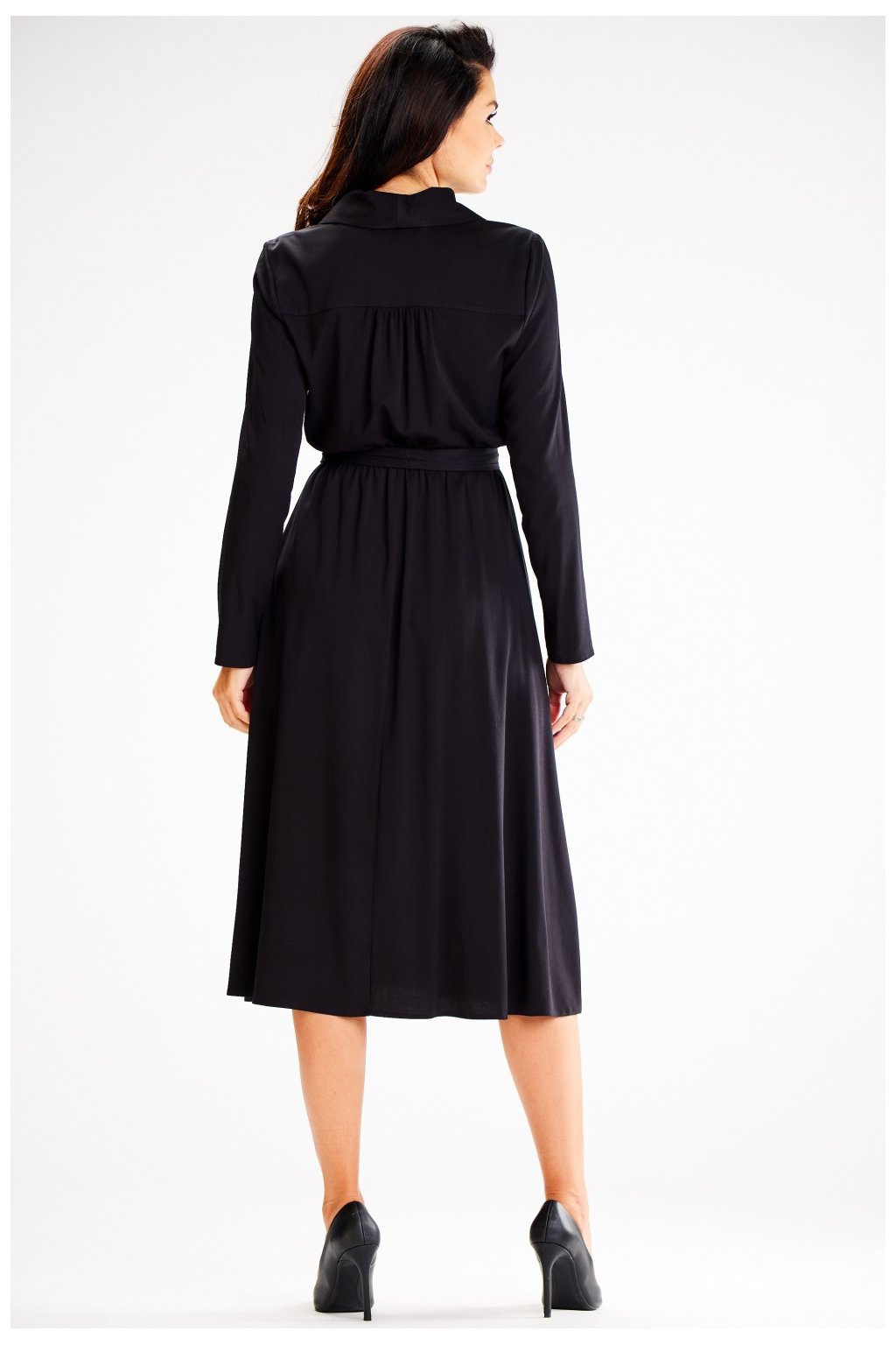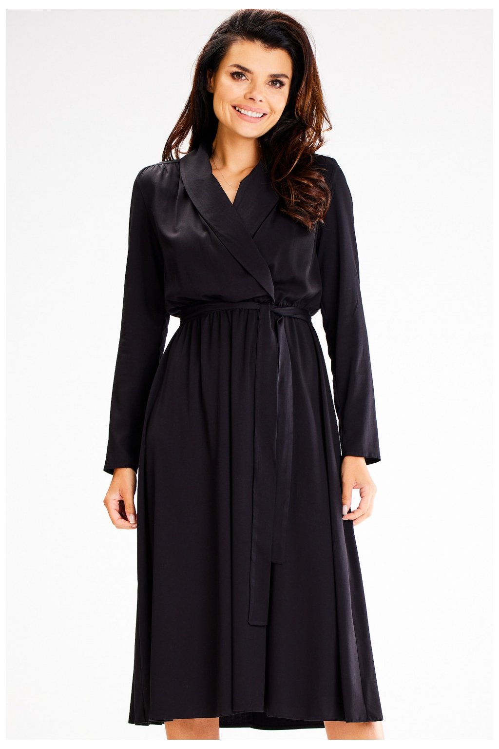 Šaty v délce ke kolenům s dlouhými rukávy a velkými lemovanými klopami ve výstřihu. Model má v pase geometrickou kostici s rozparkem na zádech pro…