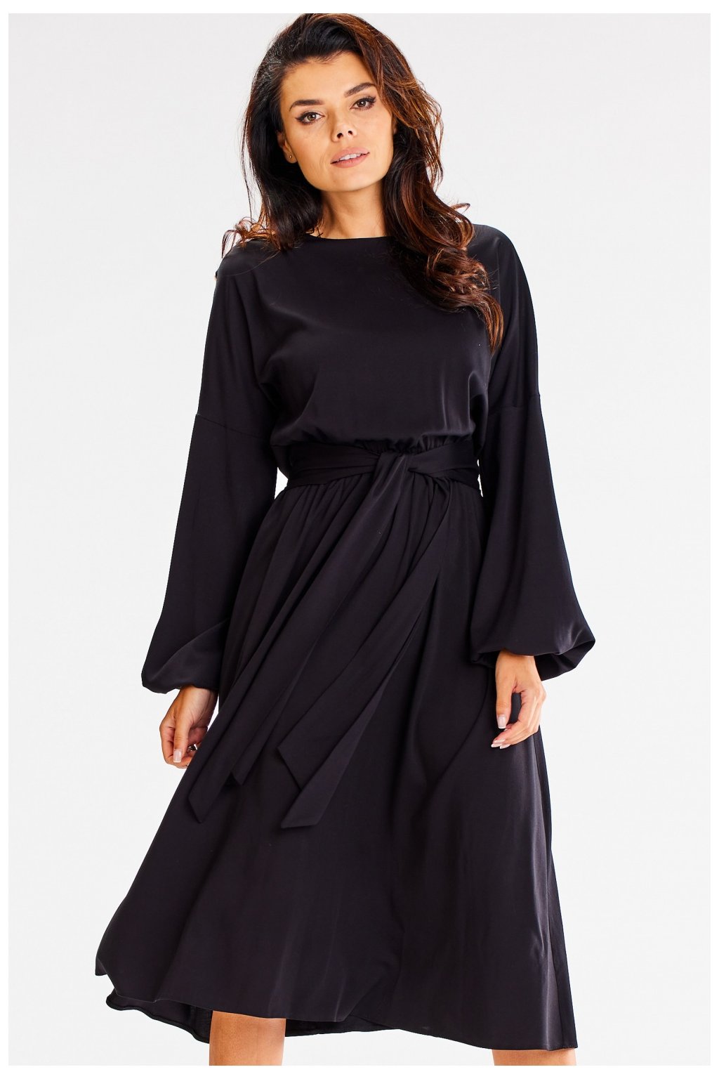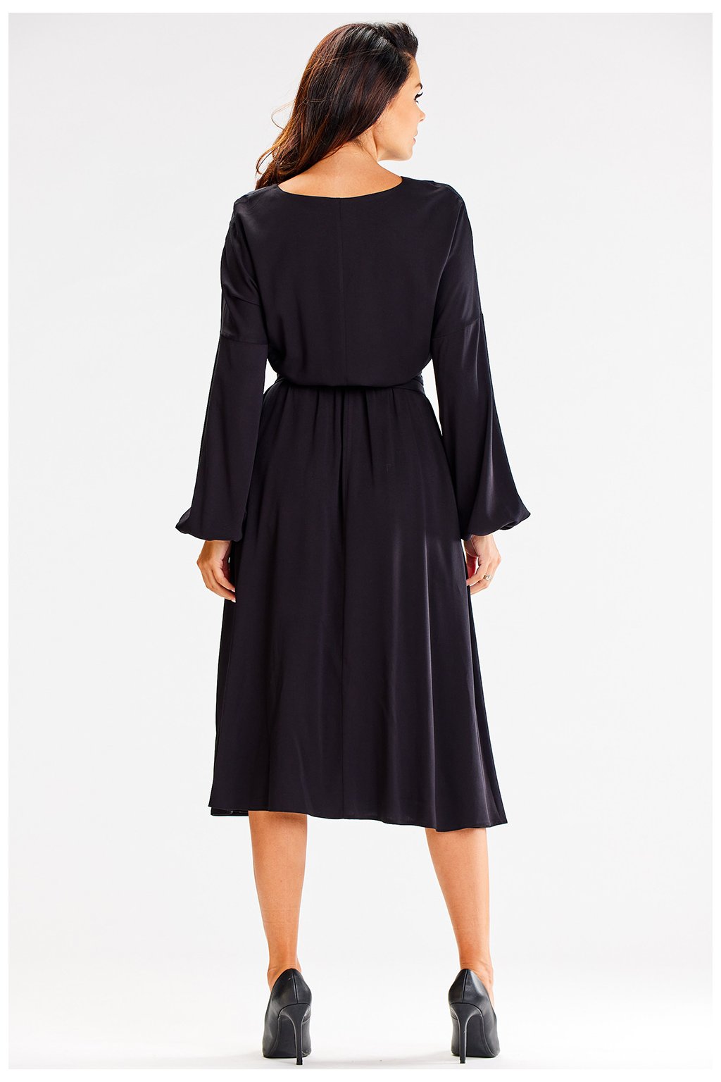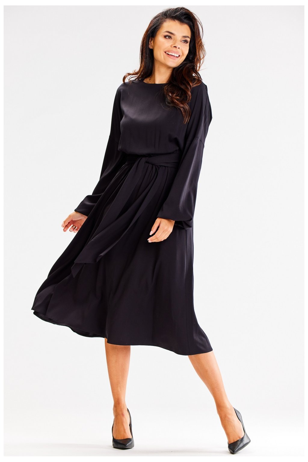 Černé lehké vzdušné midi šaty bez rukávů. Obálkový výstřih, v pase prošitý ozdobným vázaným páskem. Šaty mají rozšířenou asymetrickou spodní část.…