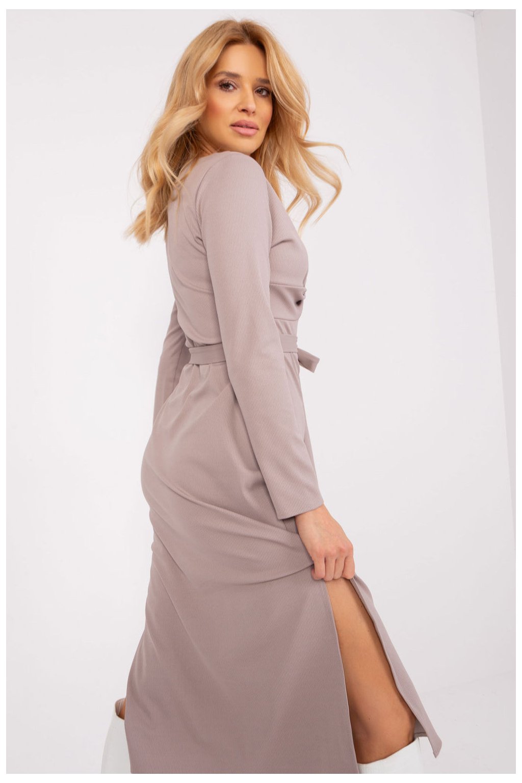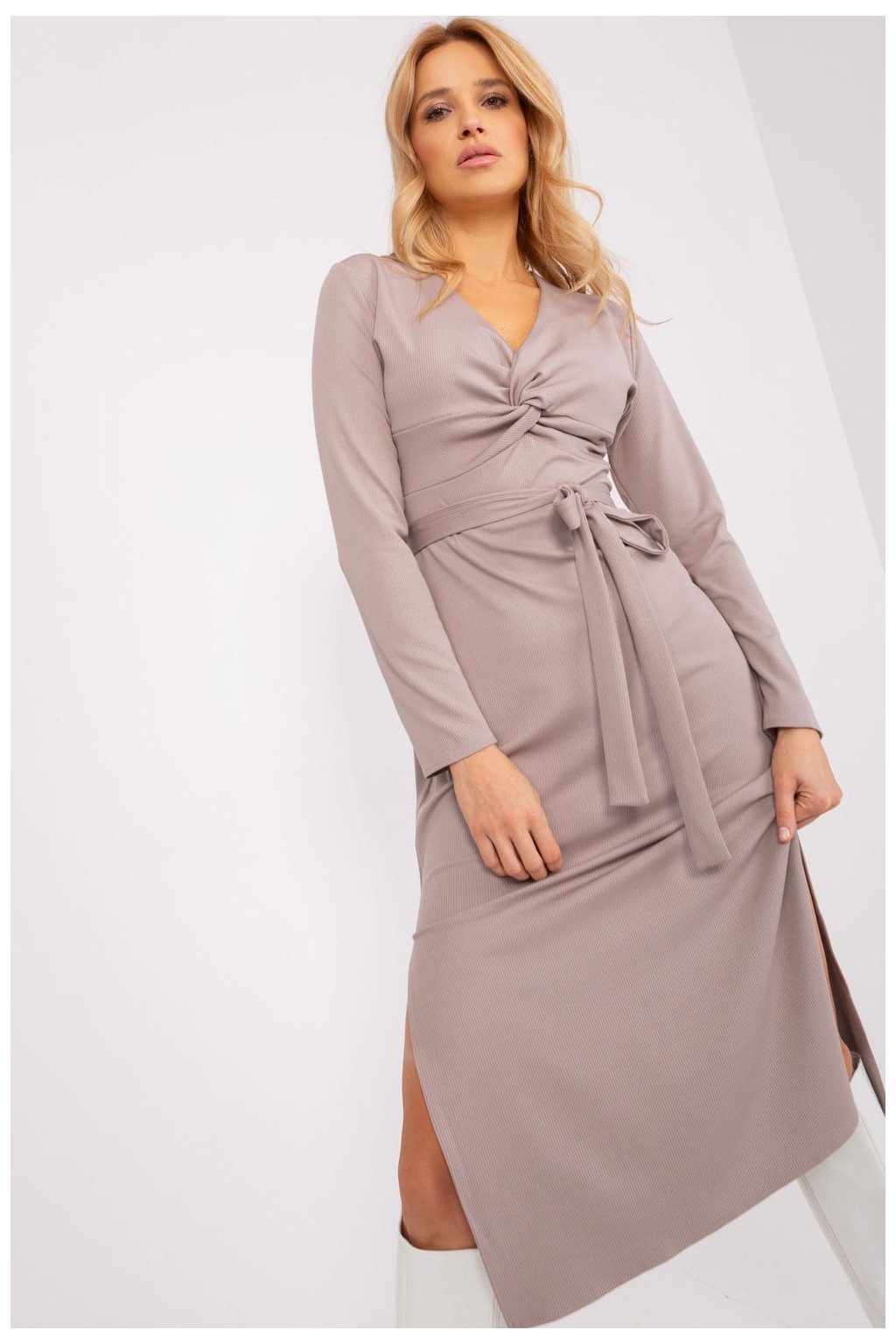 Šaty s dlouhými rukávy a srdíčkovým výstřihem. Obálkový výstřih s ozdobným proplétáním, šaty se dodávají s páskem na zavázání. Svůdné rozparky ve spodní části boků. Šaty jsou vyrobeny z žebrovaného materiálu. Návrh ideální pro mnoho příležitostí.Elastan 5 %