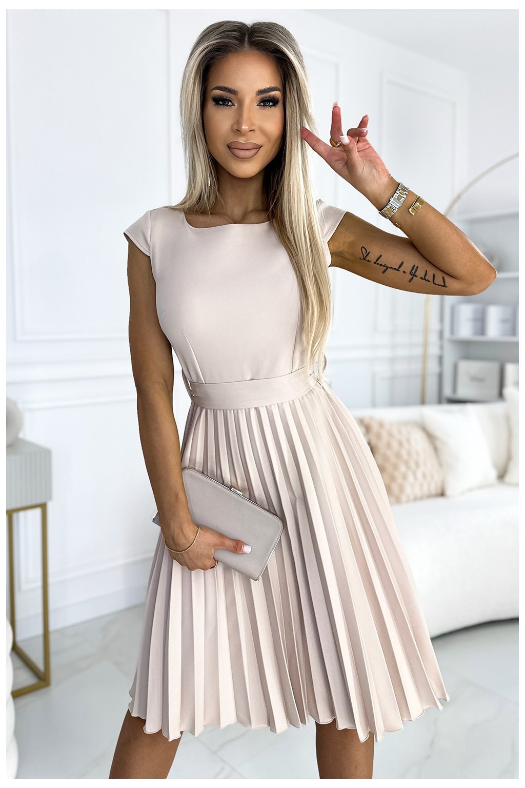 Elegantní šaty v odstínu pudrově růžové barvy s krojem A-line, který jemně zdůrazňuje postavu. Dekorativní, krátké rukávy s výstřihy dodávají lehkost…
