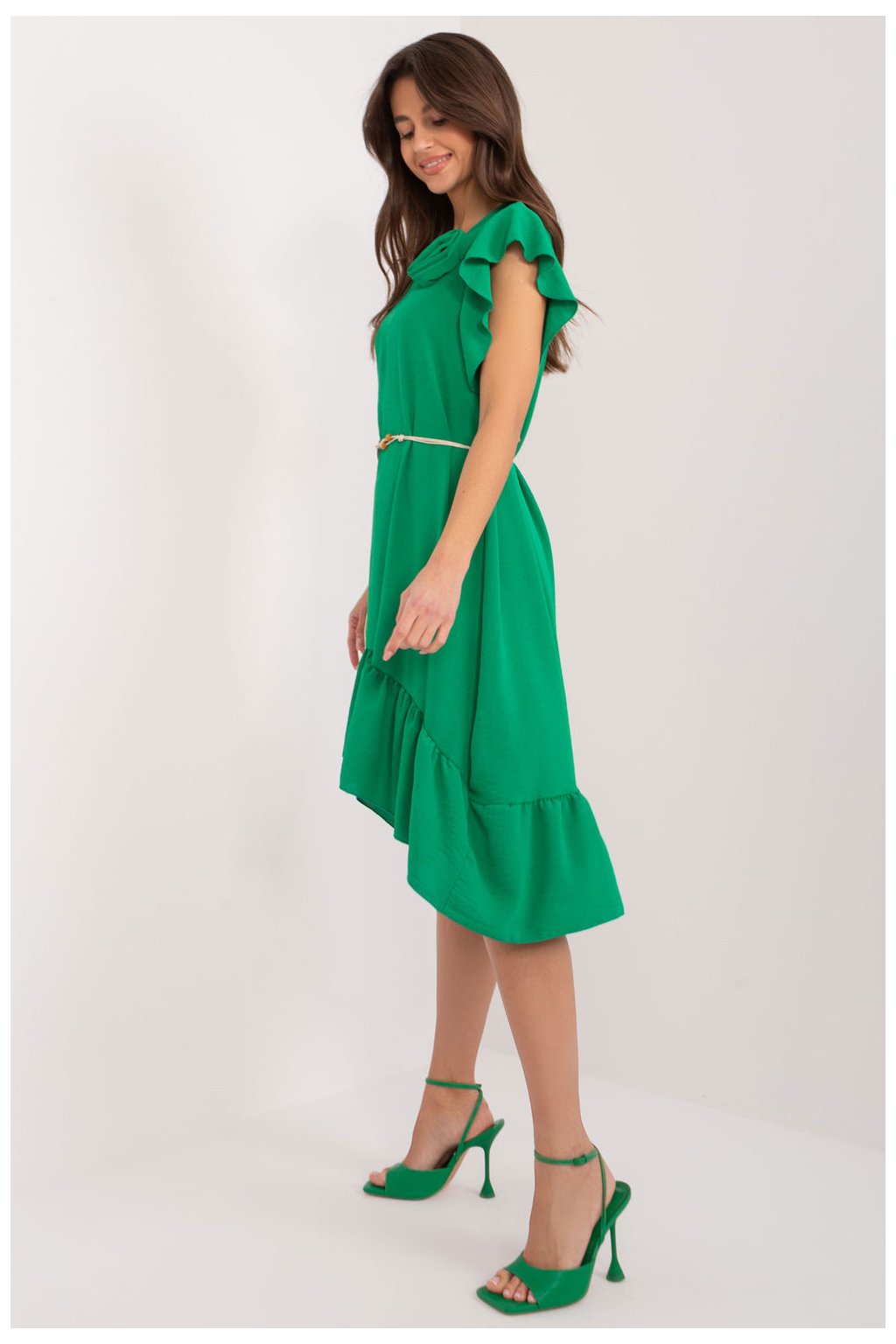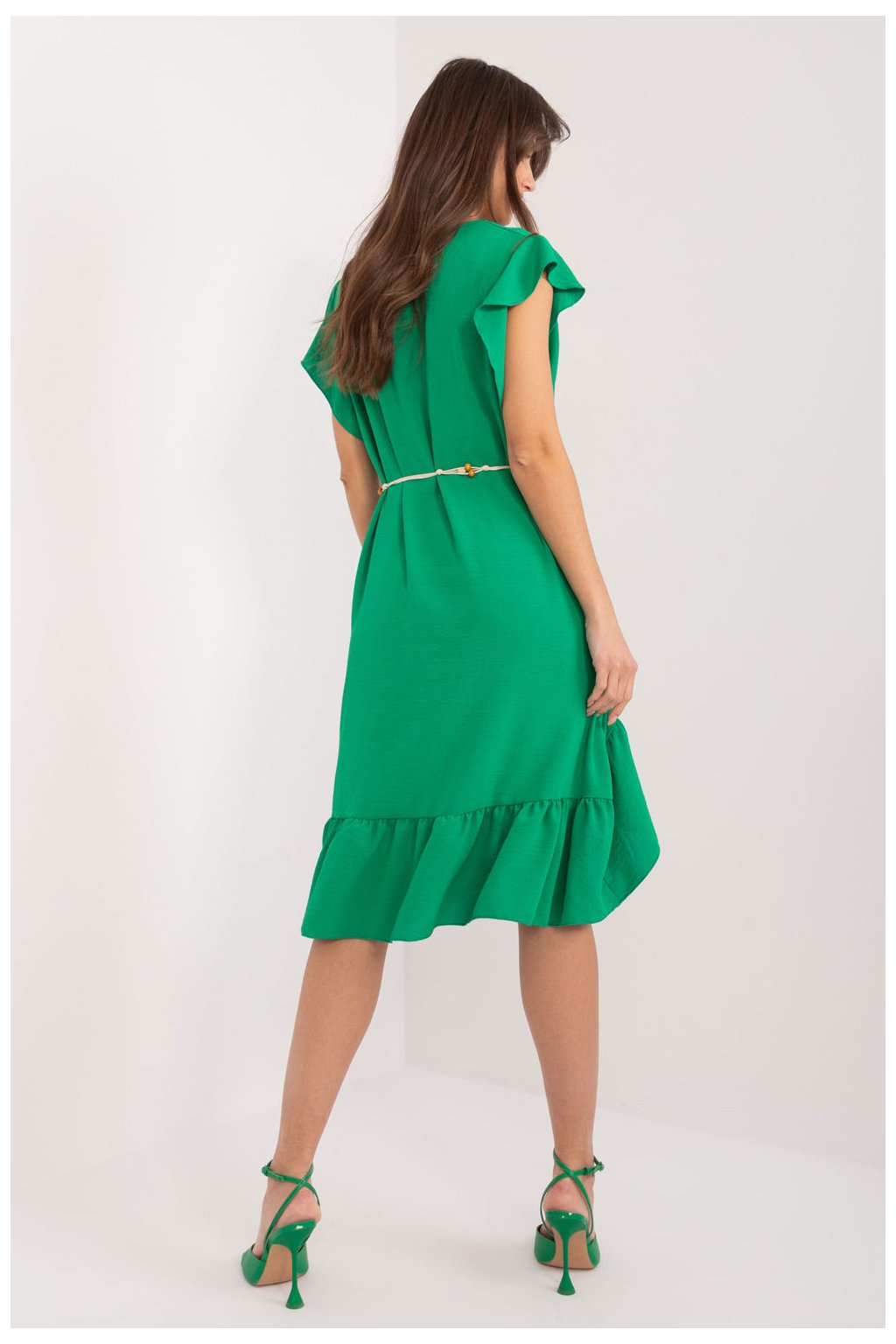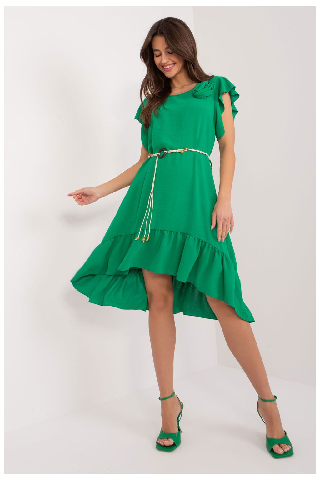 Každodenní letní šaty, které dokonale podtrhnou váš ženský půvab a zajistí každodenní pohodlí. Tento model je vyroben z hladkého polyesteru a je ideální volbou pro teplé dny, protože poskytuje volnost pohybu a lehké nošení. Díky rozšířenému střihu působí šaty lehkým a vzdušným dojmem, takže každý pohyb bude obzvlášť jemným tancem. Asymetrický střih, kdy je zadní část šatů o něco delší, dodává šatům jedinečný charakter a eleganci. Šaty mají krátké rukávy v podobě volánku, které dodávají jemnost a dívčí půvab. Kulatý výstřih je univerzální a skvěle se kombinuje s různými doplňky. Jsou vybaveny páskem na zavazování, který zvýrazňuje pas a dodává šatům jedinečný půvab. Ve spodní části šatů je navíc umístěn volán, který dodává šatům jemnost a lehkost. Délka šatů sahá před kolena, takže jsou ideální volbou pro různé příležitosti, od setkání s přáteli až po každodenní povinnosti. Díky své jednoduchosti a eleganci se šaty jistě stanou oblíbeným kouskem vašeho šatníku pro letní dny.Polyester 95 %