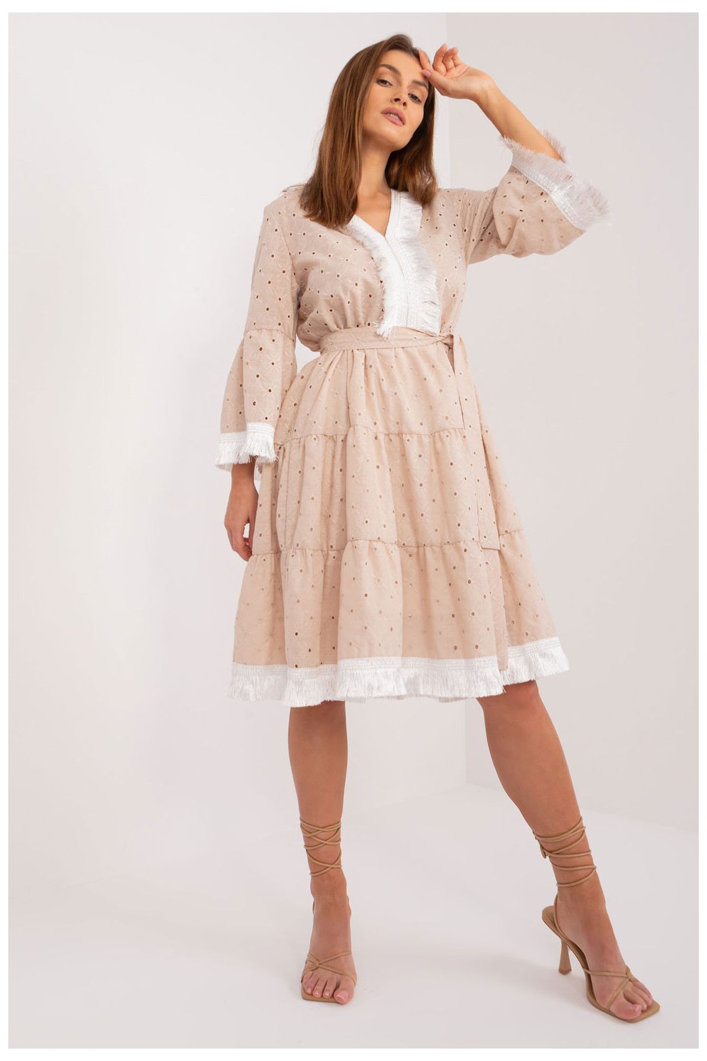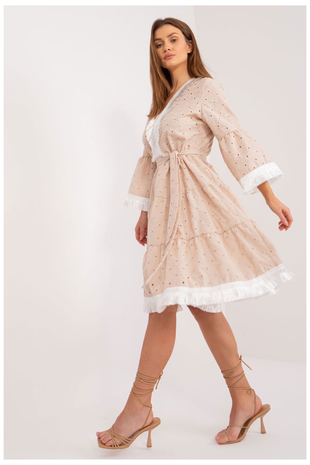 Tyto nádherné šaty jsou esencí boho stylu, ideální pro každodenní vycházky, a to díky svému lehkému, rozšířenému střihu, který je uvolněný a pohodlný. Díky svému prolamovanému vzoru jsou mimořádně nápadné a upoutají pozornost svým jemným půvabem. Šaty jsou vyrobeny z vysoce kvalitní bavlny a zaručují pohodlí i v těch nejteplejších dnech. Jejich midi délka jim dodává eleganci a zároveň se hodí pro různé příležitosti. Srdíčkový výstřih s ozdobnými střapci dodává šatům šarm a jemnost a zdůrazňuje jemnost ženského dekoltu. Díky podšívce jsou šaty nejen pohodlné, ale také estetické a poskytují dodatečnou úroveň ochrany. Pásek na zavázání zvýrazňuje pas, dodává siluetě ženský tvar a stylingu dodává eleganci. Třásňové 3/4 rukávy dodávají šatům výrazný boho nádech a podtrhují jejich jedinečný styl. Tyto šaty jsou ideální volbou pro ženy, které ocení pohodlí, volnost a ležérní, ale stylový každodenní vzhled.| Velikost | Obvod prsou | Obvod v pase |