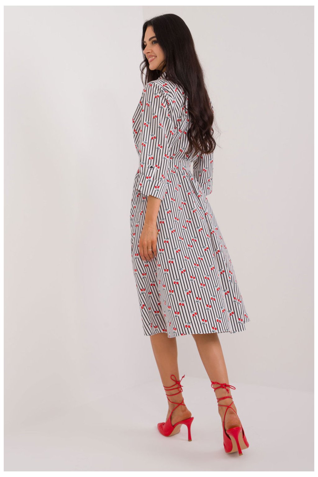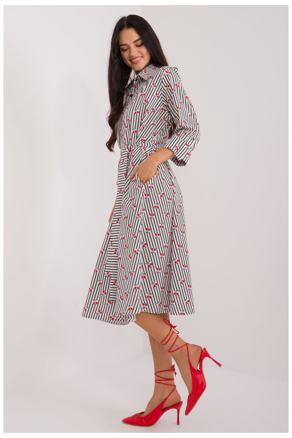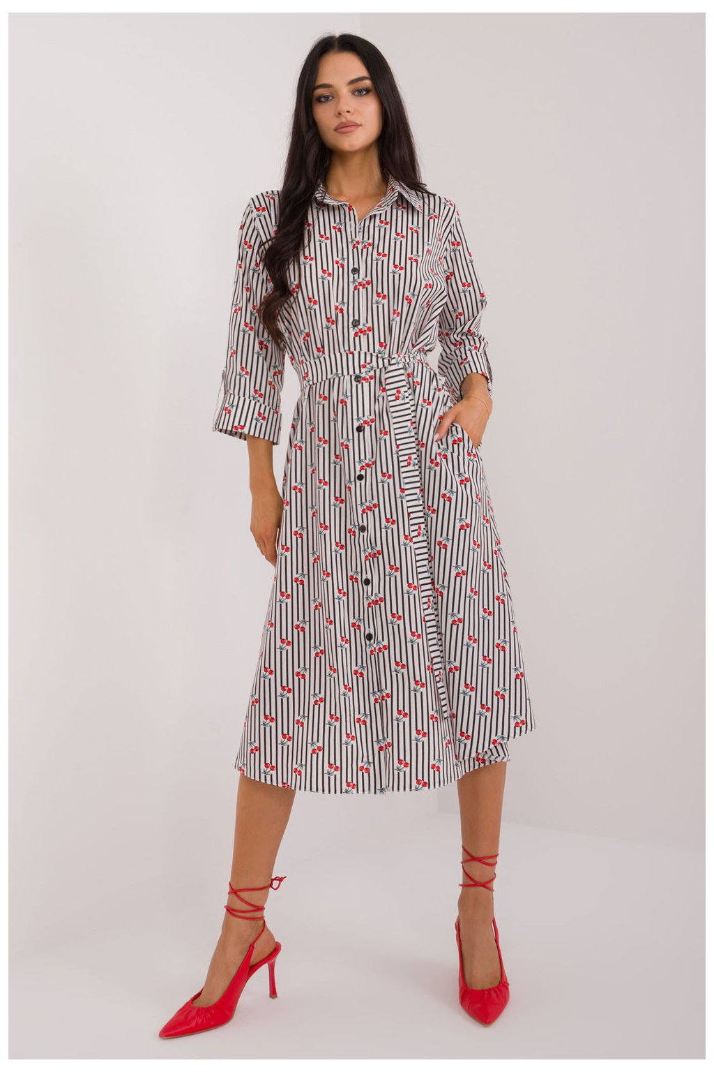 Košilové šaty ideální pro každodenní nošení i do práce. Díky rozšířenému střihu a midi délce jsou pohodlné a elegantní. Tlumený potisk a hlavní materiál polyester jim dodávají univerzální charakter. Tříčtvrteční rukávy a límeček dodávají šatům noblesu, zatímco knoflíky a pásek na zavázání zdůrazňují ženskou siluetu. Díky nakládaným kapsám jsou navíc šaty praktické a funkční pro každodenní nošení.Polyester 75 %