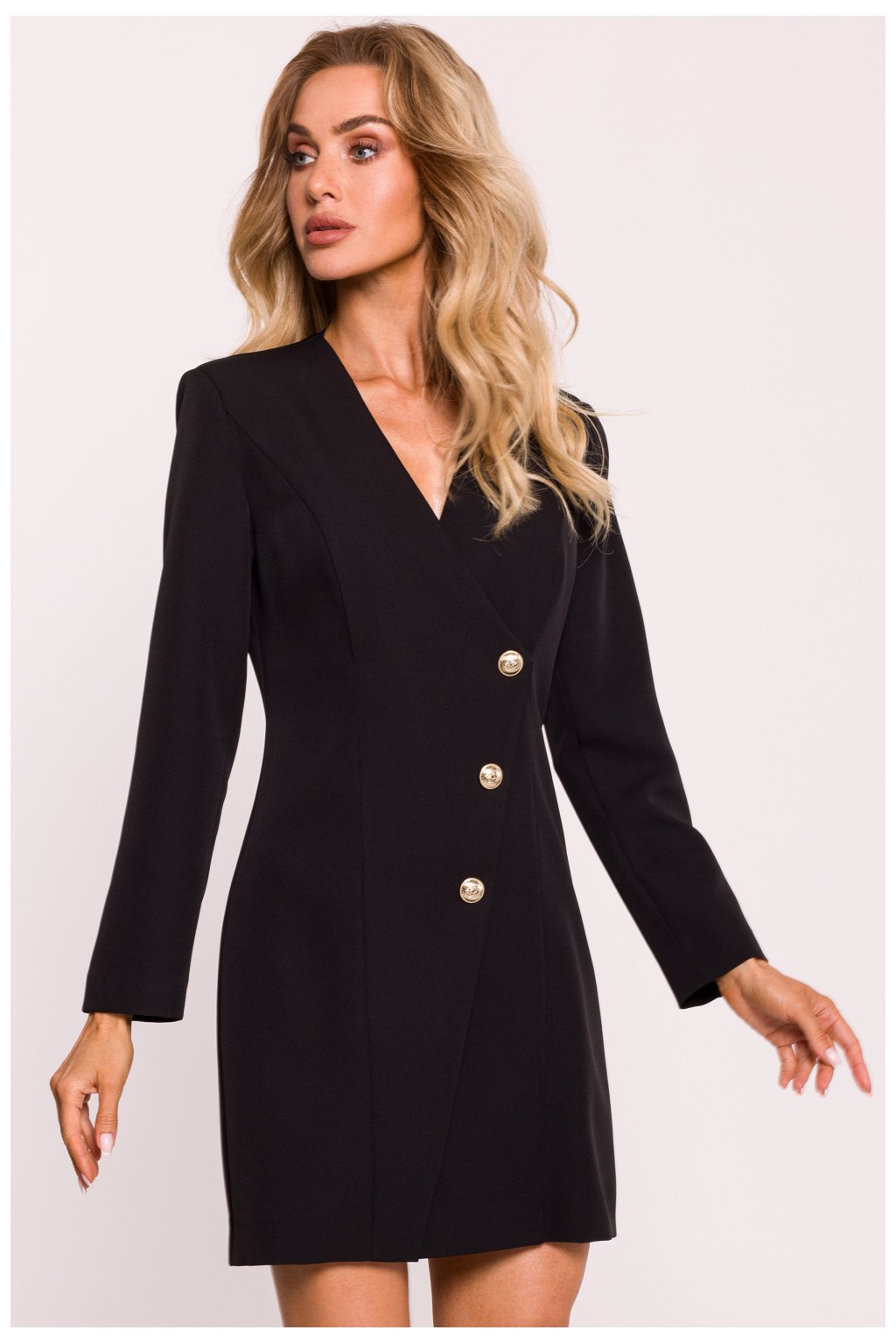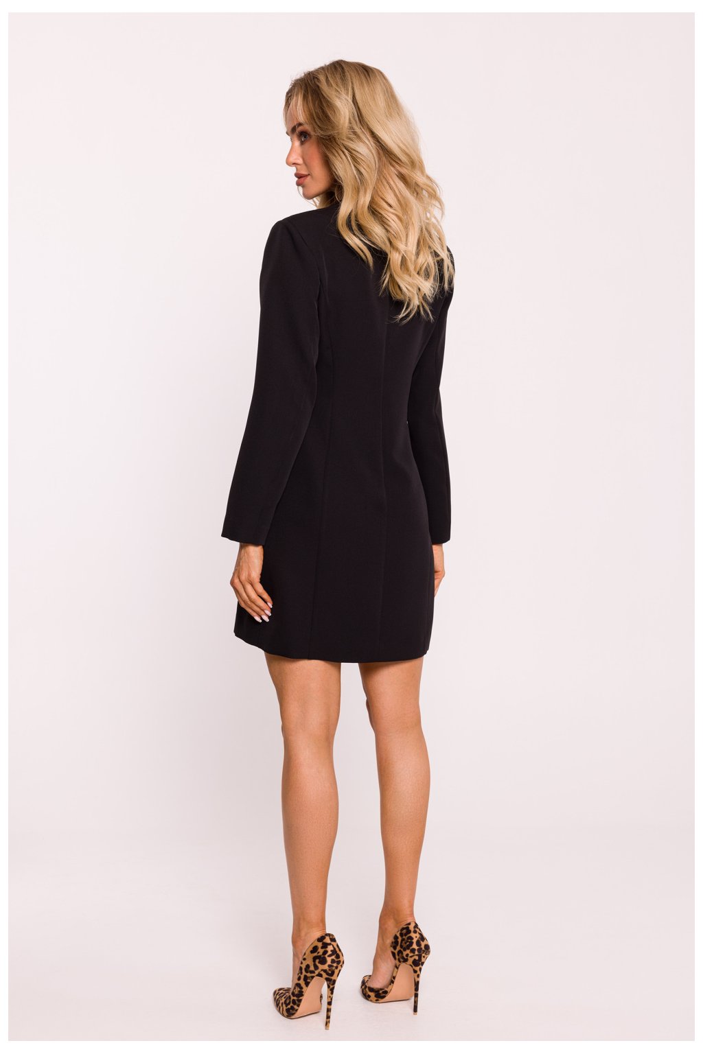 Sakošové šaty s límečkem, vytvořené z elegantní látky, nabízejí unikátní spojení klasiky a moderního stylu. Nesedící střih poskytuje volný, uvolněný střih, ideální pro každodenní i formální příležitosti. Dlouhé rukávy a dekorativní zlaté knoflíky na přední straně, které nejsou rozepínatelné, dodávají šatům eleganci a eleganci. Na zadní straně je skrytý zip, který usnadňuje oblékání a svlékání. Šaty mají délku nad kolena a nemají podšívku, což z nich dělá lehké a pohodlné. Navrženo a ušito v Polsku, kombinuje nejvyšší kvalitu zpracování s moderním designem.Polyester 95 %