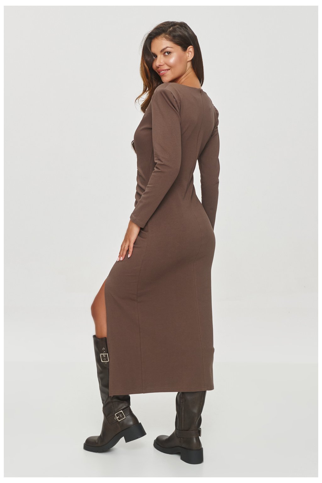 Elegantní šaty jsou návrhem s moderními detaily, které jim dodávají výraznosti. Model je přizpůsobený, což zdůrazňuje postavu. Dosahuje poloviny lýtek a jeho délka z něj dělá vhodný k různým příležitostem. Vyrobeno z elastického, měkkého materiálu, který se pohodlně přizpůsobuje tělu. Vrchní část šatů má klasický, kulatý výstřih a dlouhé rukávy, což jim dodává eleganci a dělá je vhodnými pro chladnější dny. Na výšce boků se nachází charakteristické rýhování, které je uspořádáno ve formě vodorovných záhybů. Tento detail dodává šatům jedinečný charakter a opticky zužuje postavu. Šaty mají výrazný rozštěp vpředu na výšce stehna, což jim dodává smyslnost a umožňuje větší volnost pohybu. Můžete je zkombinovat s černými vysokými kozačkami na ploché podrážce, což dodá stylizaci rockový charakter. To je skvělý návrh na večerní vycházky nebo více formální příležitosti pro ženy, které si cení klasiky s moderním twistem.Elastan 5 %