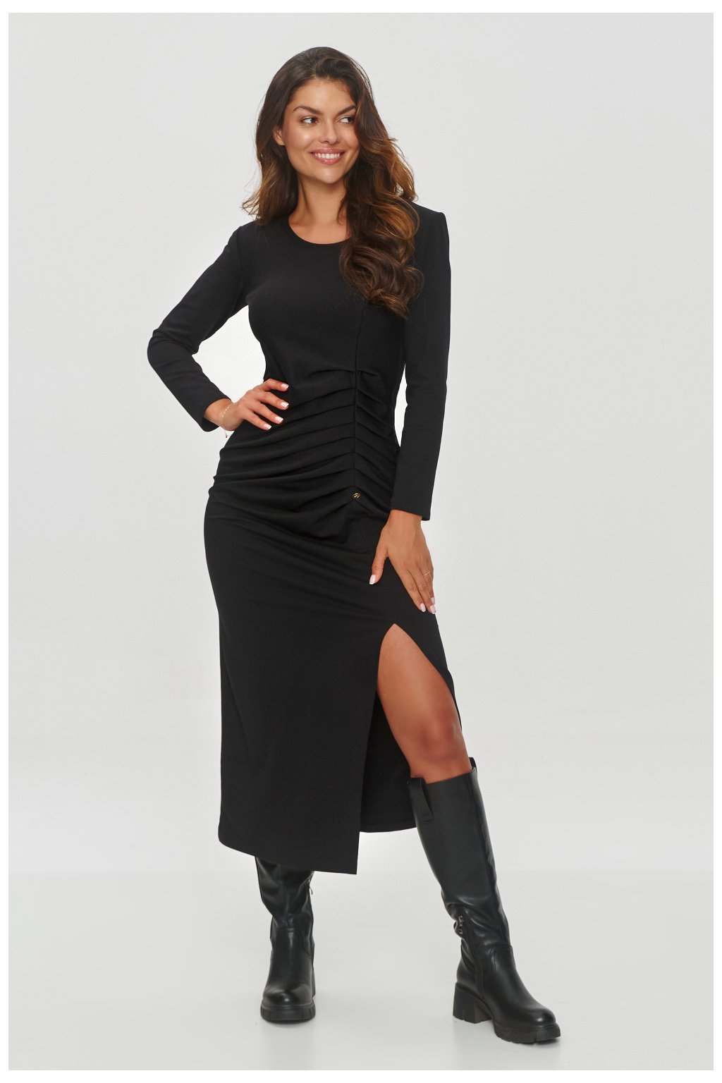 Elegantní šaty jsou návrhem s moderními detaily, které jim dodávají výraz. Model je přizpůsobený, zdůrazňující tak siluetu. Dosahuje poloviny lýtek a jeho délka z něj dělá vhodnou pro různé příležitosti. Vyrobeny z elastického, měkkého materiálu, který se pohodlně přizpůsobuje tělu. Horní část šatů má klasický, kulatý výstřih a dlouhé rukávy, což jim dodává eleganci a činí je vhodnými na chladné dny. Na výšce boků je charakteristické rýhování, které je uspořádáno v horizontálních záhybech. Tento detail dodává šatům unikátní charakter a opticky zjemňuje siluetu. Šaty mají výrazné rozštěpení vpředu v oblasti stehen, což jim dodává smyslnost a umožňuje větší volnost pohybu. Můžete je kombinovat s černými, vysokými kozačkami na ploché podrážce, což stylizaci dodá rockový nádech. Jsou skvělou volbou pro večerní výjezdy nebo formální příležitosti pro ženy, které ocení klasiku s moderním twistem.Elastan 5 %