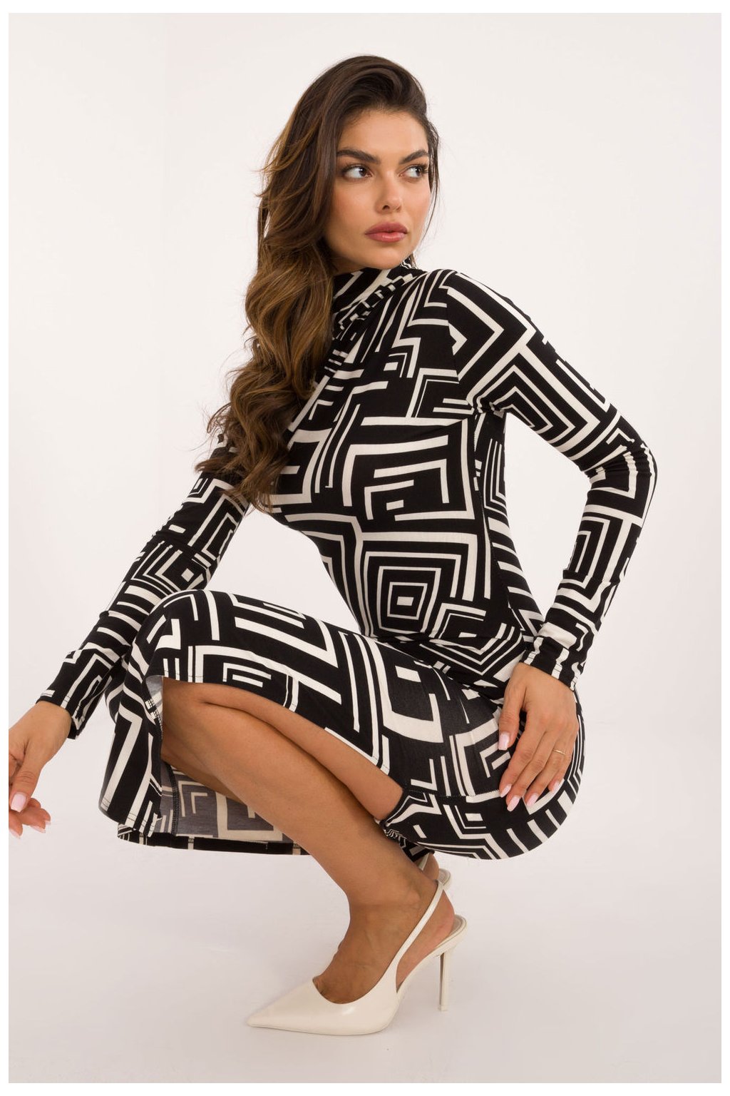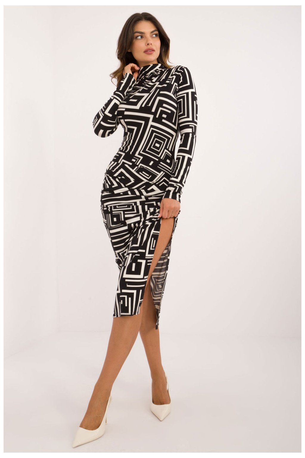 Tužkové šaty s rolákem pro každodenní nošení, které kombinují pohodlí a styl. Jsou vyrobeny z měkké viskózy, takže se pohodlně nosí po celý den. Geometrický vzor na látce dodává šatům moderní nádech, zatímco ozdobné záhyby decentně zvýrazňují siluetu a dodávají jim elegantní vzhled. Šaty v midi délce a s dlouhými rukávy se skvěle hodí na běžné i méně formální události. Ideální volba pro ženy, které ocení kombinaci klasiky s módními, výraznými detaily.Viskóza 90 %