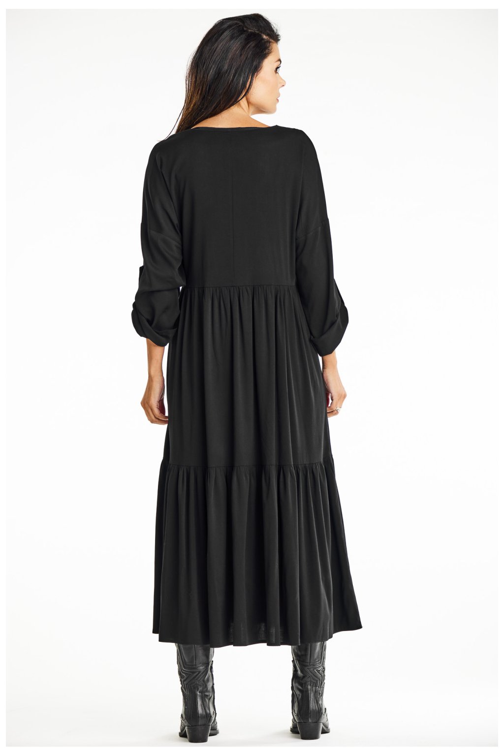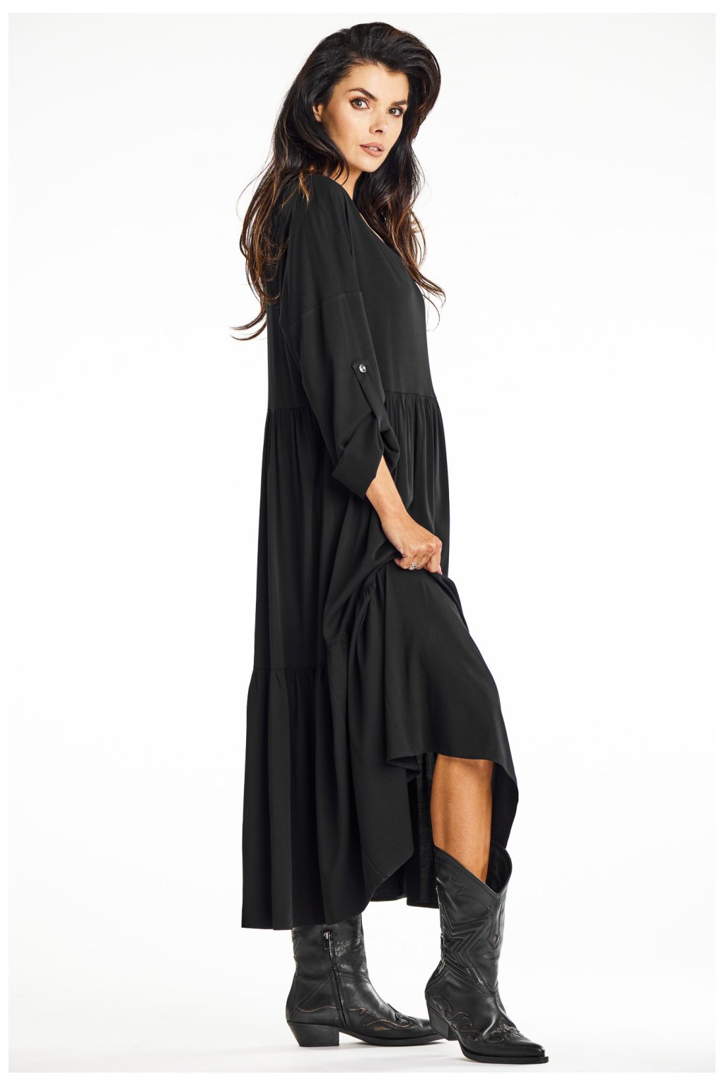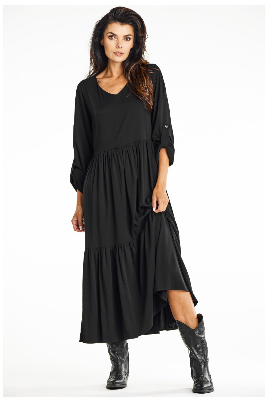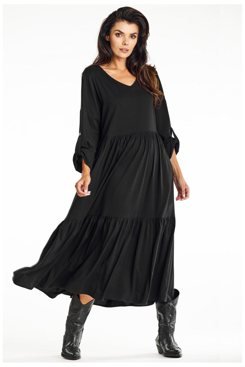 Volné kimonové maxi šaty z viskózy s volánkovým lemem v černé barvě. Dodejte svému šatníku ležérnost a eleganci s našimi volnými kimonovými maxišaty. Jsou ideální pro každodenní nošení a nabízejí pohodlí a styl pro různé příležitosti. Rozhalený lem zakončený volánem a výstřih do V jim dodávají lehkost a jemnou eleganci. Jsou vyrobeny z vysoce kvalitní viskózy, takže nabízejí prodyšnost a pohodlí. Černá barva dodává všestrannost a hodí se k různým outfitům, od kovbojských bot po tenisky. Skvěle se hodí do práce, na schůzky nebo na každodenní vycházky a kombinuje ležérní styl s elegancí.Viskóza 97 %