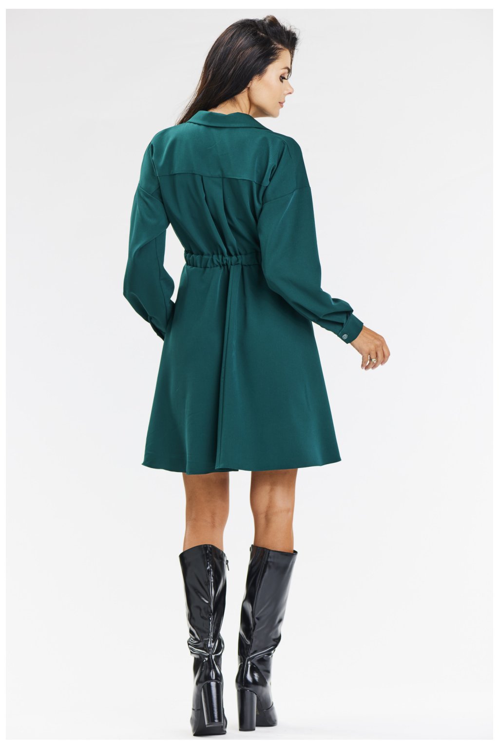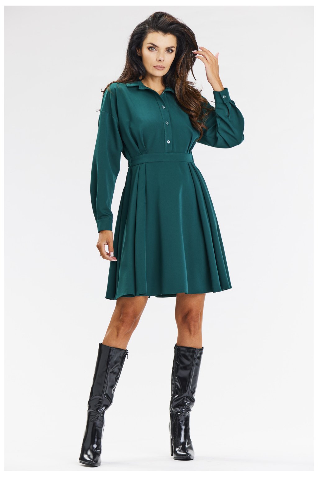 Elegantní košilové šaty v zelené barvě. Dodejte svému šatníku eleganci s našimi zelenými košilovými šaty, které se skvěle hodí pro formální a pracovní příležitosti. Rozhalený lem, délka ke kolenům a dlouhé rukávy zakončené manžetami podtrhují ženskost a styl. Stojatý límec a zapínání na knoflíky vpředu dodávají šatům moderní vzhled. Šaty se zapínají na knoflíky pro pohodlné nošení a eleganci. Díky zelené barvě jsou univerzální a snadno se kombinují s lodičkami na podpatku nebo kozačkami. Pečlivě ušité z vysoce kvalitních materiálů. Ideální na obchodní schůzky, elegantní oslavy a formální vycházky.Polyester 60 %
