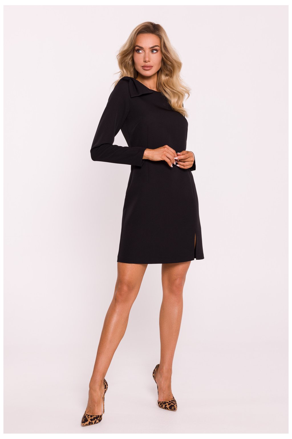 Mini šaty střižené v pase, vyrobené z elegantní látky, která dokonale sedí na postavě. Jemný rozparek vpředu dodává šatům jemnou smyslnost, zatímco dlouhé rukávy s ozdobnou mašlí na jednom rameni vnášejí do šatů stylový a ženský nádech. Šaty se vzadu zapínají na krytý zip, který působí hladce a esteticky. Model nemá podšívku, takže je lehký a ideální pro různé příležitosti. Šaty byly navrženy a ušity v Polsku a vynikají vysokou kvalitou a precizním zpracováním.Polyester 95 %