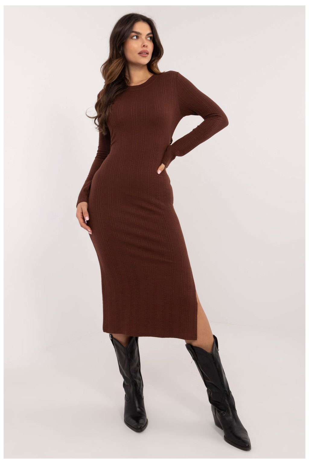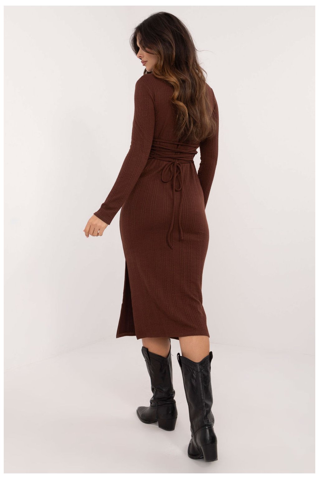 Pletený šaty s olovkovým strihom, vyrobený z pruhovaného materiálu, ideálny na každodenné nosenie. Jeho hladká faktúra a priliehavý strih podčiarkujú postavu, zatiaľ čo mäkká zmes bavlny, polyesteru a elastanu poskytuje pohodlie a pružnosť. Šaty majú midi dĺžku, dlhý rukáv a klasický, okrúhly výstrih, čo im dodáva nadčasový charakter. Ďalšou výhodou je šnurovanie korzetu na chrbte, ktoré nielenže ozdobuje, ale tiež umožňuje jemné prispôsobenie šiat k postave a dodáva im elegantný akcent.Elastan 5 %