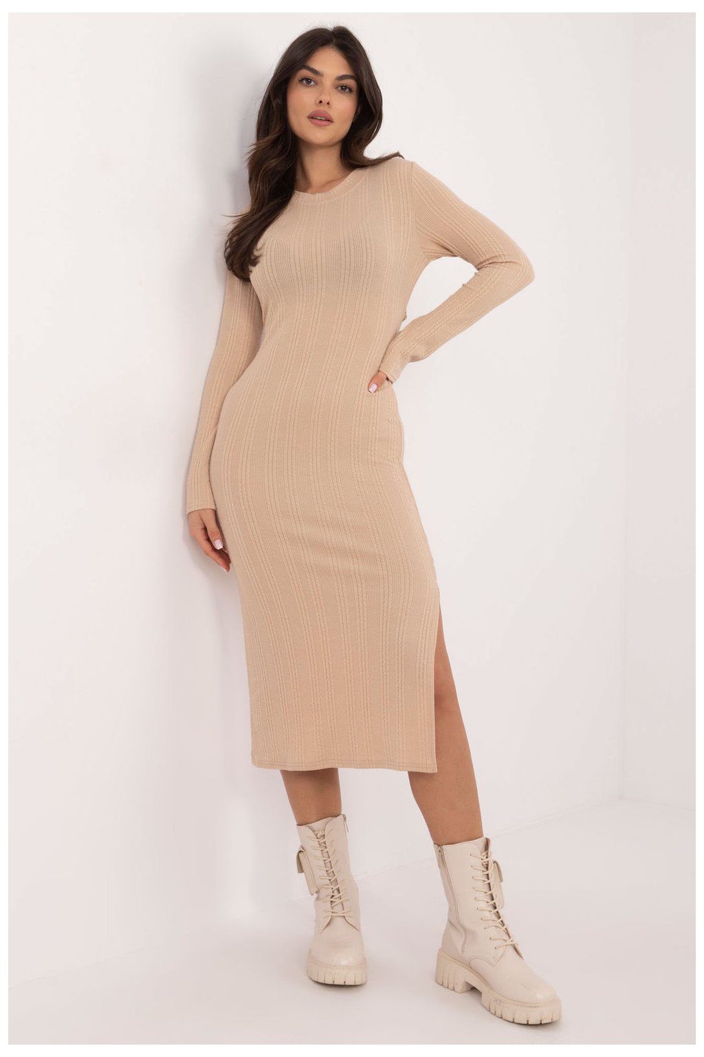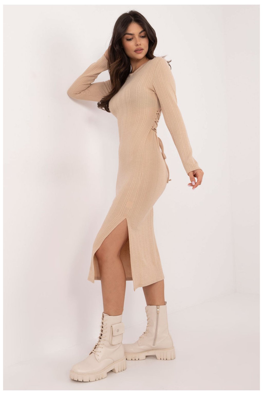 Tyto úpletové šaty ve tvaru tužky jsou vyrobeny z žebrovaného materiálu a jsou ideální pro každodenní nošení. Jejich hladká struktura a vypasovaný střih zvýrazňují siluetu, zatímco měkká směs bavlny, polyesteru a elastanu poskytuje pohodlí a pružnost. Šaty mají midi délku, dlouhé rukávy a klasický kulatý výstřih, který působí nadčasově. Jako bonus jsou korzetové vázačky na zádech nejen ozdobné, ale také umožňují šaty jemně přizpůsobit postavě, což jim dodává elegantní nádech.Elastan 5 %