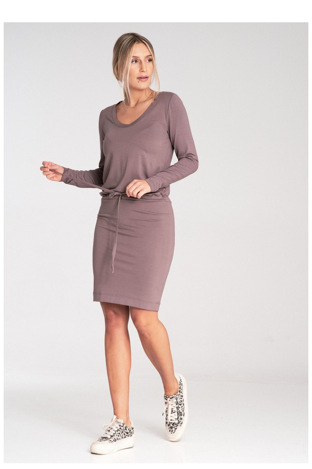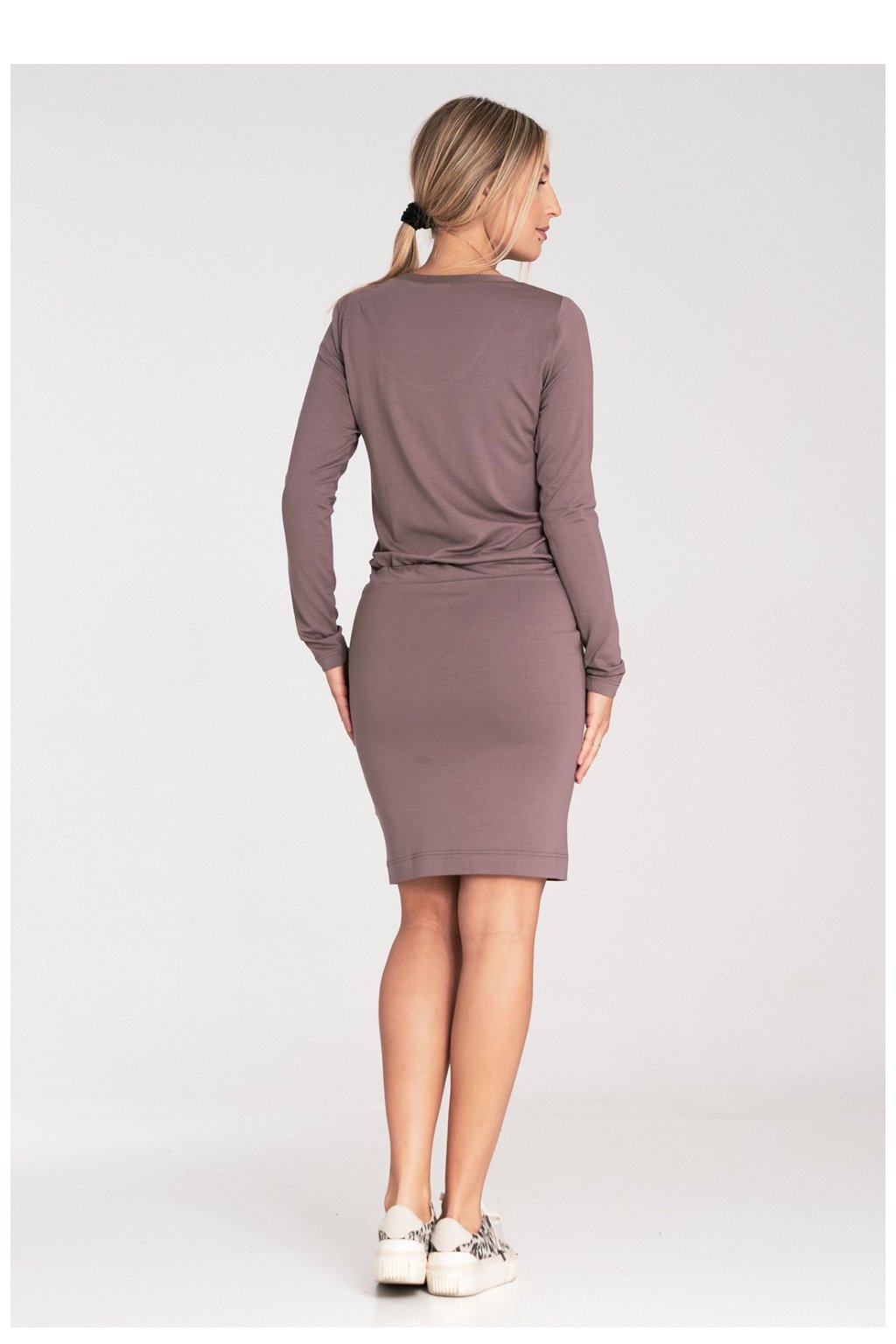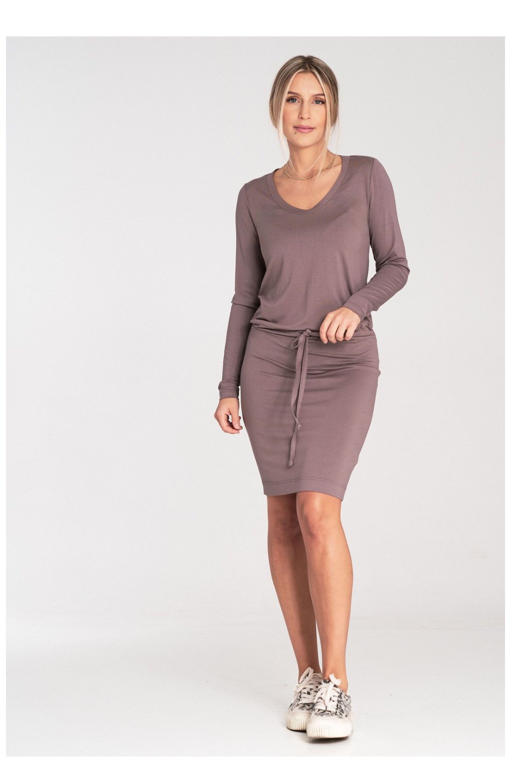 Šaty v délce ke kolenům s dlouhými rukávy a velkými lemovanými klopami ve výstřihu. Model má v pase geometrickou kostici s rozparkem na zádech pro…