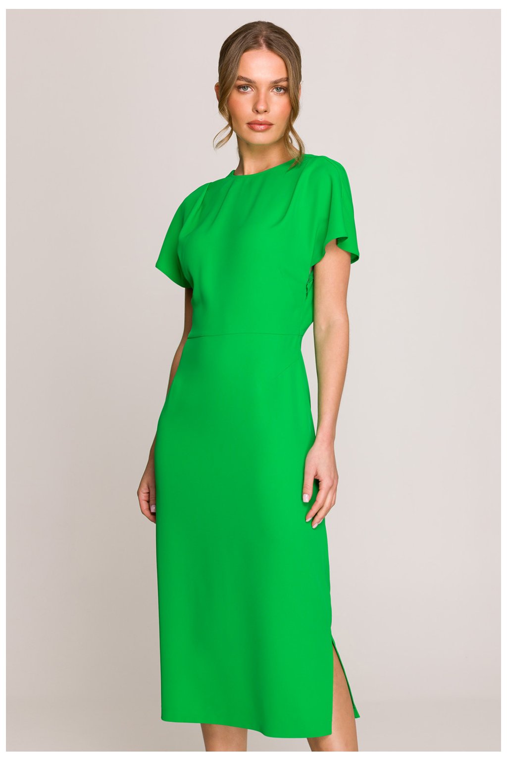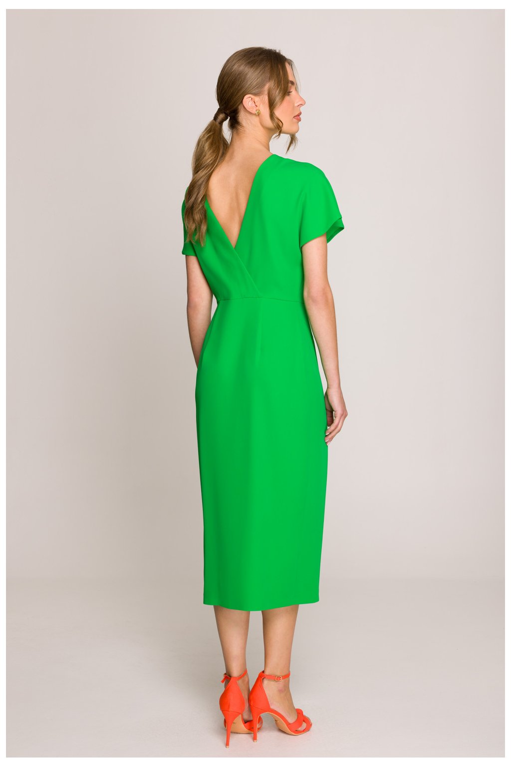 Elegantní a ženské midi šaty s přiléhavým střihem, který zdůrazňuje siluetu. Zastřešený vrch dodává šaty klasický charakter, zatímco hluboký výstřih ve tvaru písmene V na zádech přidává jemnou smyslnost. Krátké rukávy zajistí pohodlí a univerzálnost na různé příležitosti. Šaty se zapínají na skrytý zip na straně, díky čemuž se skvěle přizpůsobují postavě. Rozpark na straně přidává lehkost a volnost pohybu. Model navržený a ušitý v Polsku s důrazem na detaily a vysokou kvalitu zpracování. Ideální na elegantní výstupy, večírky a speciální příležitosti.Polyester 95 %
