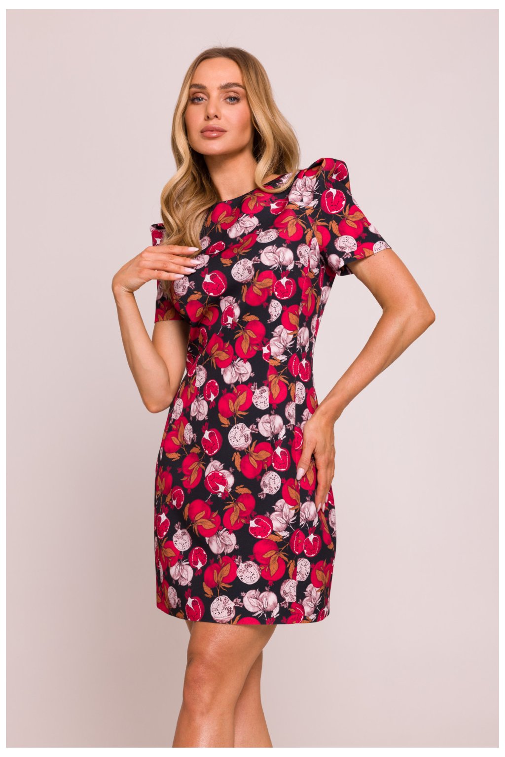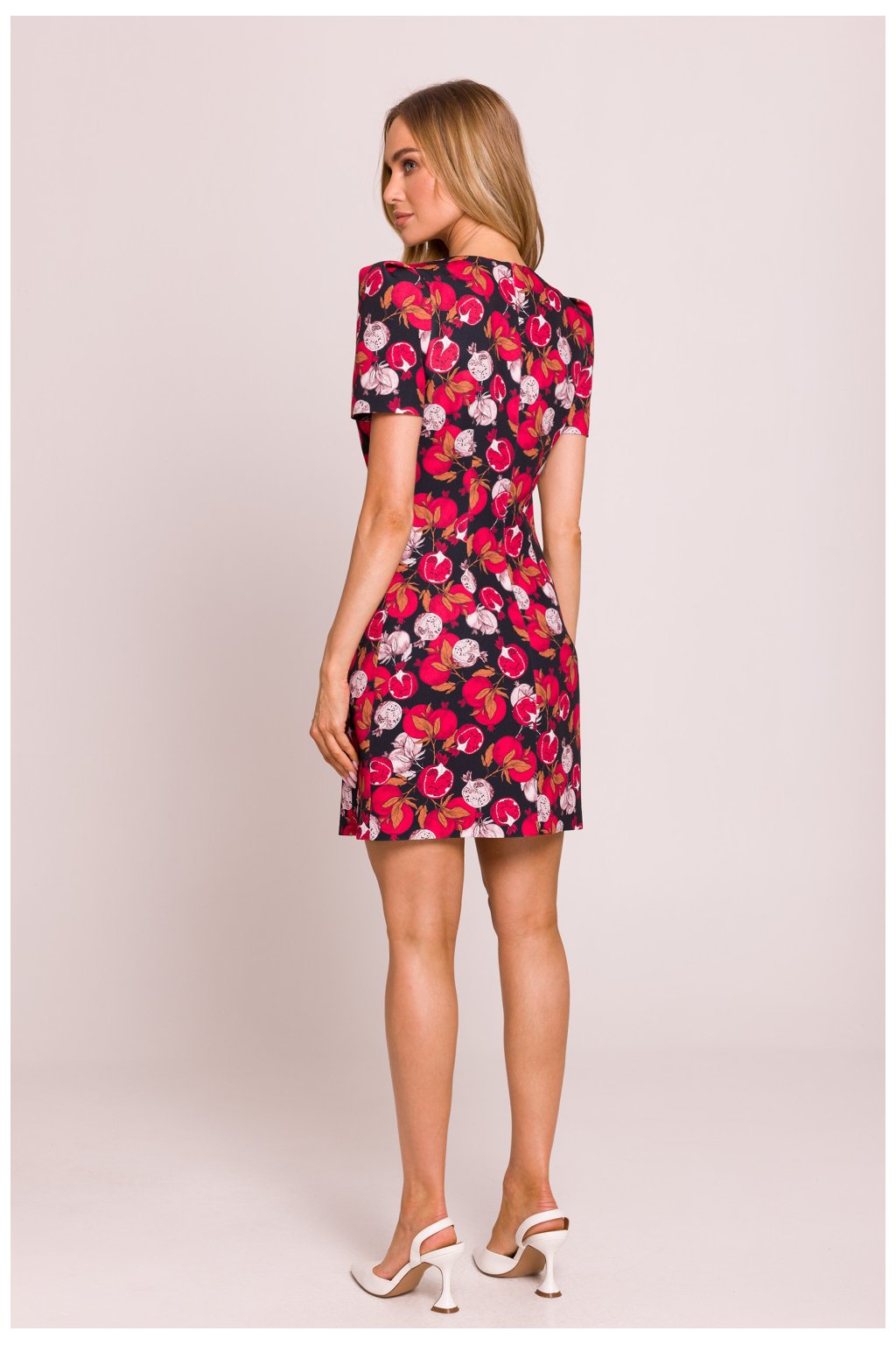 Elegantní a ženské mini šaty vyrobené z vysoce kvalitní látky s květinovým potiskem. Model zdůrazňuje pas díky jemným prošíváním a krátké rukávy na polštářcích jí dodávají výjimečný charakter. Šaty se zapínají vzadu na skrytý zip, co zajišťuje pohodlné nošení a estetické provedení. Chybějící podšívka zajišťuje, že jsou lehké a ideální na teplé dny. Celý kousek byl navržen a ušit v Polsku s důrazem na každý detail.Polyester 95 %