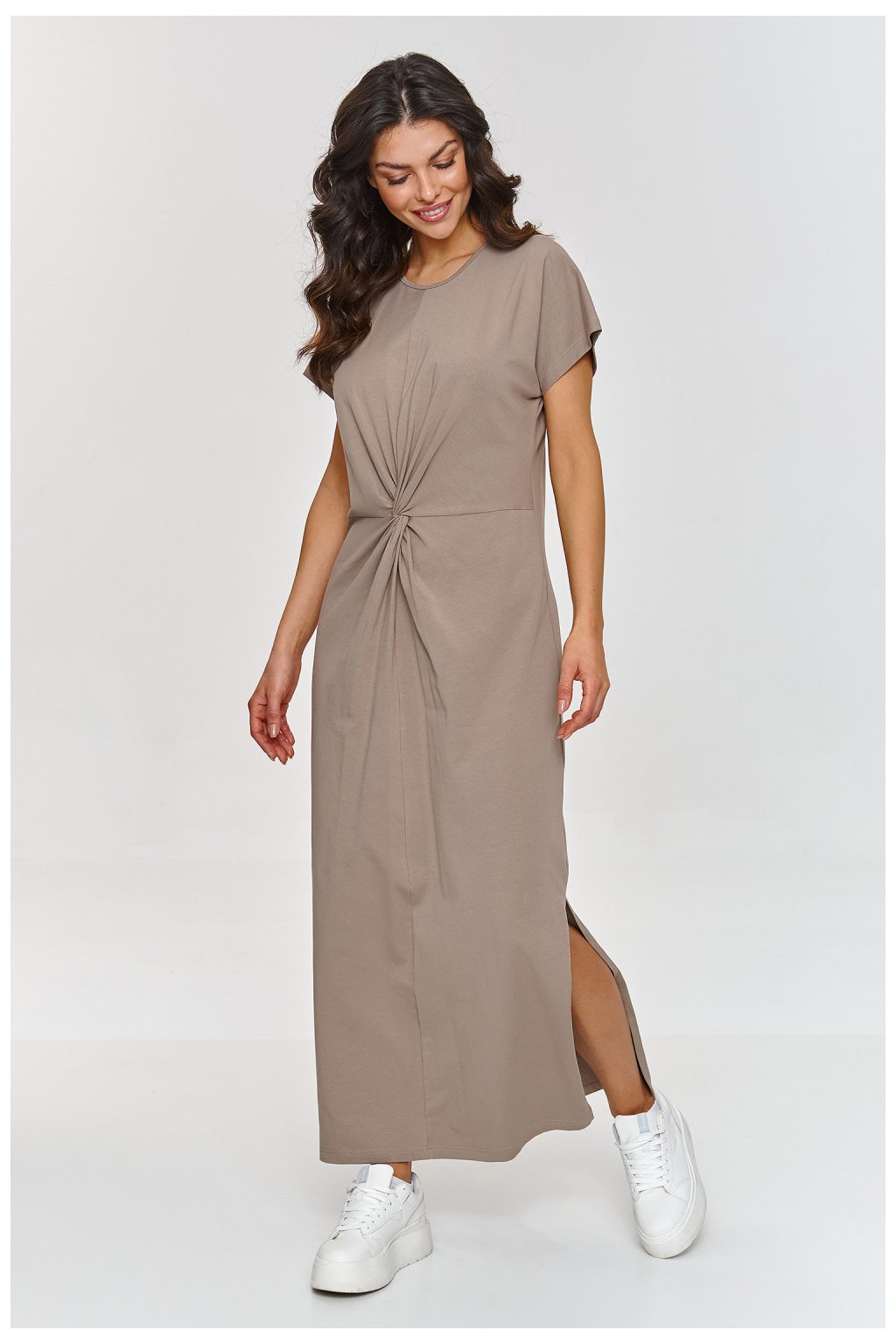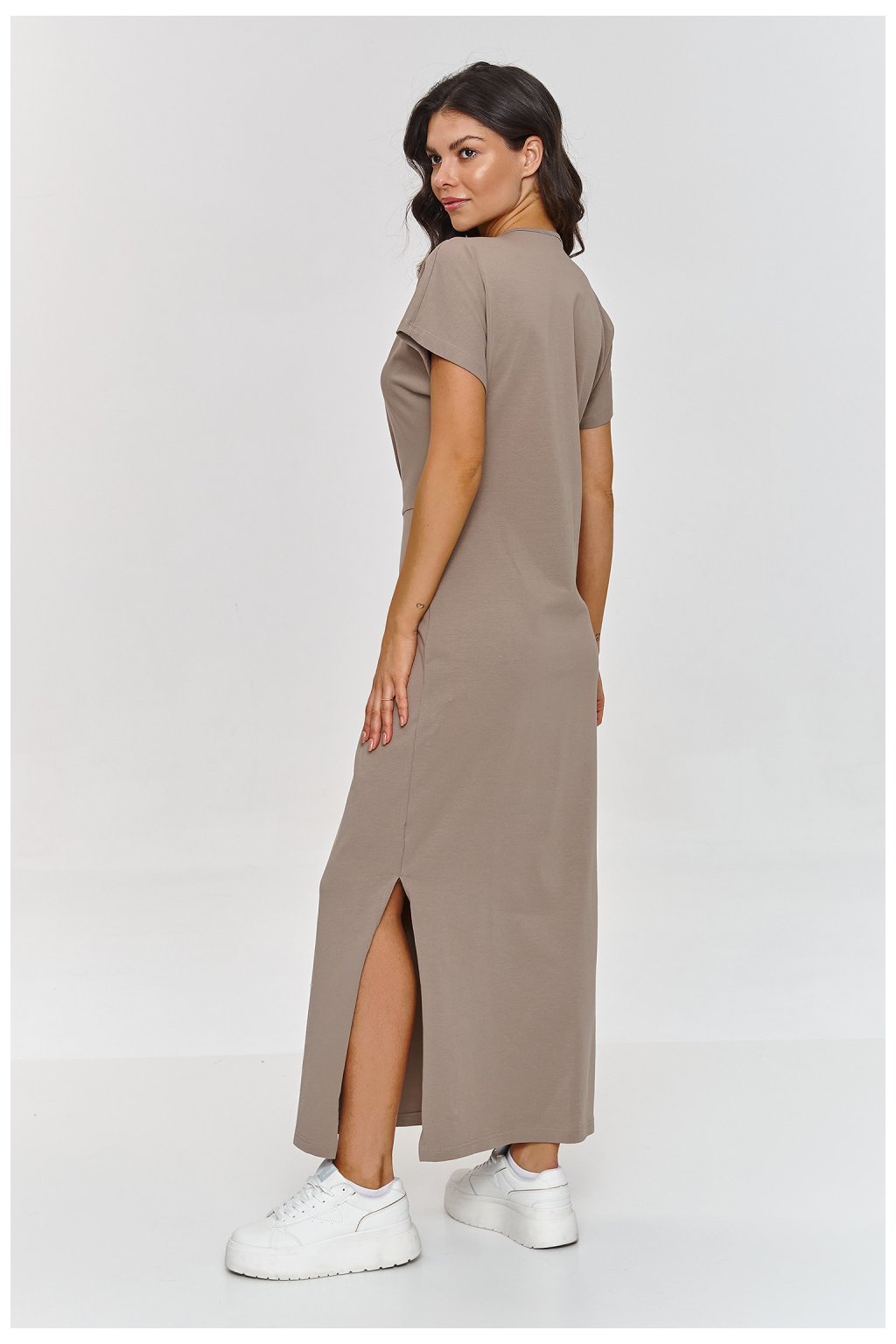 Tento maxi šaty jsou skvělou volbou pro ženy, které hledají spojení pohodlí a stylu. Model má jemné zvýraznění v pasu, které nejen zdůrazňuje ženskou siluetu, ale také jí dodává efektní design. Díky tomu vypadá celkově souvisle a stylově. Rozpark z boku jí dodává lehkost a smyslnost. Odkrývání jemných nohou do stylizace vnáší dynamický prvek a zároveň umožňuje větší volnost pohybu. Kulatý výstřih, krátký rukáv a maxi délka zdůrazňují univerzálnost celého modelu. Šaty jsou vyrobeny z lehkého, prodyšného bavlněného materiálu, ideálního na teplé dny. Díky němu může vaše kůže dýchat, poskytujíc vám pohodlí po celý den. Design spojuje v sobě minimalismus a eleganci. Díky jednoduchému střihu vypadají šaty svěže a moderně, skvěle se hodí jak do každodenních stylizací, tak na společenská setkání. Tato kreace skvěle ladí s bílými teniskami na každý den, stejně jako s elegantními sandály nebo lodičkami, vhodnými na večírky, výlety do města nebo letní procházky.Elastan 5 %