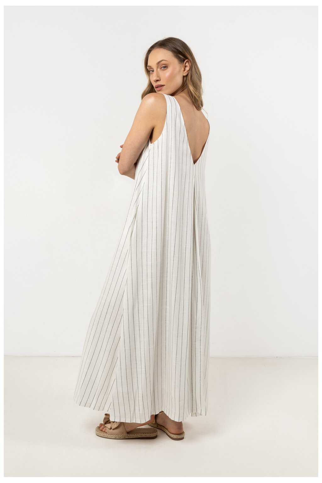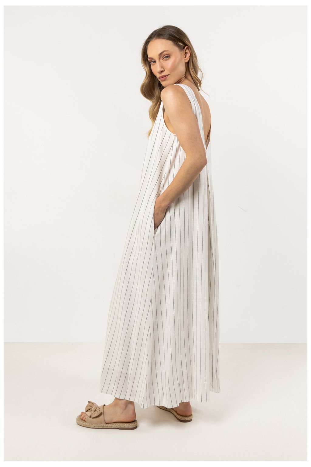 Volná, trapézová maxi šaty z jemnými pruhy Lehkost a elegance? Tyto šaty jsou ideální volbou na teplé dny. Lehce se šířící trapézový střih zaručuje volnost, a přírodní lněná tkanina zajišťuje komfort nošení. Lodičkový výstřih vpředu a odhalená záda ve tvaru písmene V dodávají jemnou smyslnost. Bavlněná podšívka zvyšuje prodyšnost, čímž činí šaty ještě pohodlnějšími.Viskóza 85 %