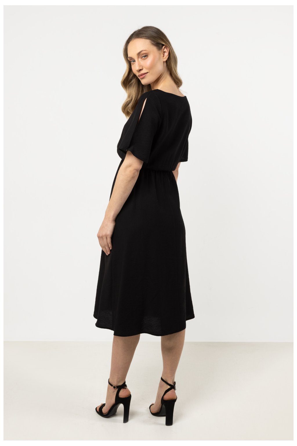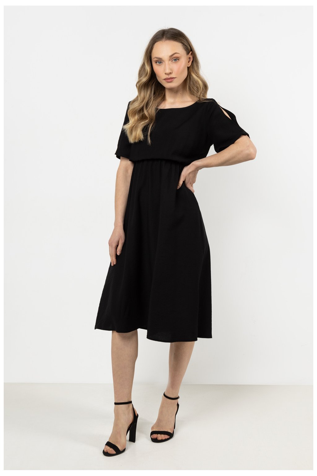 Tento šaty jsou ideální kombinací klasiky a pohodlí. Volný střih zajišťuje svobodu pohybu, zatímco guma v pase jemně zvýrazňuje pas. Krátké, rozevláté rukávy dodávají lehkost, a lodičkový výstřih elegantně vystavuje linii ramen. Je to univerzální kousek na každodenní i výjimečné příležitosti.Složení: 87% viskóza, 13% nylon