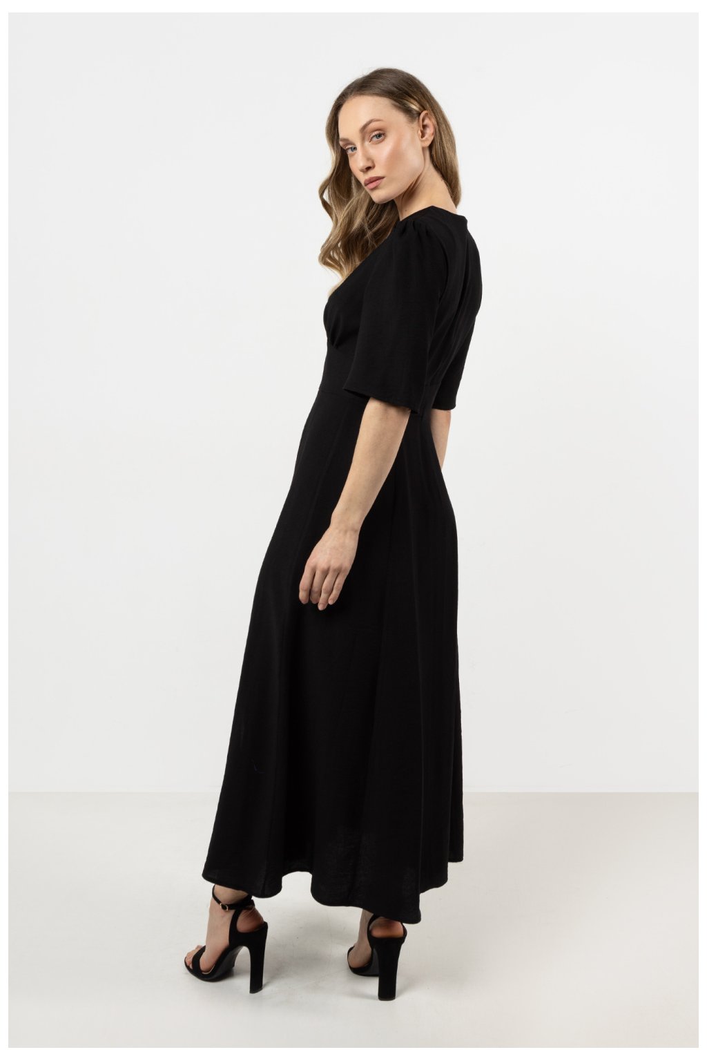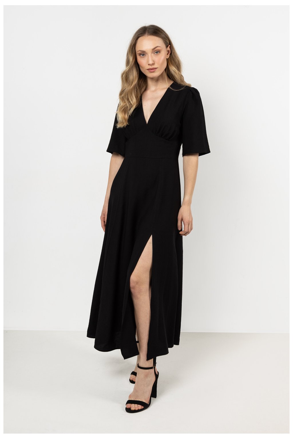 Elegantní a ženské šaty s přiléhavým střihem, ideální na elegantní události. Přední překrytý výstřih jemně zdůrazňuje poprsí a rukávy s rozparkem…