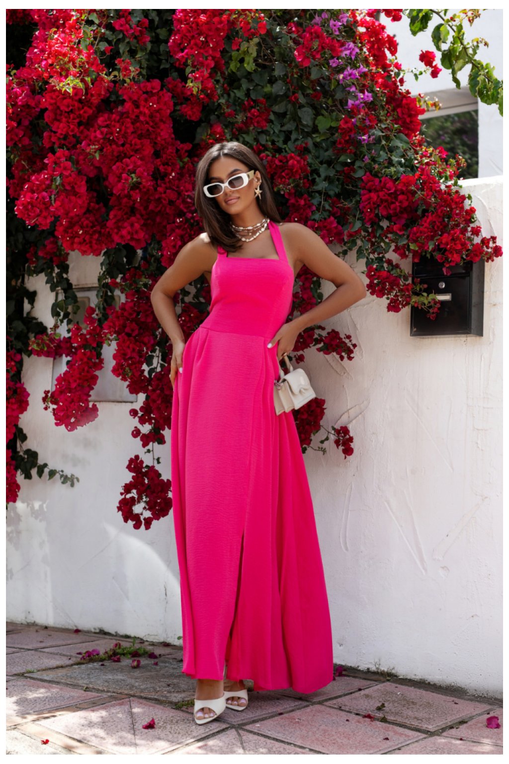 Smyslné a lehké dlouhé šaty ideální na teplé dny. Model se širokými ramínky se váže na krku a jemně zdůrazňuje ramena a výstřih, a pasem s gumou zajistí pohodlí a přizpůsobení se postavě. Zadní část přitahuje pozornost velkými výstřihy, které efektně odhalují záda, přidávají letní charakter a ženskou lehkost. Dalším akcentem je rozštěp vpředu sahající nad koleno, který šatě dodává volnost pohybu a trochu drápů. Skvělá volba na dovolenou, plážovou procházku nebo letní večírek. Délka šatů je měřena od pazuchy.Viskóza 95 %
