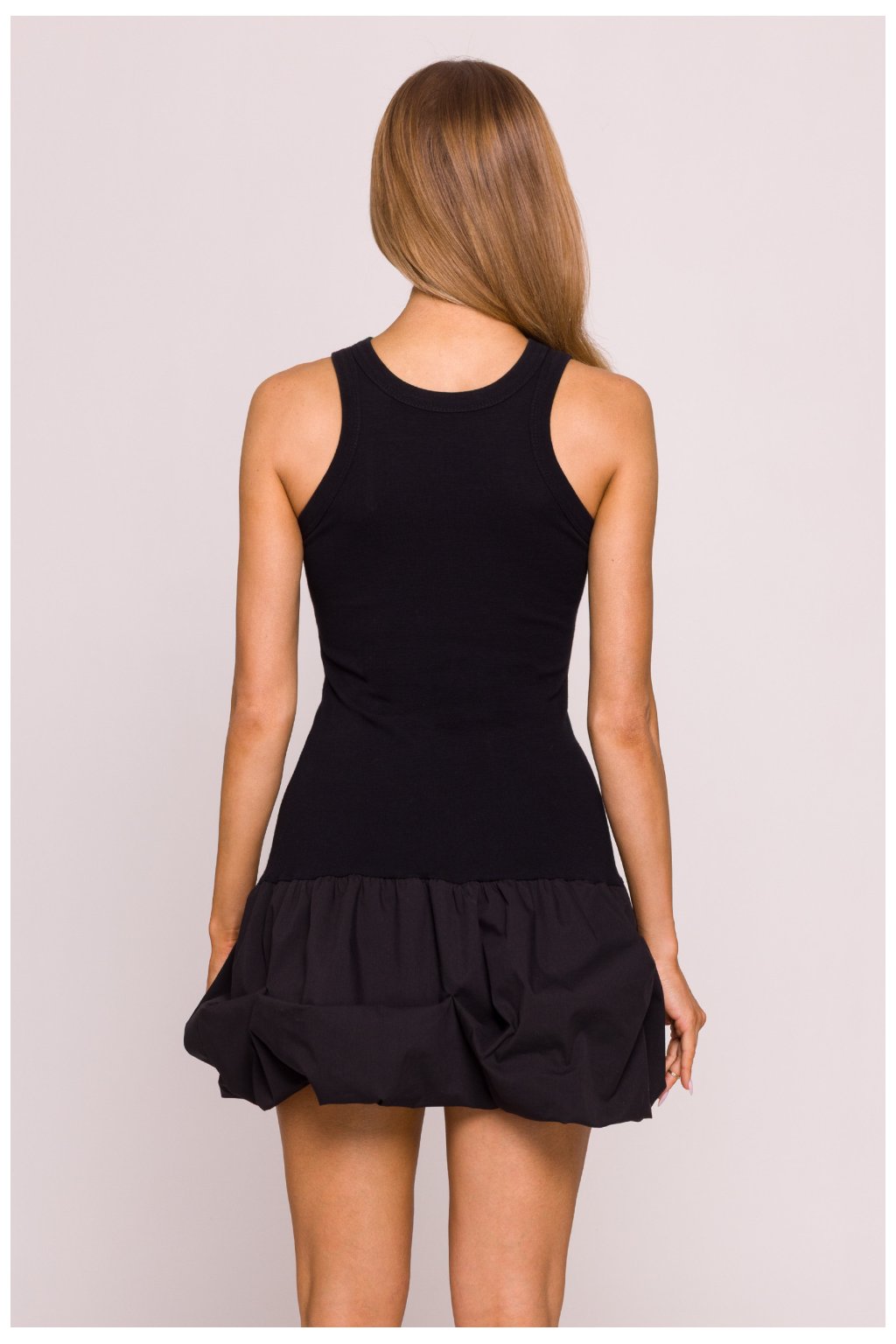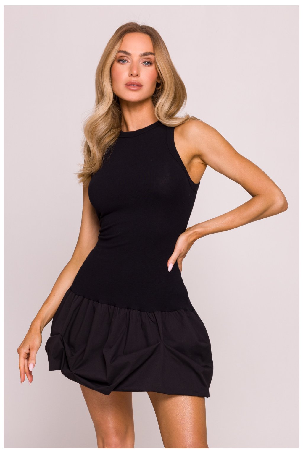Moderní šaty s kontrastním střihem, které spojují pohodlí a styl. Horní část je vyrobena z měkké, prodyšné bavlněné pleteniny, která se přizpůsobí postavě jako tílko s širokými ramínky a vysokým, kulatým výstřihem. Spodek je ušitý z pevné košilové látky, která mu dodává efektní objem ve tvaru krátké, rozkvetlé ?bomby?. Šaty nemají kapsy ani zapínání, snadno se oblékají přes hlavu. Trup ve tvaru písmene X a balonový, miniaturizovaný spodek vytvářejí zajímavou kombinaci sportovní funkčnosti s ženskou formou. Navrženo a ušito v Polsku s ohledem na moderní siluety a originální styl. Horní část: 95% bavlna, 5% elastan Spodek: 55% nylon, 42% bavlna, 3% spandexVelikost | Délka | Obvod beder | Obvod prsou | Obvod v pase |
