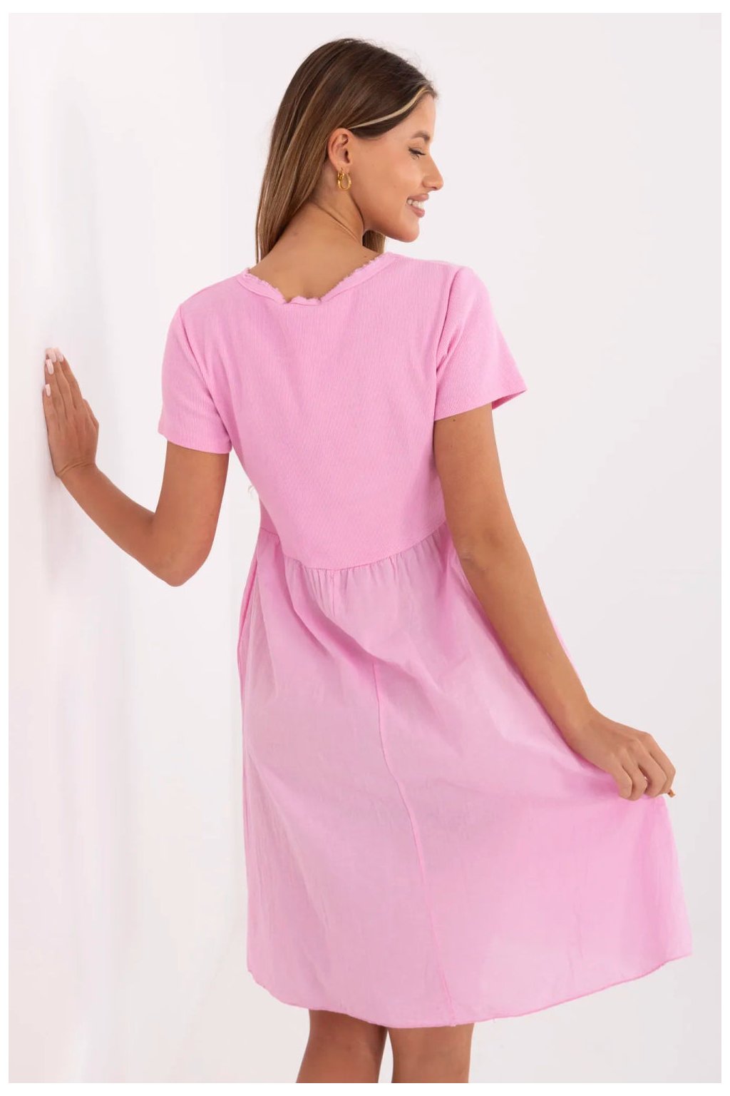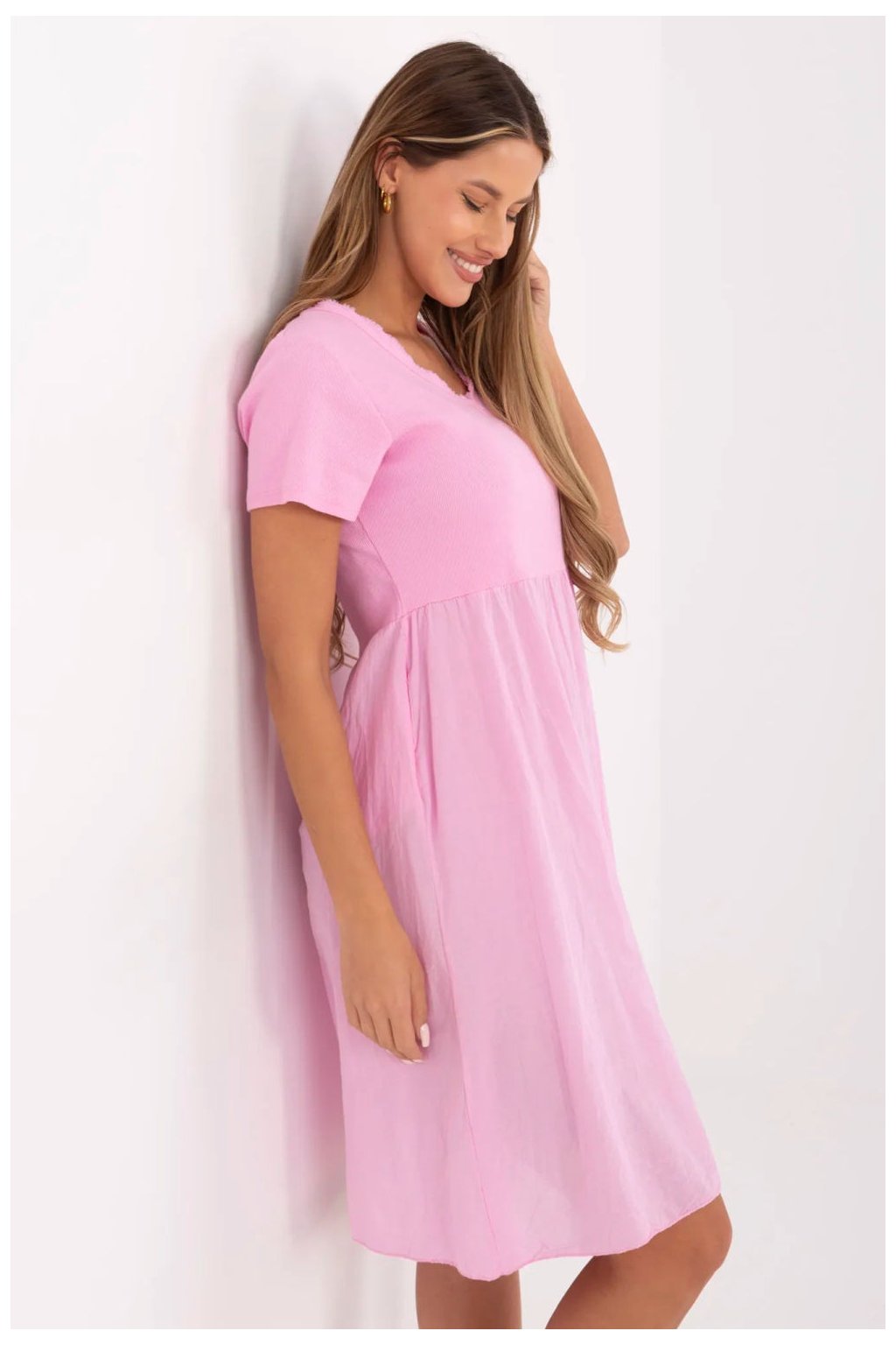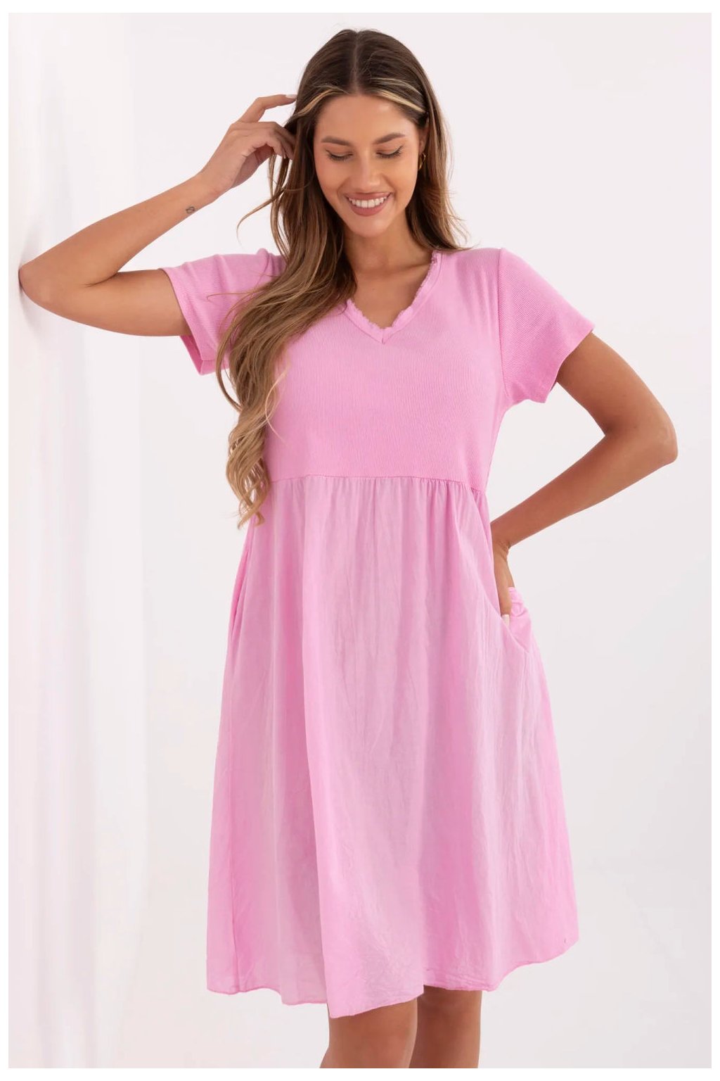 Tato letní, rozklosaná šaty jsou ideální volbou pro každodenní stylizace pohodlné, ženské a univerzální. Vyrobené z směsi bavlny a elastanu, poskytují prodyšnost a pružnost, díky čemuž se skvěle přizpůsobují postavě. Horní část šatů je vyrobena z pruhované látky, která jemně zdůrazňuje tvary a přidává subtilní strukturu celku. Hladký vzor dělá šaty klasické, minimalistického charakteru, snadno stylizovatelné různými způsoby. Model přes koleno, s krátkým rukávem a výstřihem do srdce, krásně zdůrazňuje krk a opticky zúžuje postavu. Další výhodou jsou praktické kapsy skryté v bocích, ideální na drobné předměty nebo jen pro pohodlí. Jsou to skvělé šaty na letní dny lehké, pohodlné a stylové, které se hodí jak na procházky, setkání s přáteli, tak i na každodenní povinnosti.Elastan 5 %