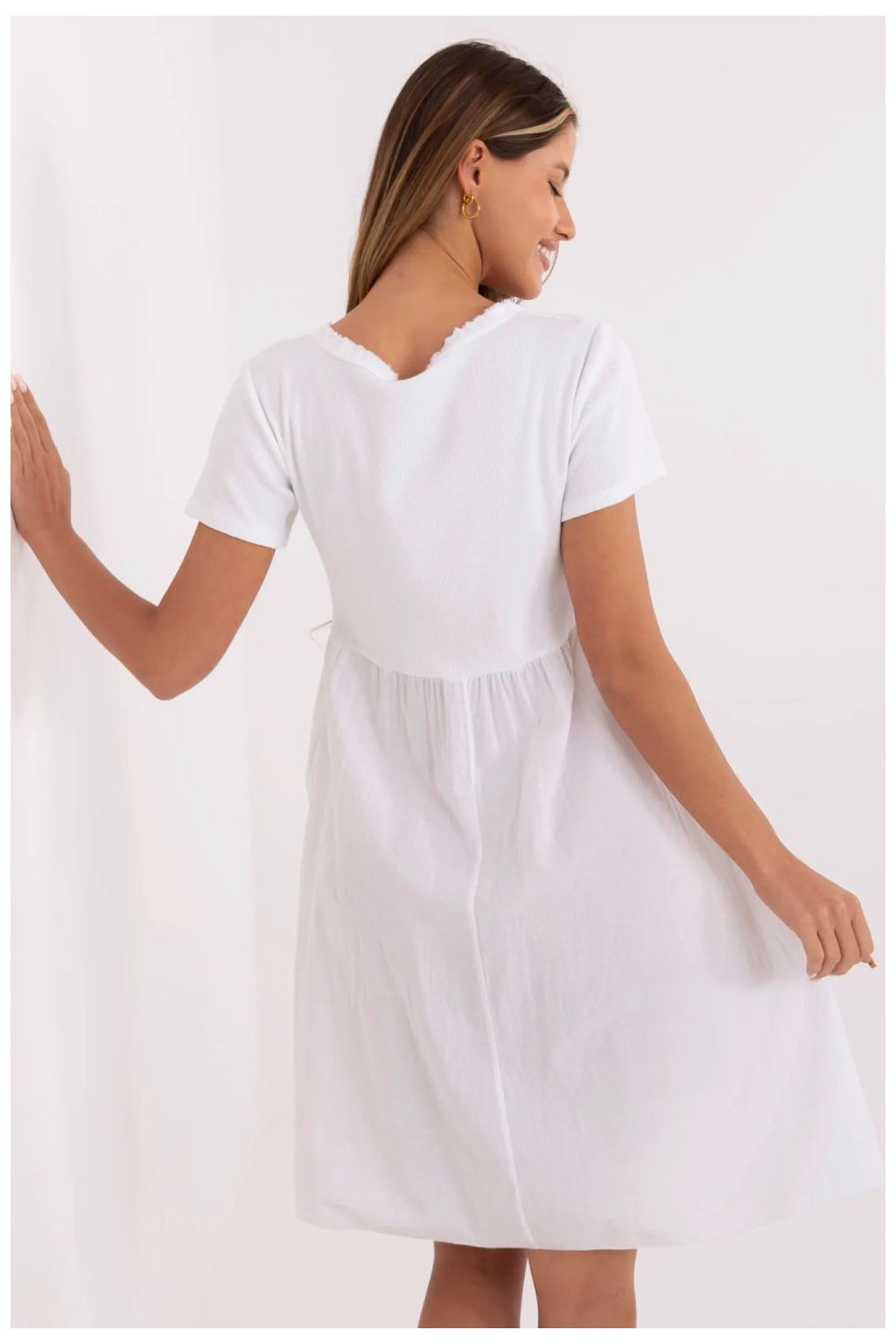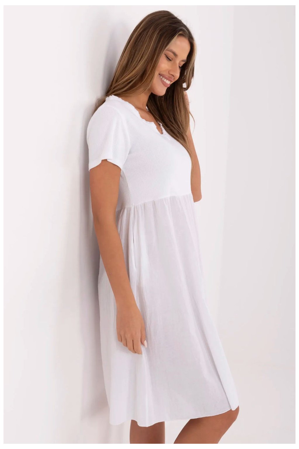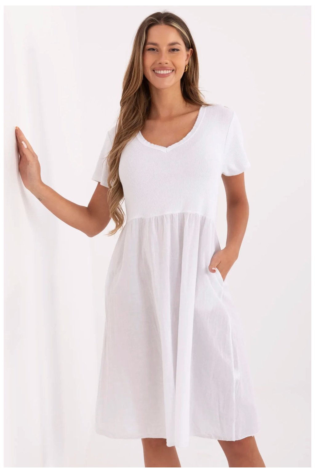 Tato letní, rozklosané šaty jsou ideální volbou pro každodenní stylové a pohodlné oblečení. Jsou vyrobeny z směsi bavlny a elastanu, což zajišťuje prodyšnost a pružnost a skvěle se přizpůsobují postavě. Horní část šatů je vyrobena z pruhované látky, která jemně zdůrazňuje tvary a dodává celku jemnou strukturu. Hladký vzor dává šatům klasický, minimalistický charakter, který lze snadno kombinovat různými způsoby. Model po kolena s krátkým rukávem a výstřihem do šípku krásně zdůrazňuje krk a opticky zúží postavu. Další výhodou jsou praktické kapsy skryté v bočních švech, ideální pro drobné věci nebo pro pohodlí. Jsou to skvělé letní šaty, lehké, pohodlné a stylové, které se hodí jak na procházky, setkání s přáteli, tak i na každodenní nošení.Elastan 5 %