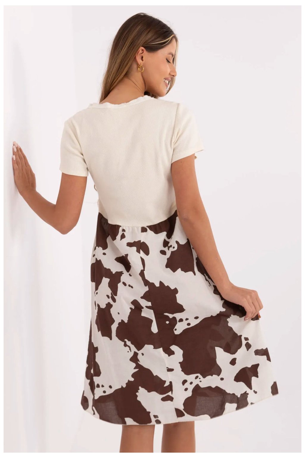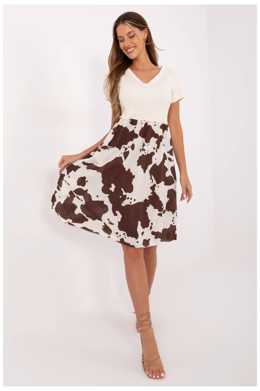 Tato letní, rozklosané šaty jsou kombinací pohodlí, stylu a originálního designu. Vyrobené z prodyšné směsi bavlny a elastanu, skvěle poslouží každý den, jak ve městě, tak během letní dovolené. Horní část šatů je vyrobena z pruhované látky, která jemně kopíruje postavu, zdůrazňující její přednosti. Výstřih do srdce a krátké rukávy dodávají celku lehkost a ženský půvab. Spod šatů zdobí originální zvířecí motiv, který dodává charakter a prolomuje klasický, hladký vrch. Model po kolena není jen stylový, ale i funkční, má praktické kapsy skryté v bocích švů, které zvyšují pohodlí nošení. Tyto šaty jsou ideální na každodenní výlety, kombinují jednoduchost s trochou divokého akcentu, vytvářejí tak výjimečný návrh pro ženy, které ocení pohodlí a módní vzhled.Elastan 5 %