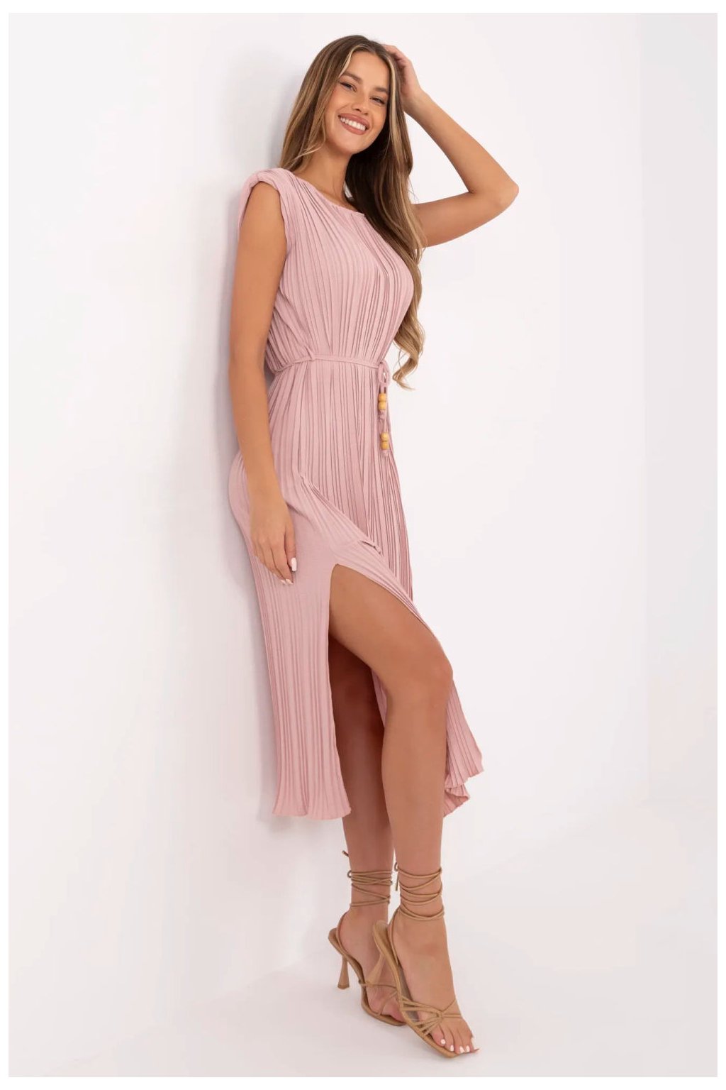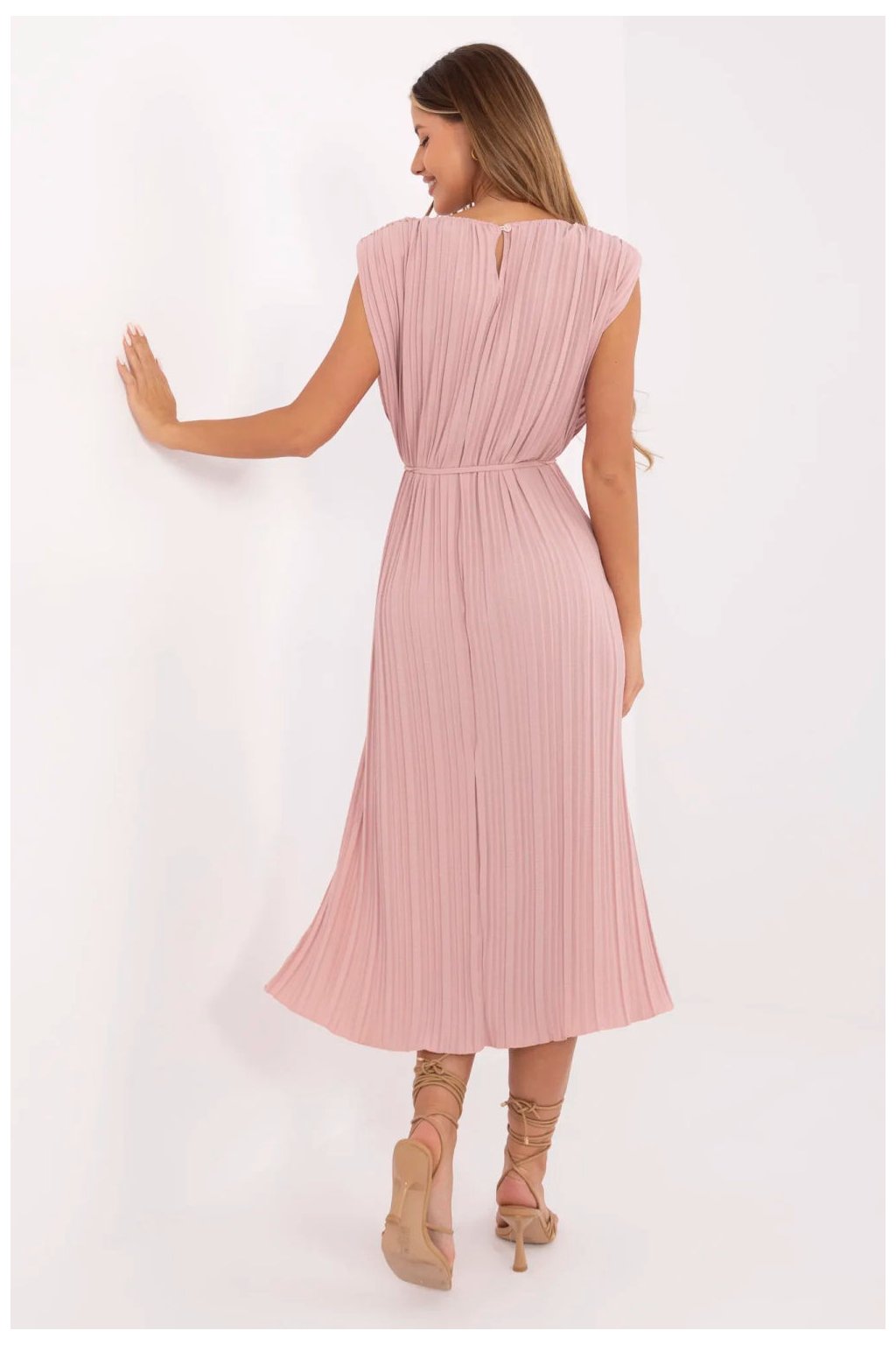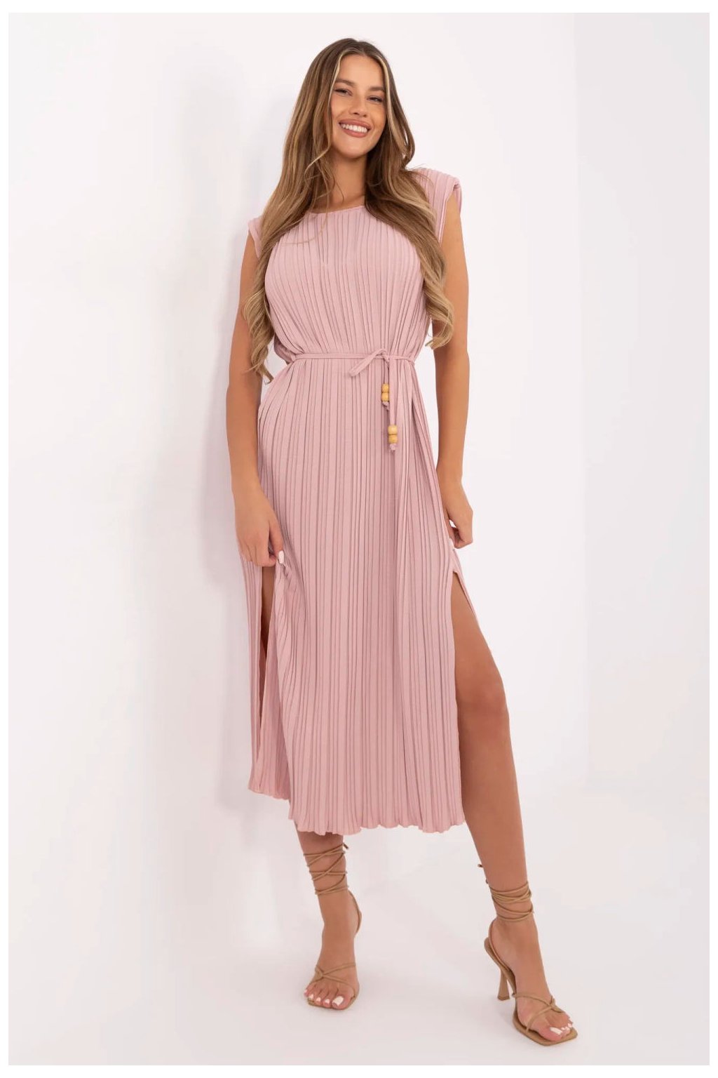 Moderní a stylové letní šaty s rozšířeným střihem jsou skvělou volbou na každodenní příležitosti. Vyrobené z lehké směsi viskózy a polyesteru, okouzlují měkkým, plisovaným materiálem, který se krásně ukládá při pohybu a dodává postavě lehkost. Midi model bez rukávů se skvěle hodí na teplejší dny. Vložené polštářky na ramenou dodávají konstrukci šatů výraz a moderní, lehce drzý charakter, zároveň opticky vyvažují proporce postavy. Kulatý výstřih dodává celku klasického šarmu. Šněrování v pasu umožňuje zdůraznit pas, dodávajíc ženského tvaru, a rozparky po stranách na spodní části šatů přidávají volnost a jemně odhalují nohy během pohybu. Hladký vzor činí šaty univerzálními a snadno stylizovatelnými, ideální jak na procházku, do práce, tak i na nezávazná setkání v letní dny. Materiál je pružný.Viskóza 70 %