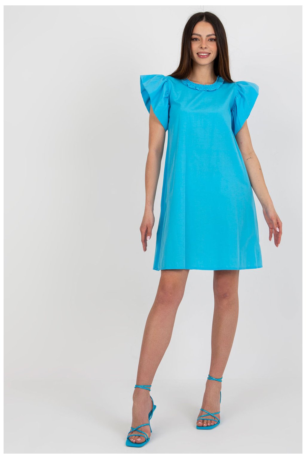 Letní šaty s rozkročeným střihem jsou ideální volbou na teplé dny jak do práce, tak i na každodenní nošení. Vyrobené z prodyšné bavlny, poskytují pohodlí a volnost pohybu po celý den. Model sahající po kolena vypadá žensky a lehce, a jemné detaily mu dodávají šarmu. Krátké rukávy ve formě volánků dávají šatům romantický charakter, a kulatý výstřih s jemným volánem zdůrazňuje jejich jemný styl. Bez zapínání jsou tyto šaty neuvěřitelně pohodlné a snadno se oblékají. Hladký vzor dělá tyto šaty univerzální a snadné na styling, skvěle ladí s lehkými sandály, baletkami nebo kabelkou typu košík. Jsou to must-have v letním šatníku každé ženy.| Velikost | Obvod prsou | Obvod v pase |