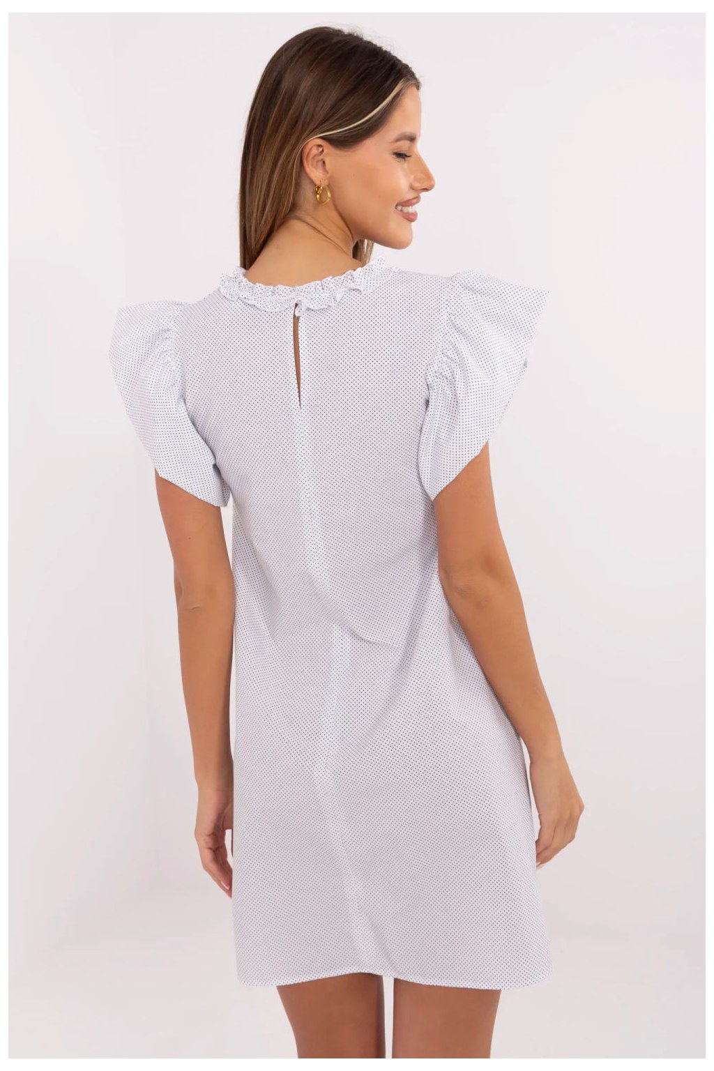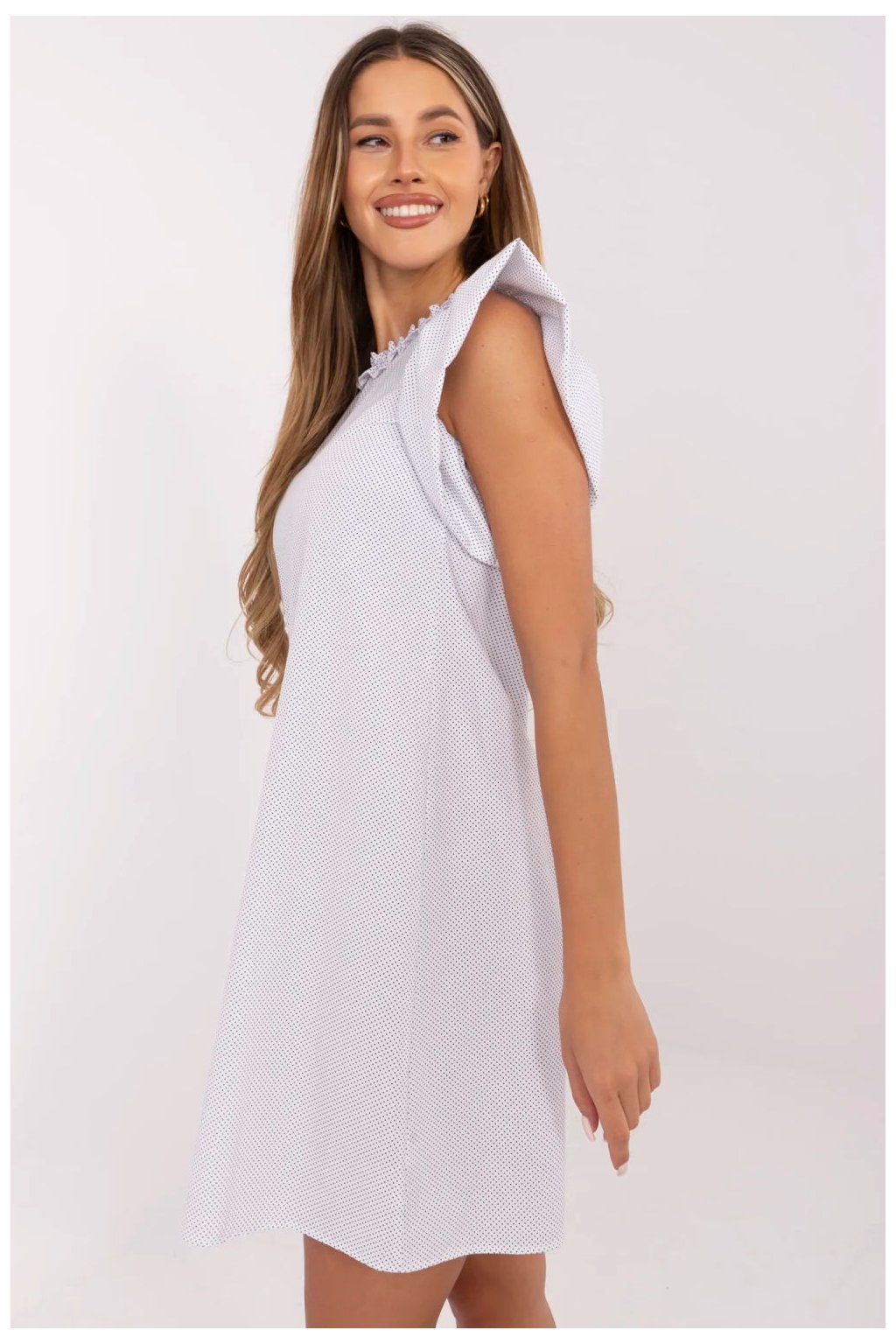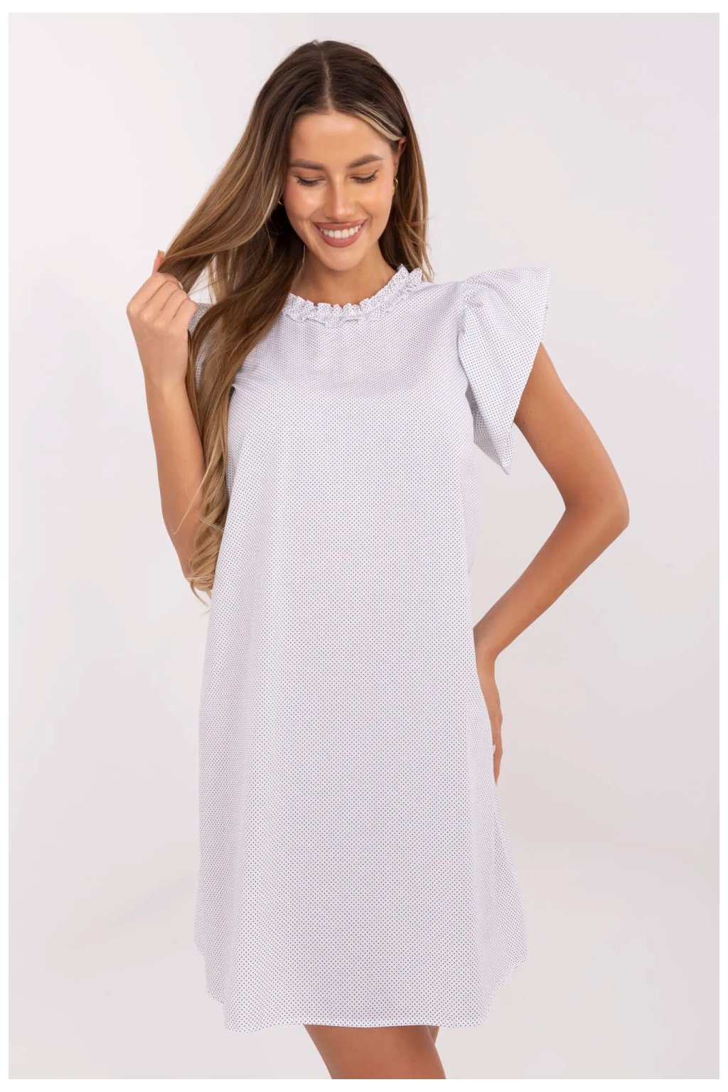 Letní šaty s rozšířeným střihem a drobnými puntíky jsou ženským a stylovým návrhem na teplé dny. Vyrobena z prodyšné bavlny, zaručuje pohodlí nošení a volnost pohybů, skvěle se hodí jak do každodenního stylu, tak i do práce. Model před kolena nádherně padne na postavu, zdůrazňuje pas a dodává lehkost celému outfitu. Krátké rukávy ve formě volánků a kulatý výstřih s decentním volánem přidávají šatě romantický a dívčí půvab. Bez zapínání zajišťuje pohodlí a snadné oblékání. Jemný vzor s drobnými puntíky dodává celku svěžest a nadčasový charakter. Je to skvělá volba na léto, stačí přidat sandály nebo baletky a vytvořit lehký a stylový vzhled.| Velikost | Obvod prsou | Obvod v pase |