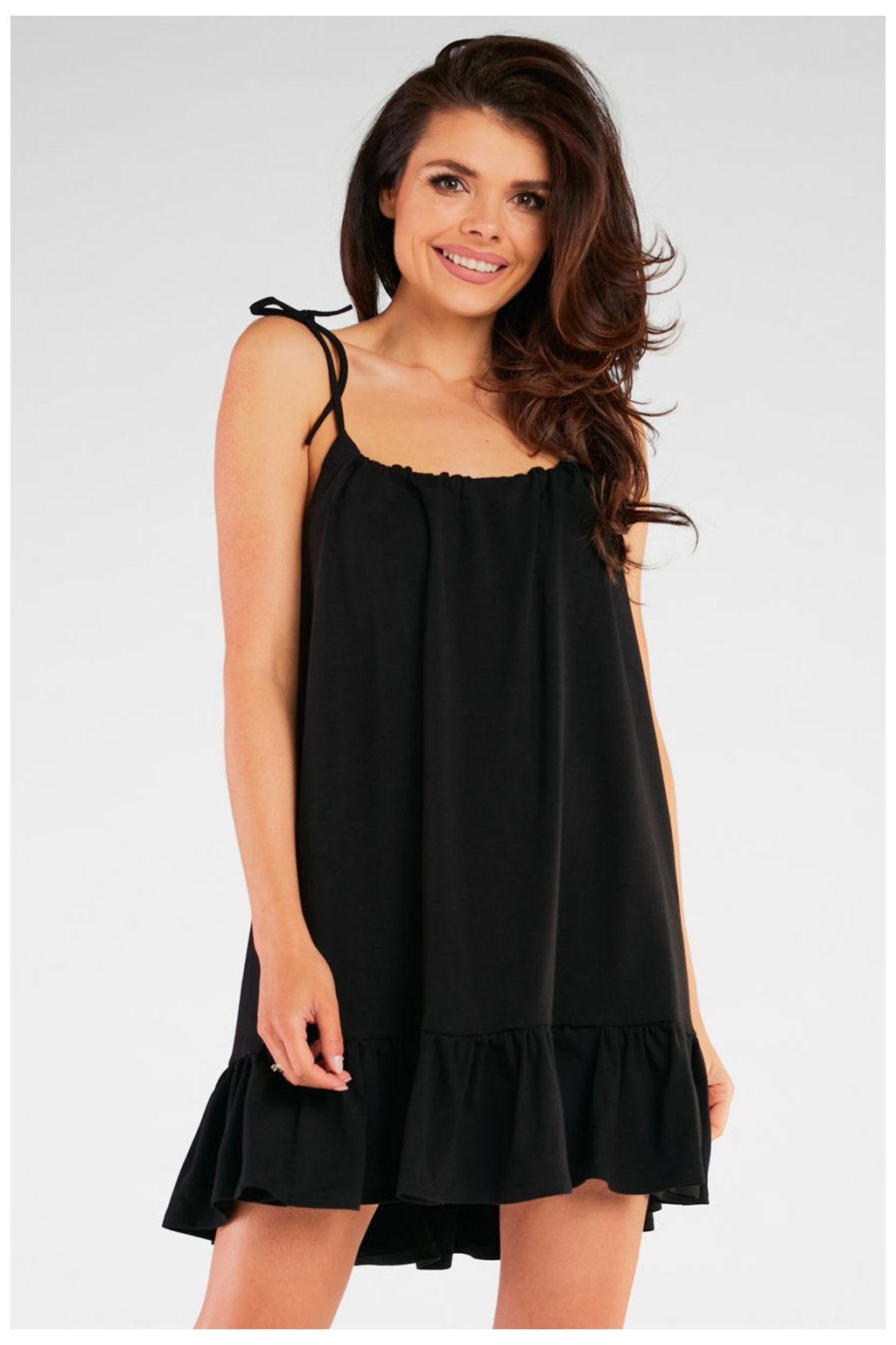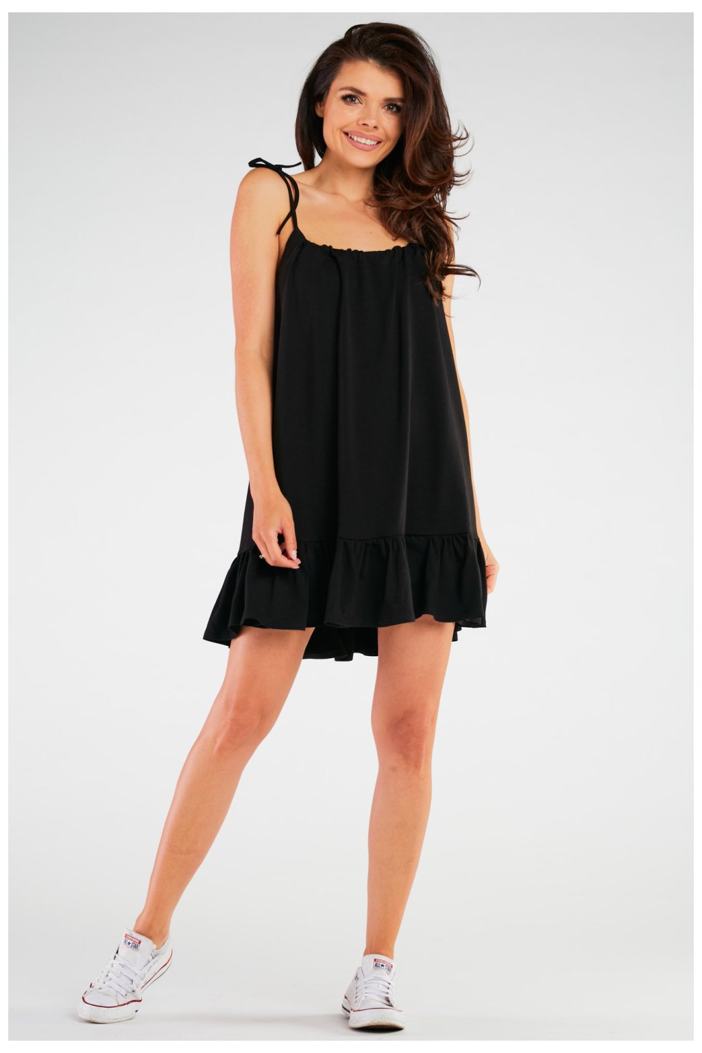 Letní šaty z měkké pleteniny. Model rozšiřovaný ke dnu zakrývá drobné nedokonalosti postavy a je skvělou volbou pro těhotné ženy. Šaty jsou dokončeny volánem, který přidává dívčí charakter celku. Navrženo a ušito v Polsku.Lycra 8 %