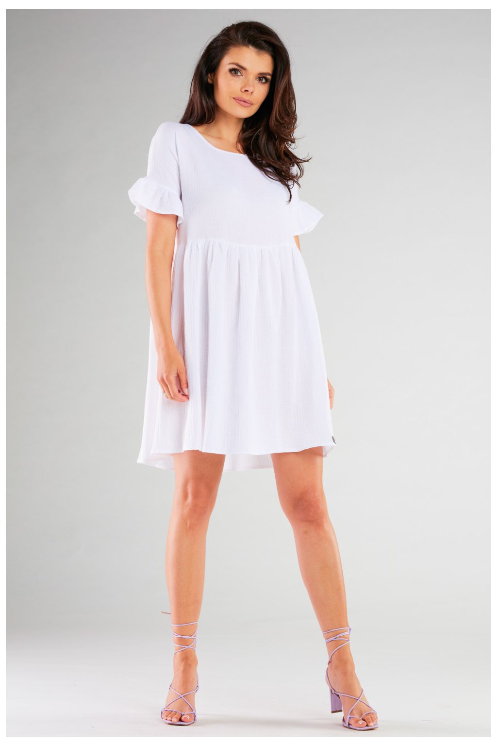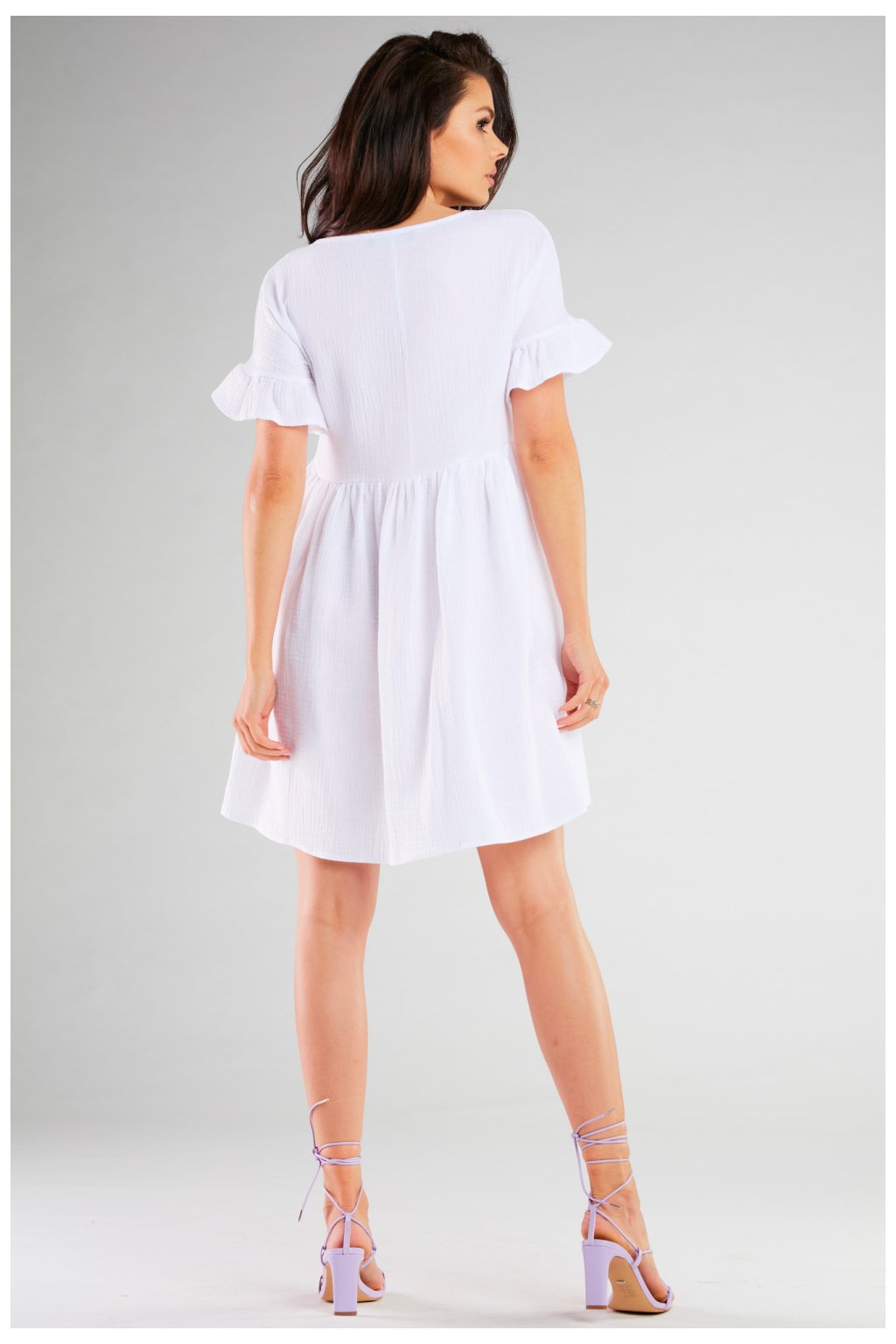 Šaty jsou vyrobeny hlavně z bavlny s malým přídavkem elastanu. Materiál je velmi pružný a umožňuje pokožce volně dýchat. Model s krátkým rukávem je ideální volbou na jaro a léto. Šaty s rozkročeným střihem skvěle zakrývají drobné nedokonalosti postavy. Navrženo a ušito v Polsku.Lycra 8 %