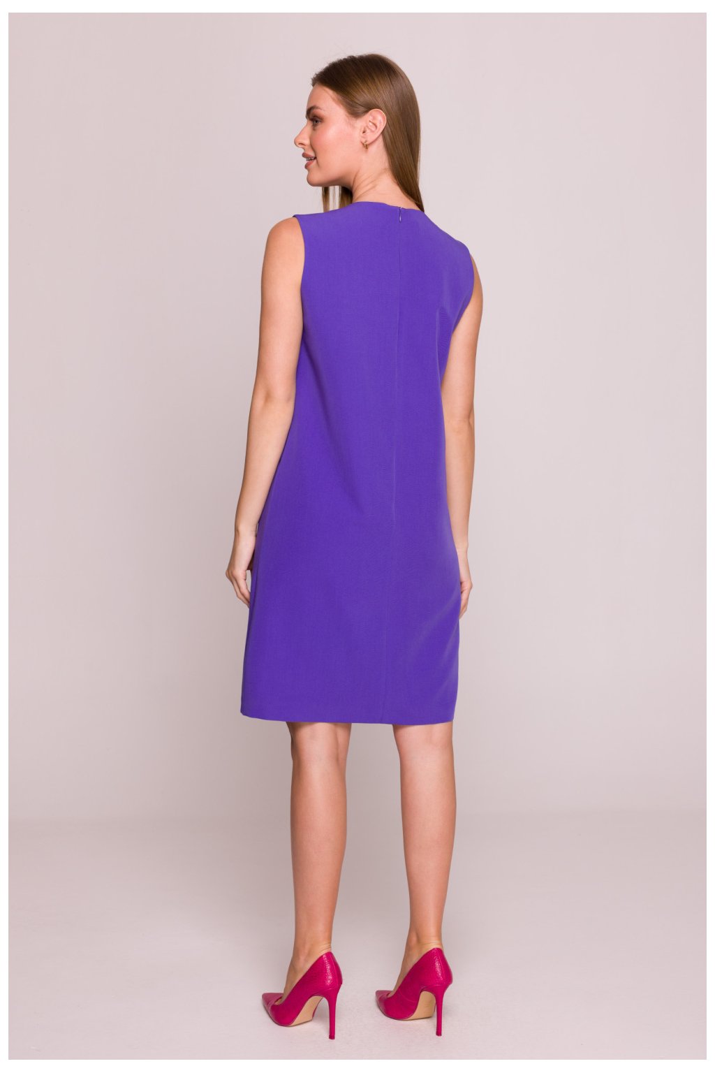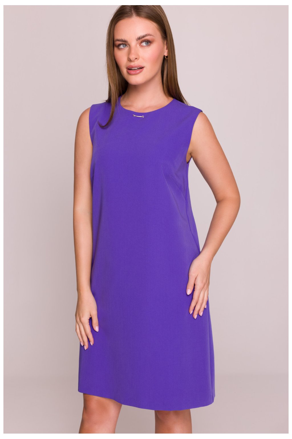 Elegantní šaty vyrobené z hladké, lehce elastické látky s saténovým povrchem, který jemně leskne a dodává celku výjimečný charakter. Model s kulatým výstřihem pod krkem zdobený kovovým detail, který dodává jemnou eleganci. Šaty bez rukávů, zapínající se na skrytý zip vzadu, co zajišťuje pohodlí nošení a minimalistický vzhled. Střih je rovný, trapezový, volný a neopínavý na postavu, ideální na každý den a do kanceláře. Šaty mají podšívku, která zvyšuje pohodlí a odolnost oblečení. Délka před koleno zdůrazňuje ženskou siluetu a zároveň poskytuje volnost pohybu. Navrženo a ušito v Polsku.Polyester 65 %