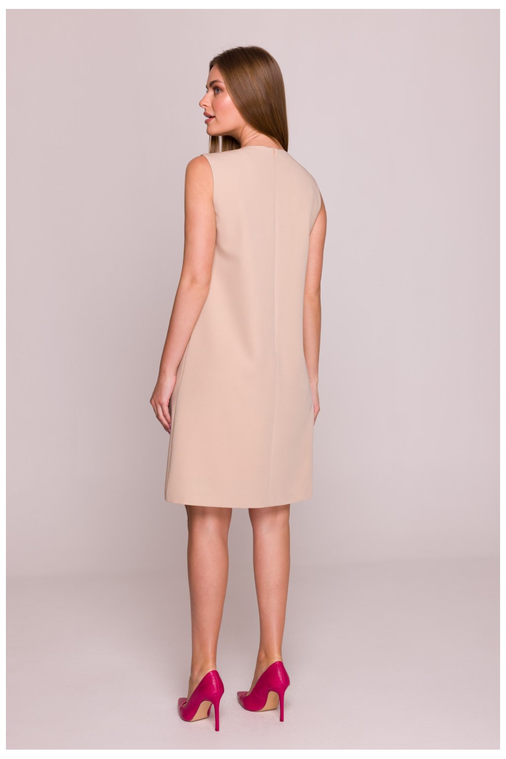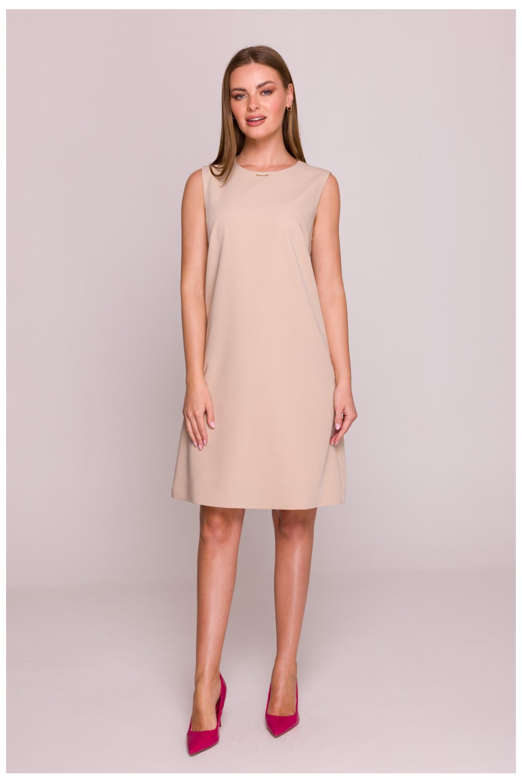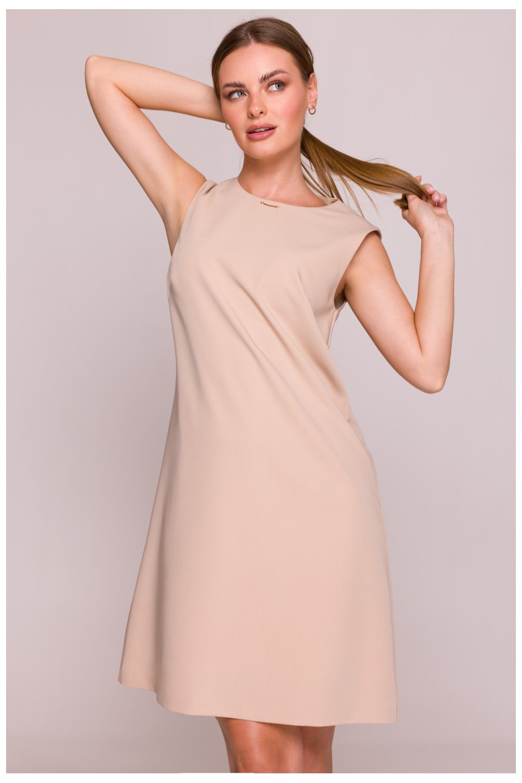 Elegantní šaty vyrobené z hladké, lehce elastické látky s saténovým zpracováním, které jemně leskne a dává celku výjimečný charakter. Model s kulatým výstřihem na krk zdobený kovovým prvkem, který dodává jemnou eleganci. Šaty bez rukávů se zapínáním na skrytý zip vzadu, co zajišťuje pohodlí nošení a minimalistický vzhled. Střih je jednoduchý, trapézový, volný a nesedící na postavě, ideální na každý den a do kanceláře. Šaty mají podšívku, která zvyšuje pohodlí a odolnost oblečení. Délka před koleno zdůrazňuje ženskou siluetu a zároveň zajišťuje volnost pohybů. Navrženo a ušito v Polsku.Polyester 65 %