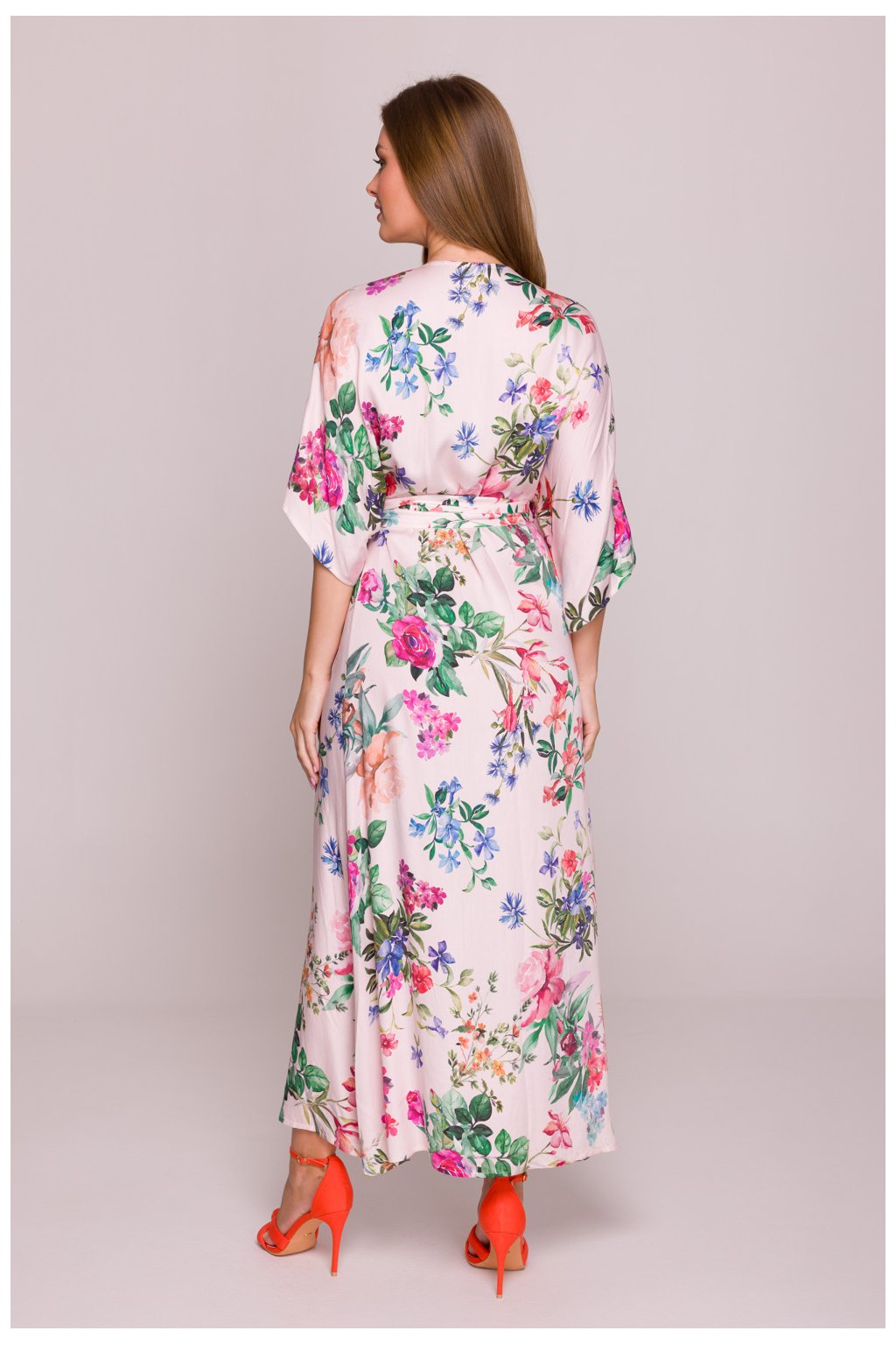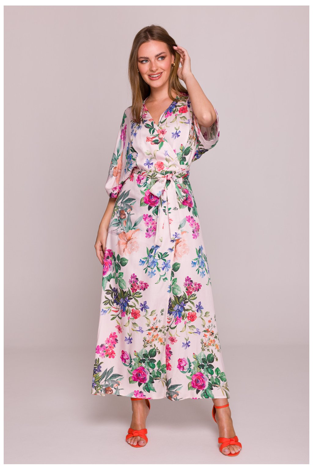 Tato lehká šaty jsou vyrobeny z lehké, prodyšné viskózy zdobené jemným květinovým vzorem, který dodává romantický charakter. Volný střih s rozšířeným dnem a vázáním v pase umožňuje pohodlné přizpůsobení a zdůraznění postavy. Výstřih ve tvaru písmene V decentně zdůrazňuje krk, a volné rukávy sahající po loket zajišťují pohodlí a volnost pohybu. Šaty nemají podšívku ani kapsy, co zdůrazňuje jejich lehkost a přirozený styl. V přední části je efektní rozparek, který dodává celku eleganci a lehkost. Navrženo a ušito v Polsku, ideální na teplé dny, jak do každodenního života, tak na speciální příležitosti.| Velikost | Délka | Obvod beder | Obvod v pase |