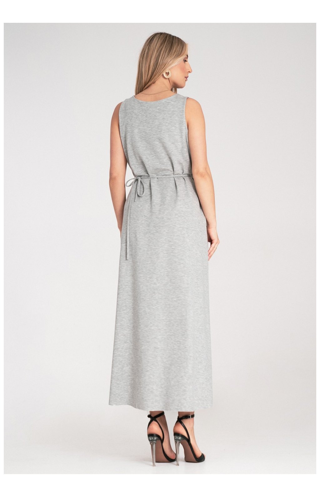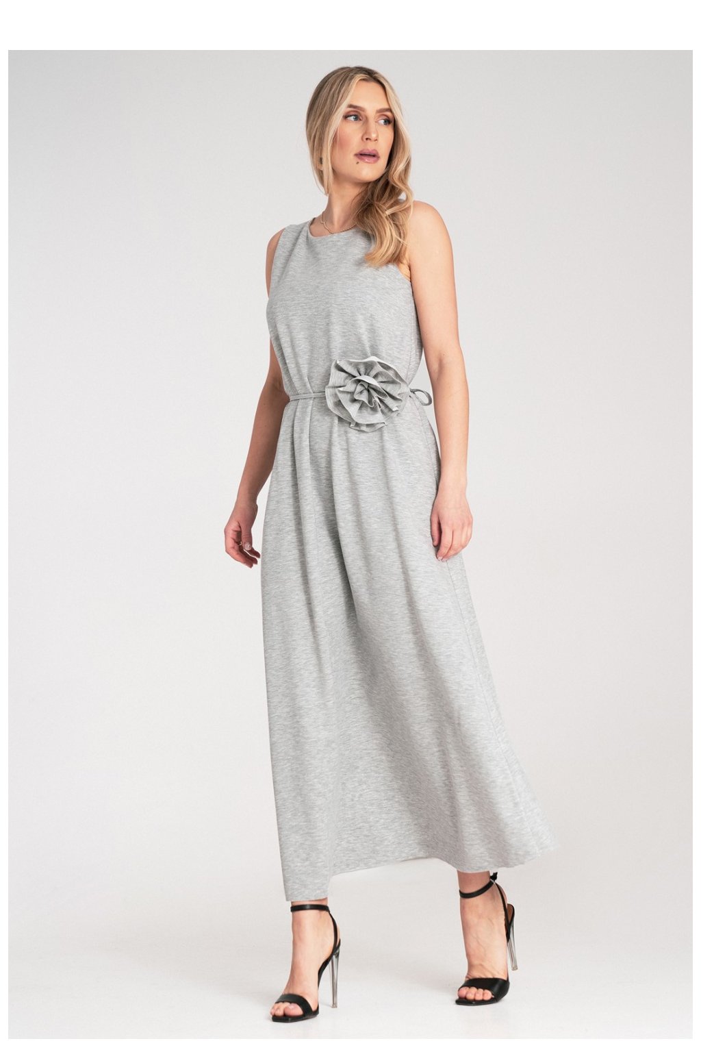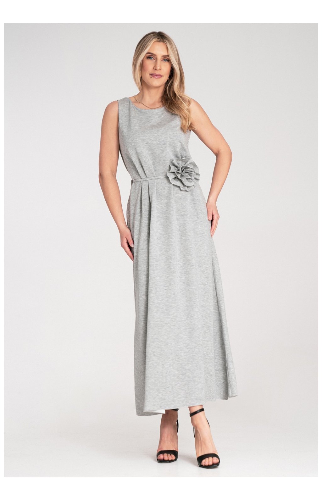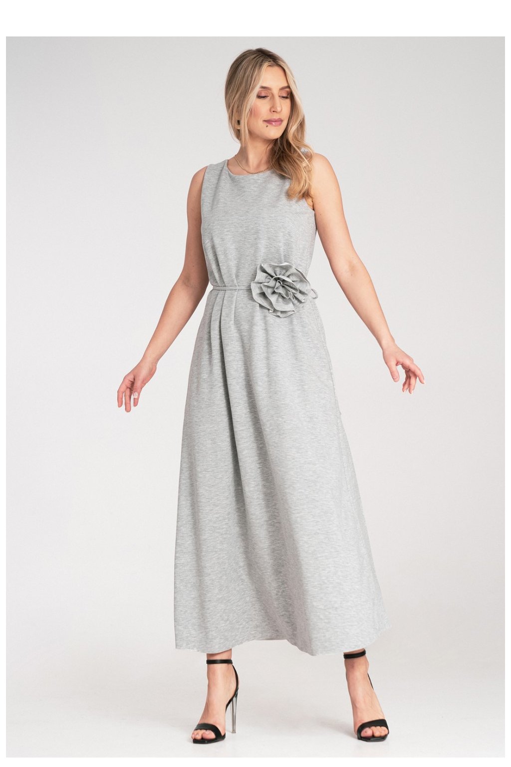 Maxi šaty bez rukávů s kulatým výstřihem a rovným vrškem. V pasu tenký pásek s ozdobným květem ze stejné látky. Spodek volný, lehce rozšířený, vyrobený z hladké, měkce padající pleteniny.Polyester 42 %