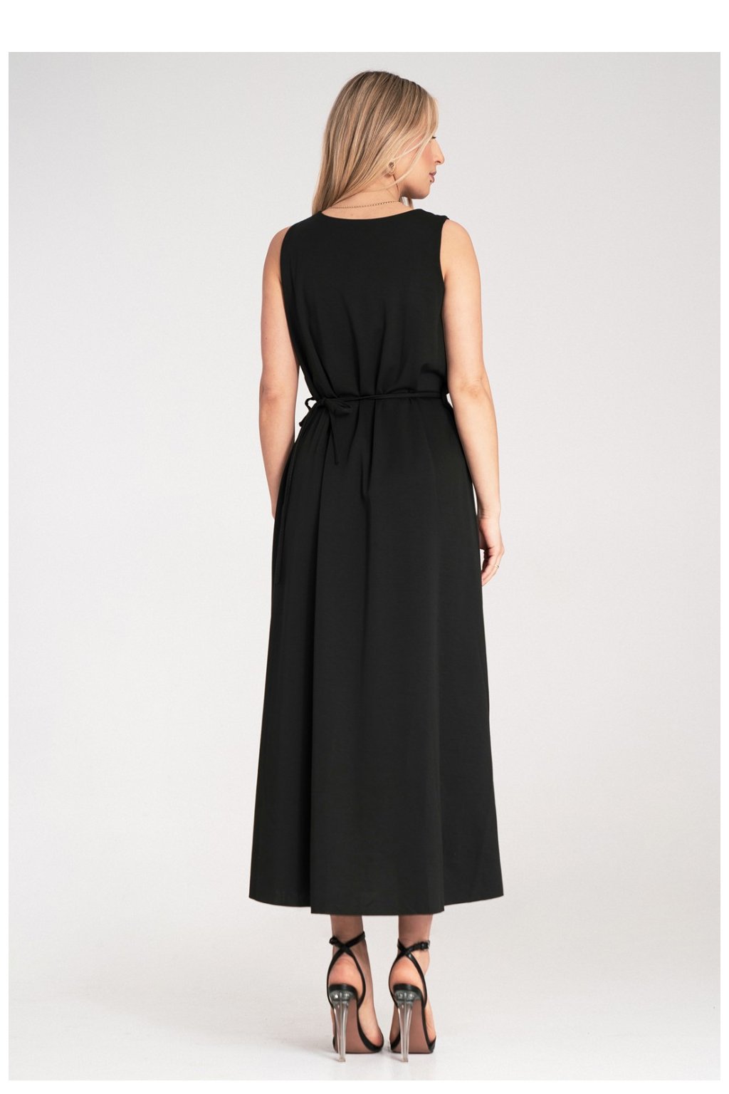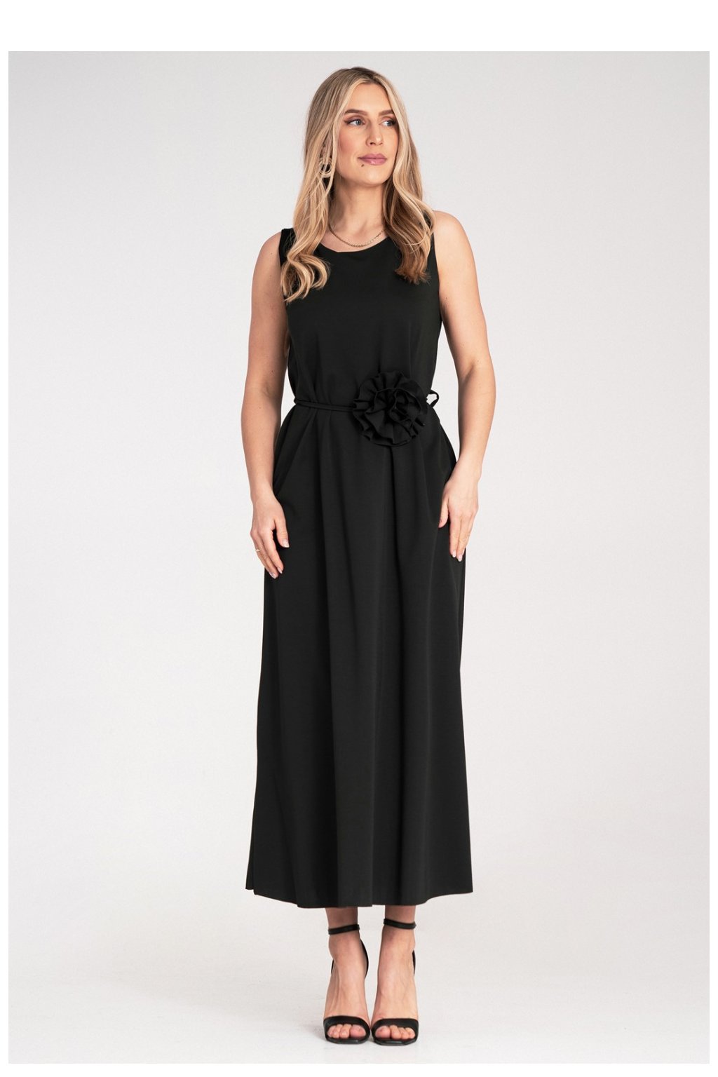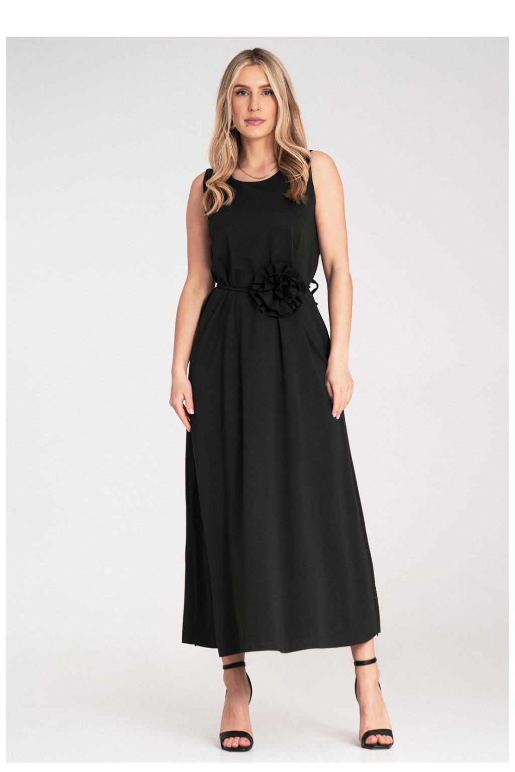 Maxi šaty bez rukávů s kulatým výstřihem a přímým vrškem. V pasu tenký pás s ozdobným květem ze stejné látky. Spodek volný, lehce rozšířený, vyrobený z hladké, jemně padající pleteniny.Polyester 42 %