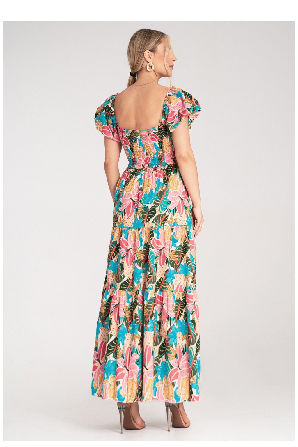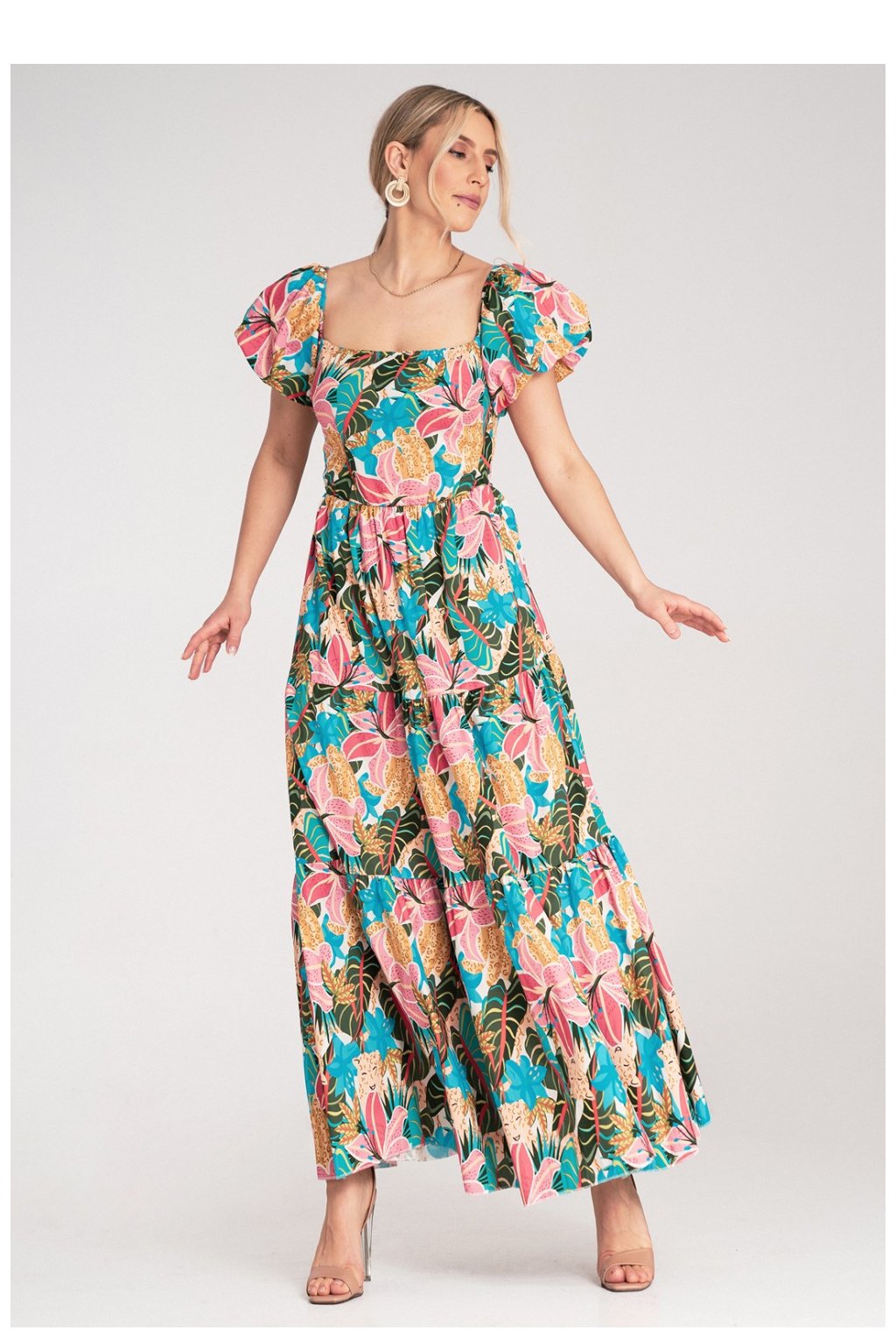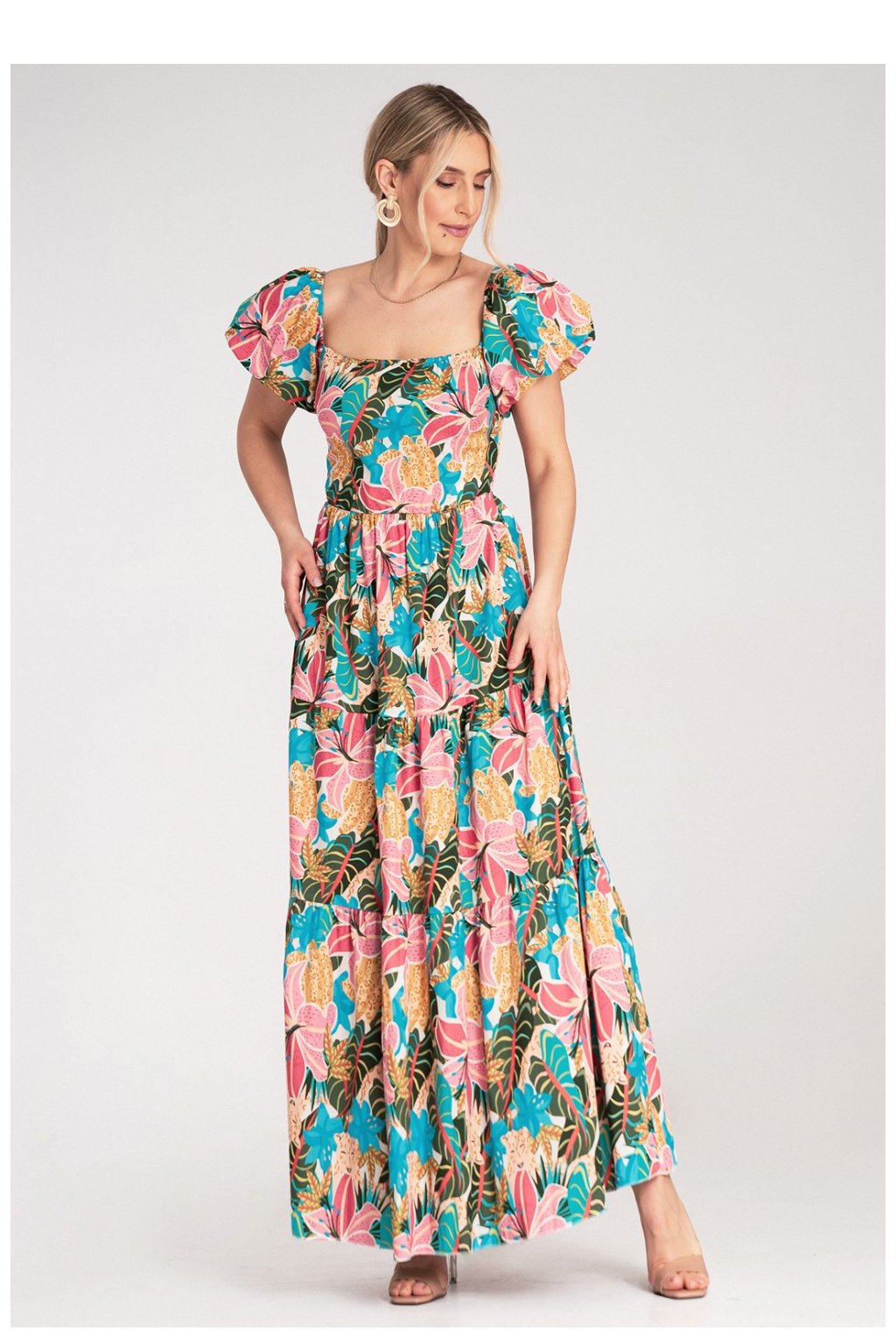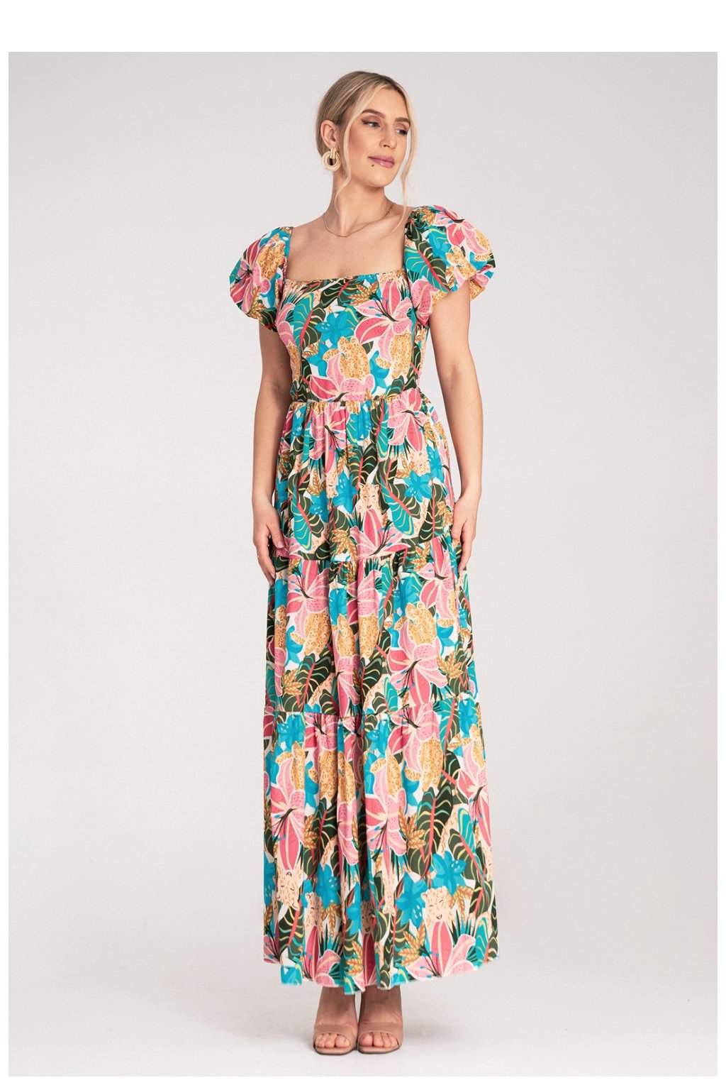 Maxi šaty s čtvercovým výstřihem a krátkými nadýchanými rukávy zakončenými gumou. Horní část elastická, se záhyby na zádech, přizpůsobující se postavě. Spodek rozevlátý, ušitý ze tří širokých, záhybovaných horizontálních vrstev.Elastan 2 %