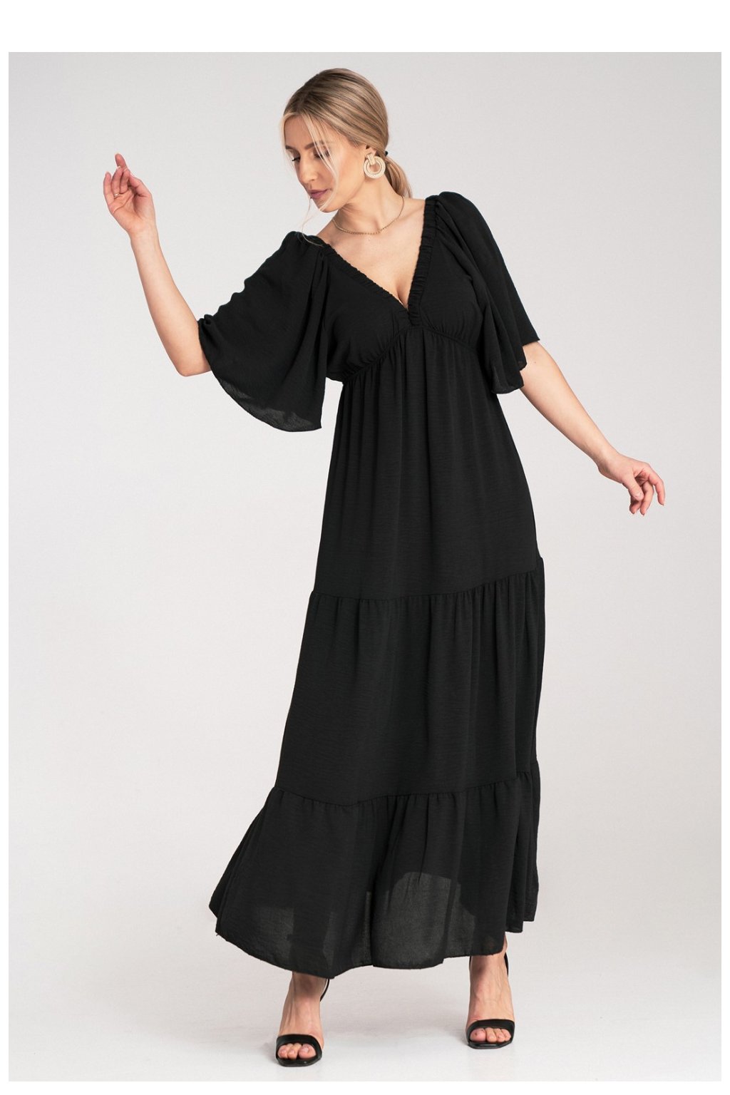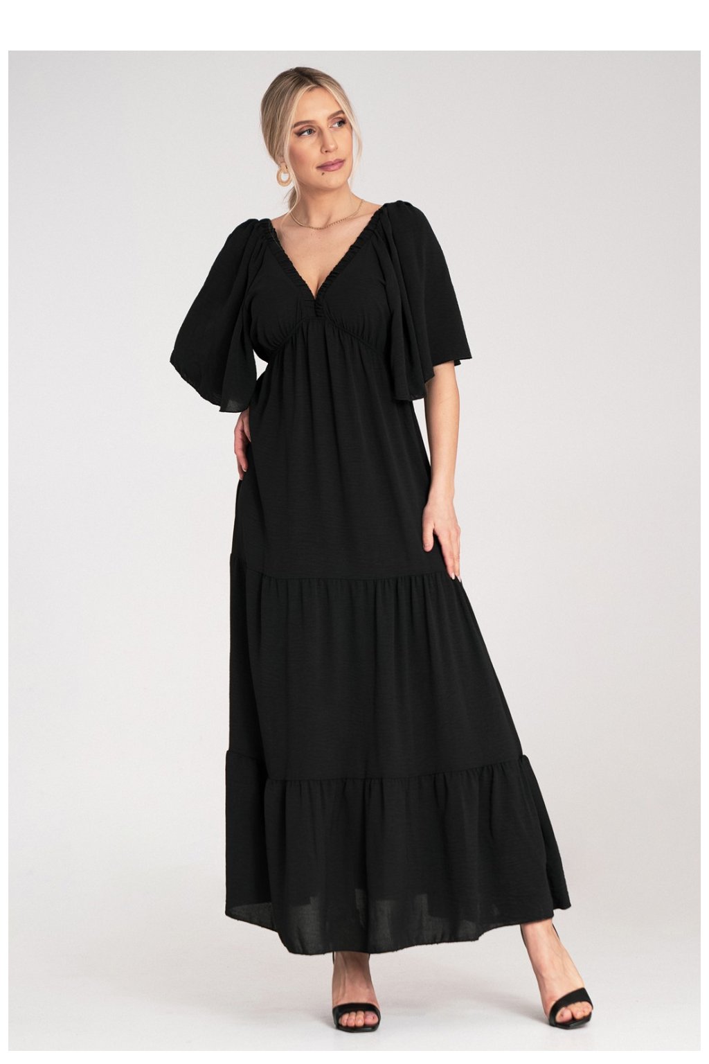 Maxi šaty s krátkým, volným rukávem a hlubokým výstřihem ve tvaru písmene V. Zadní část s efektním výstřihem a tenkou stuhou uvázanou na krku. Spodek se skládá z širokých, vodorovných volánů, tvořících vrstvenou konstrukci.| Velikost | Délka | Obvod beder | Obvod prsou | Obvod v pase |