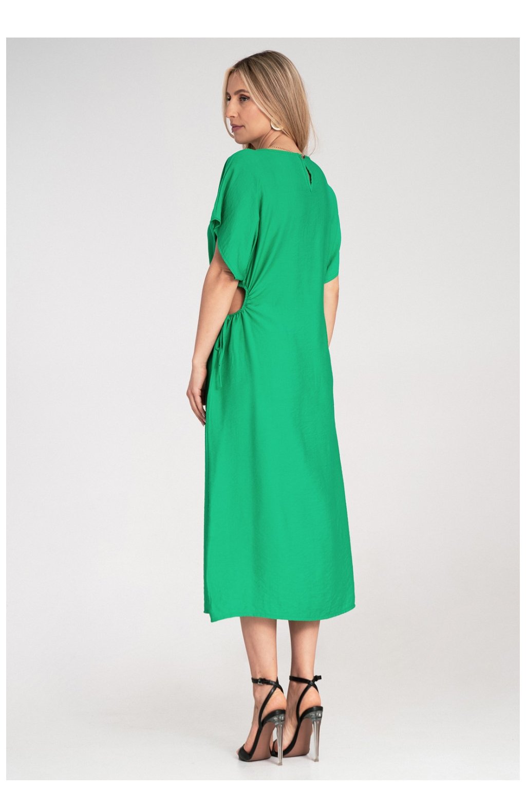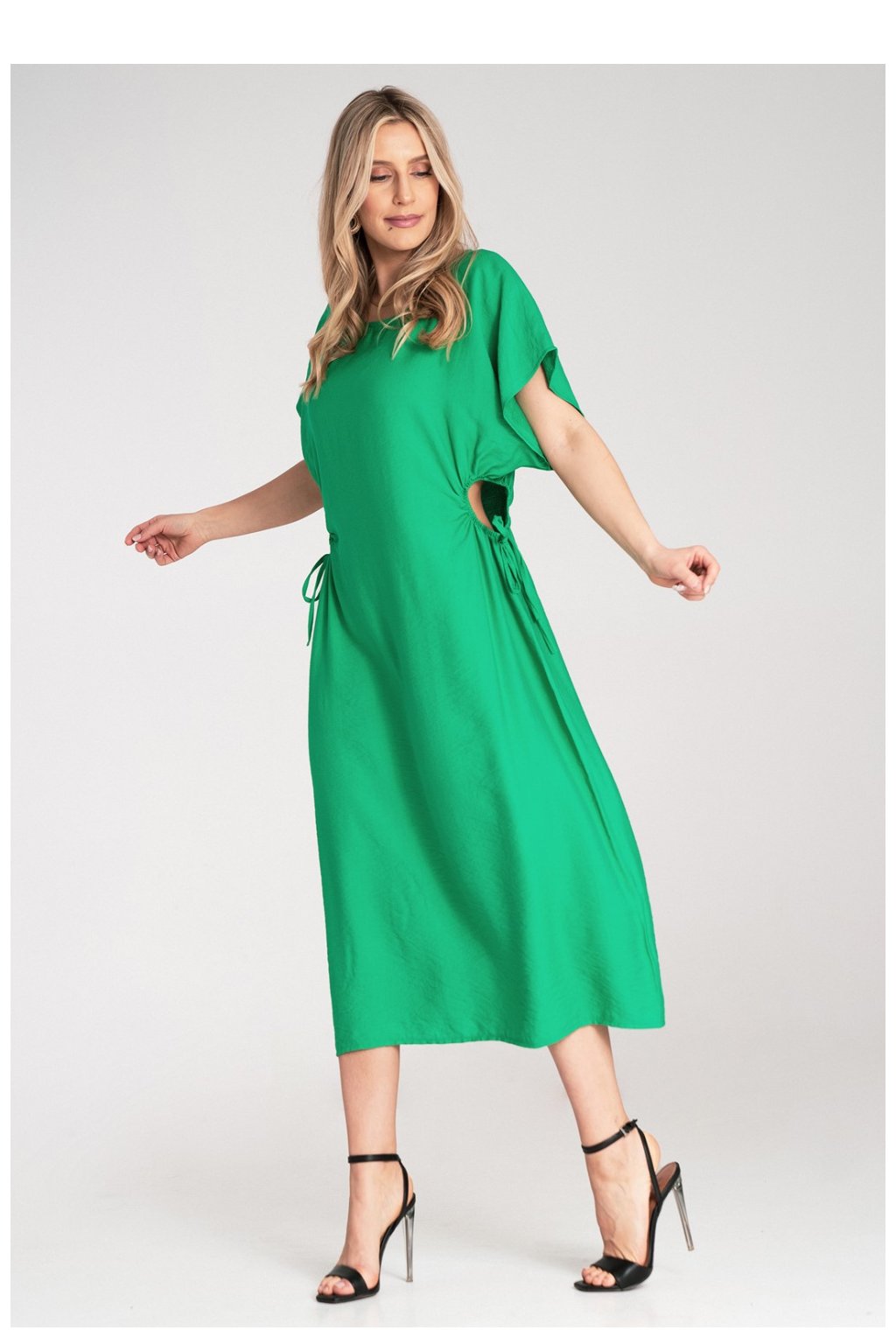 Šaty midi s jednoduchým střihem, s kulatým výstřihem a krátkým volným rukávem, který padá na rameno. Na bocích jsou záhyby s tunely a šňůrkami, vytvářející dekorativní výřezy.| Velikost | Délka | Obvod beder | Obvod prsou | Obvod v pase |