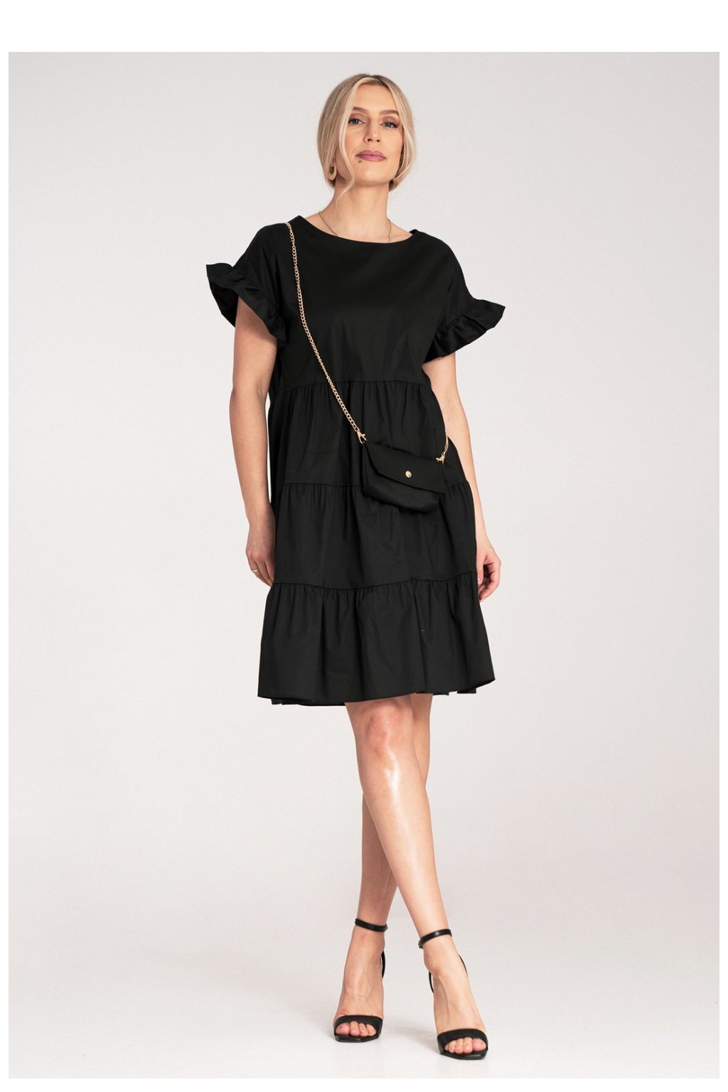 Šaty mini s volány, ušité z lehkého bavlněného materiálu. Model s volným střihem a krátkými rukávy zakončenými ozdobným volánem. Spodek rozkloštený s vodorovnými řezy dodávající objem. Součástí je malá kabelka ze stejného materiálu, visící na zlatém řetízku.Elastan 2 %