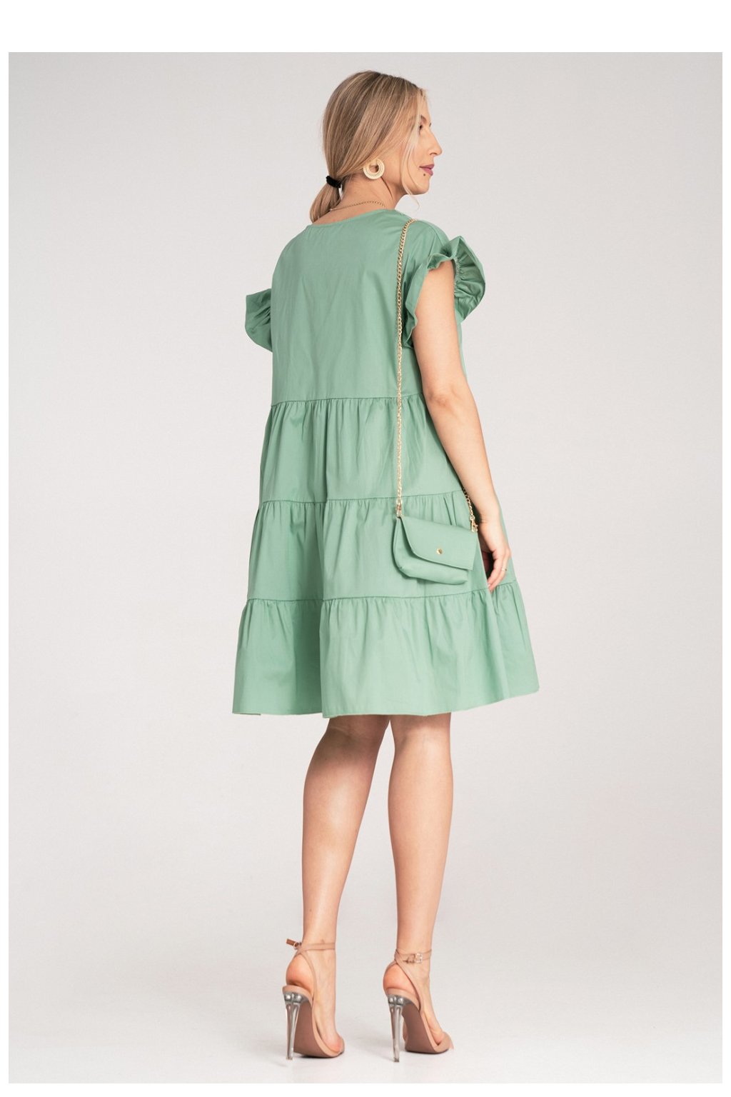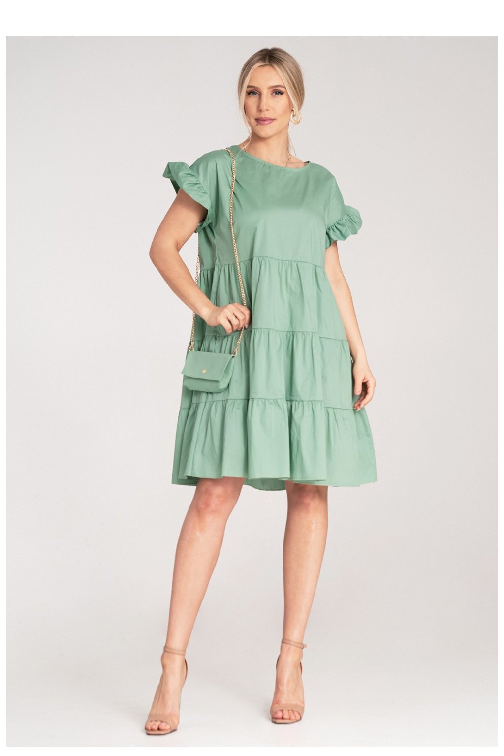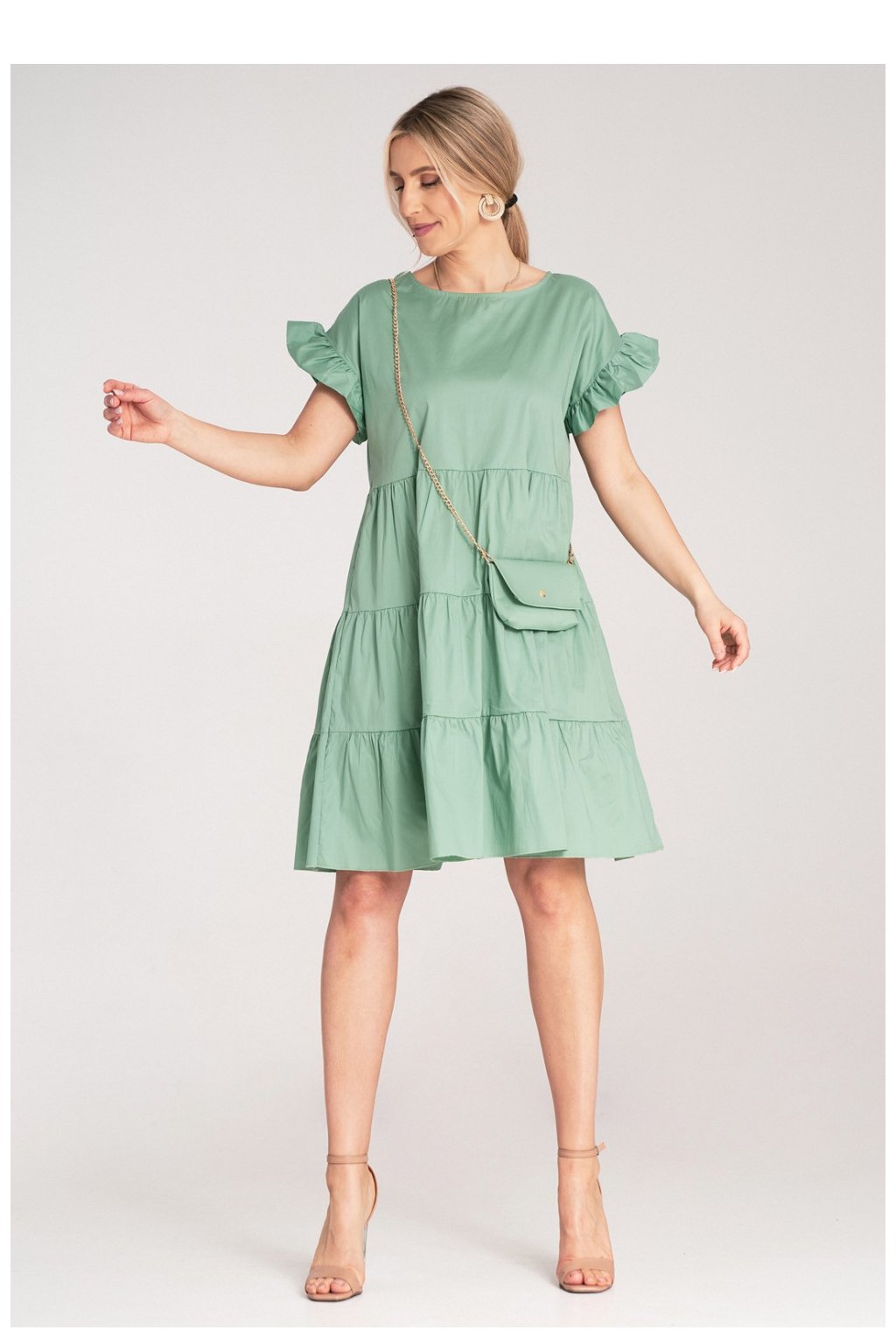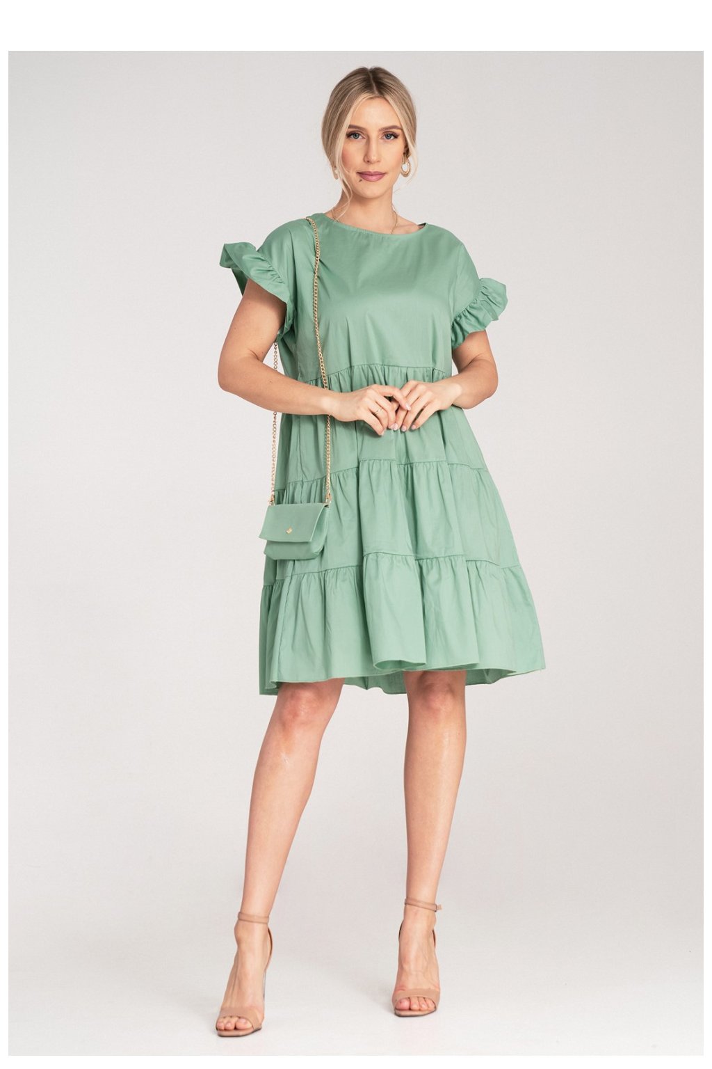 Šaty mini s volány, ušité z lehkého bavlněného materiálu. Model s volným střihem s krátkými rukávy zakončenými ozdobnou volánkou. Spodek rozšířený s vodorovnými střihy přidávající objem. Součástí je malá kabelka ze stejného materiálu, visící na zlatém řetízku.Elastan 2 %