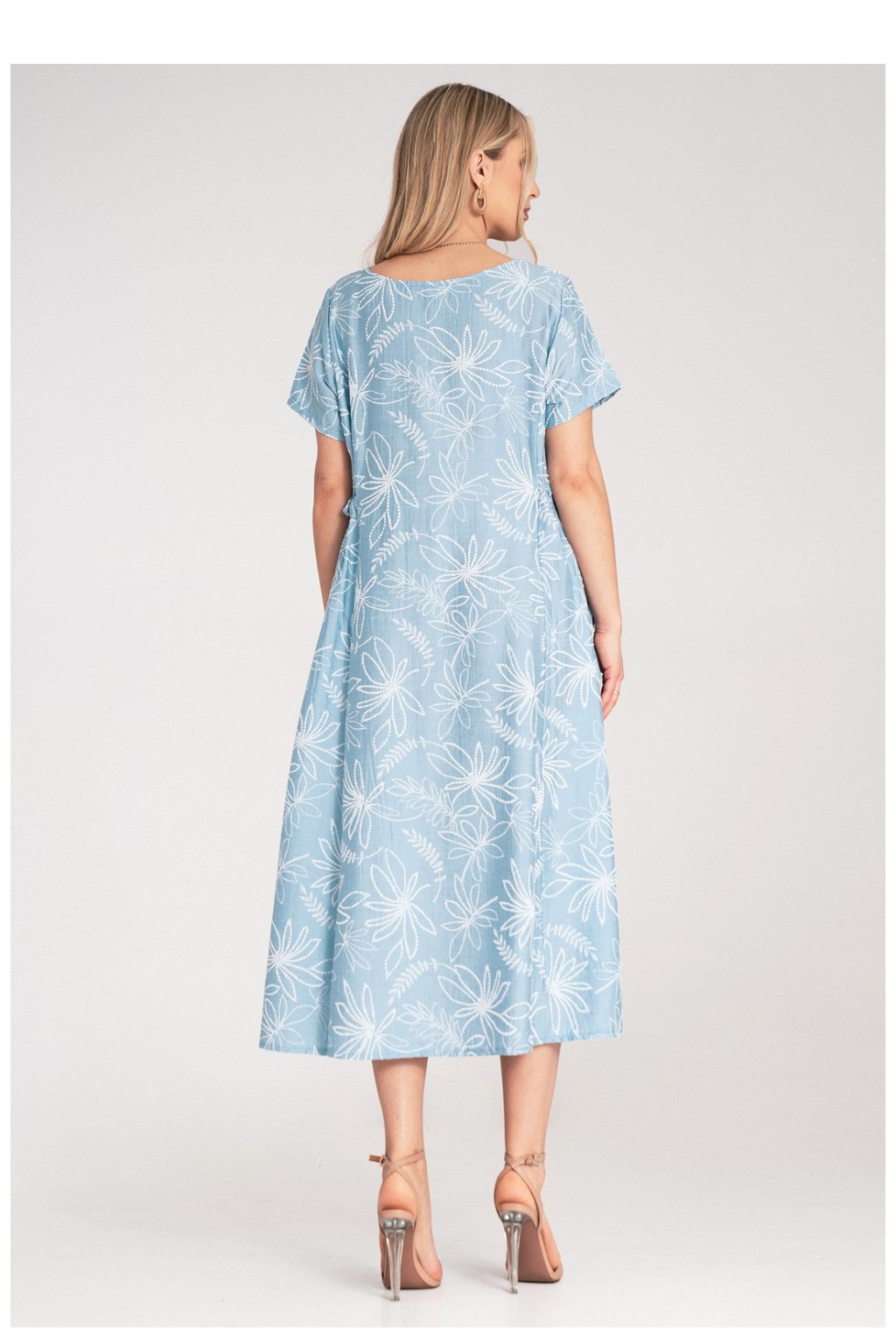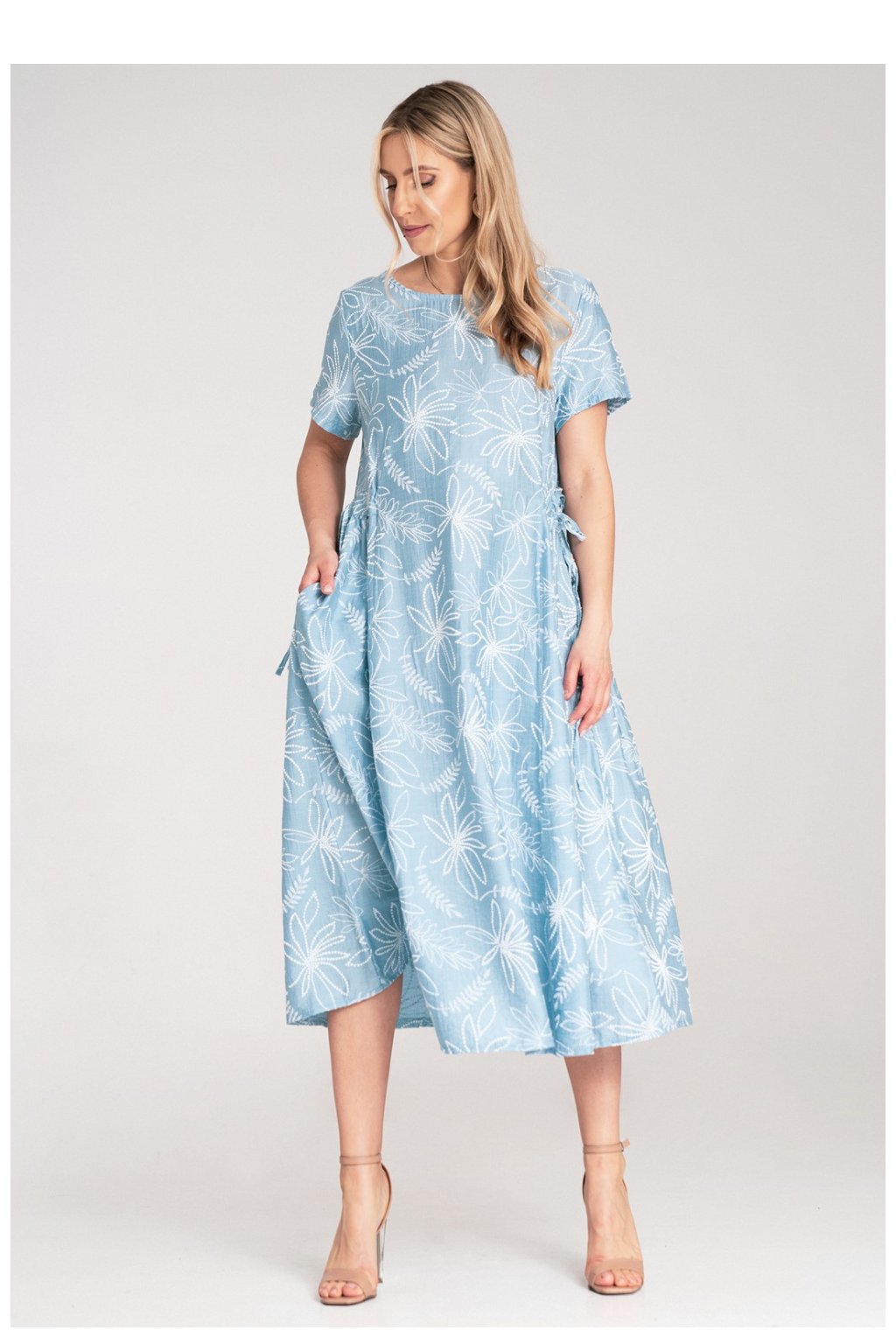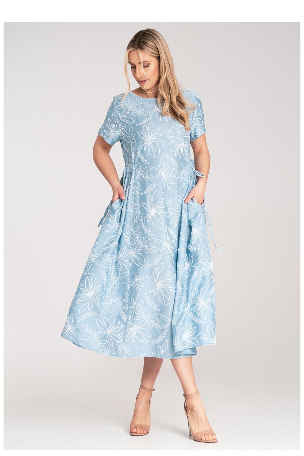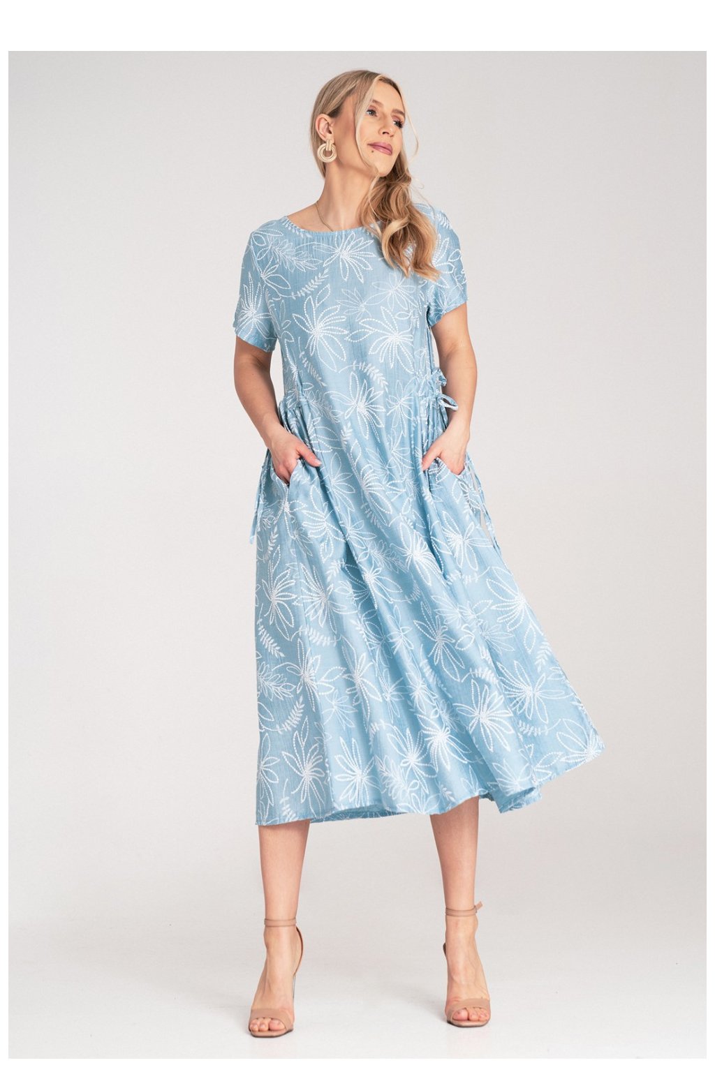 Šaty midi s krátkým rukávem a kulatým výstřihem, vyrobené z lehkého materiálu s bílým, vyvýšeným květinovým potiskem. Volný střih s bočními vázáními umožňuje regulovat šířku v pasu a přizpůsobit šaty různým postavám. Spodek lehce rozkrojený, s vodorovným prošíváním přidávajícím objem. Model vybavený praktickými kapsami po stranách.Viskóza 86 %