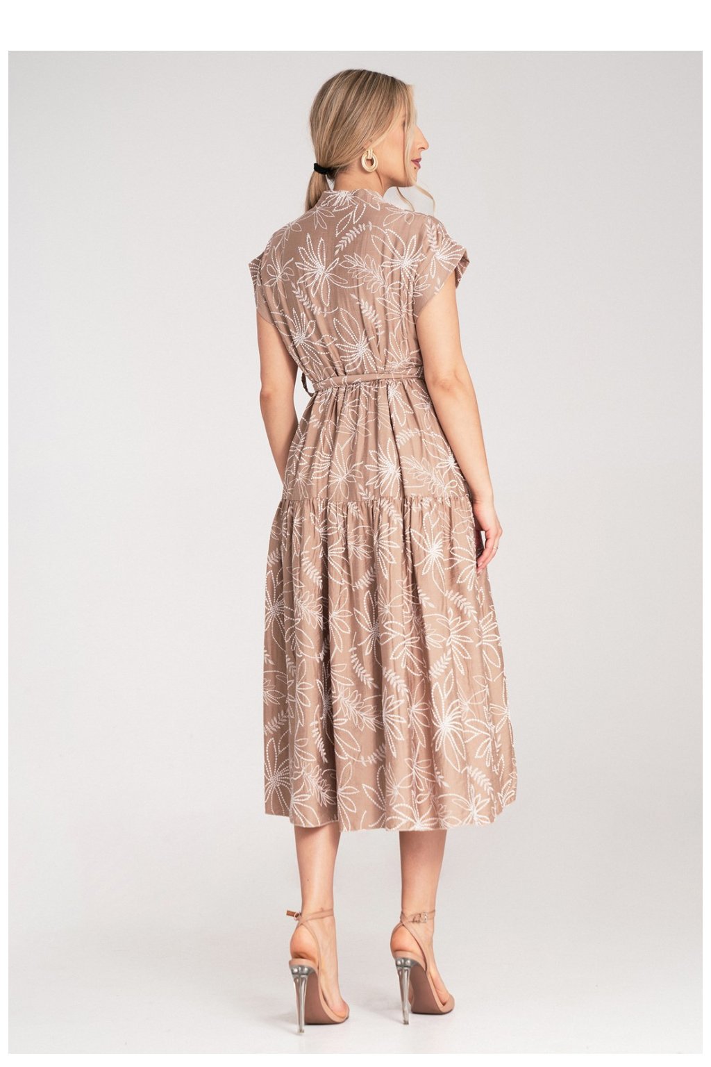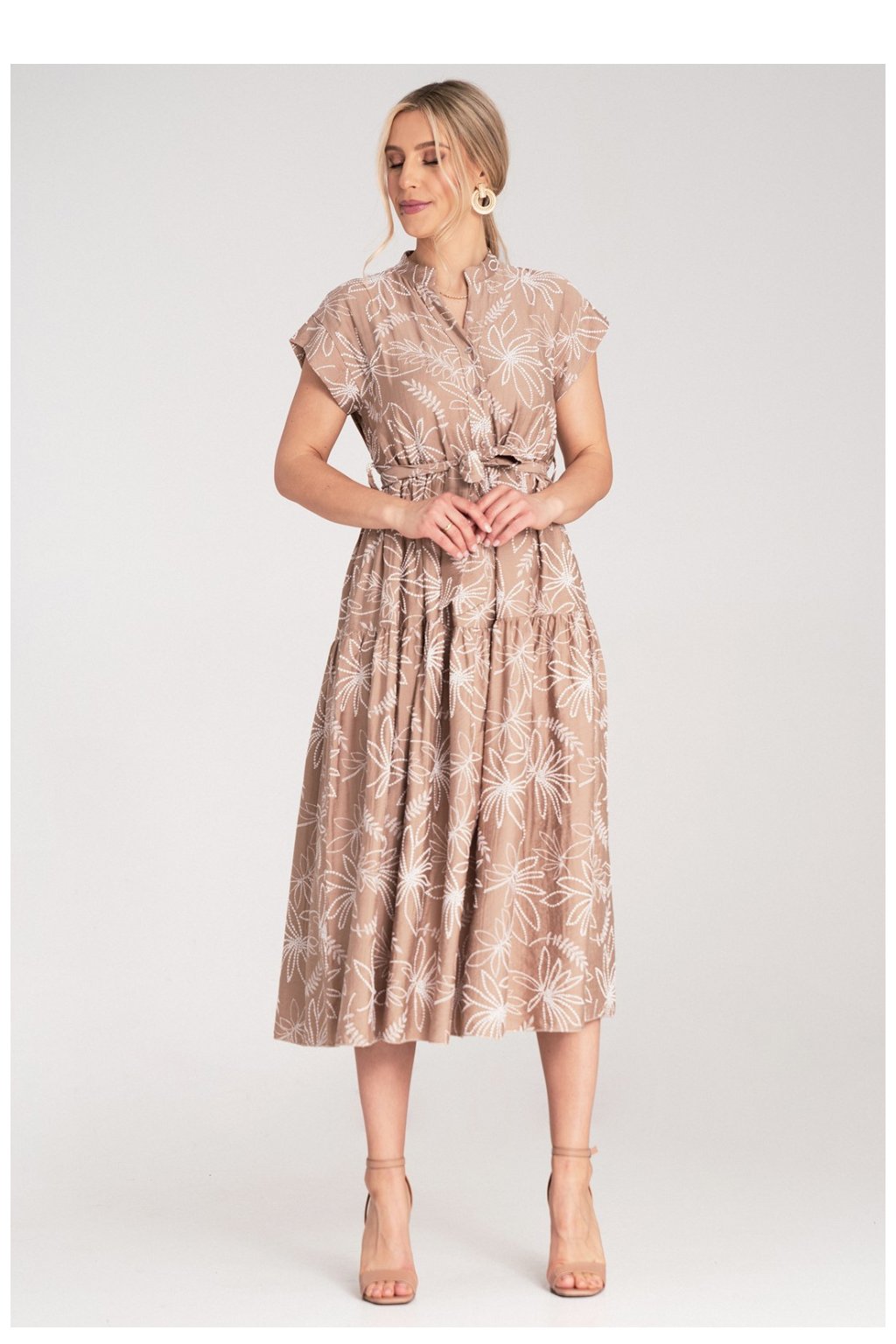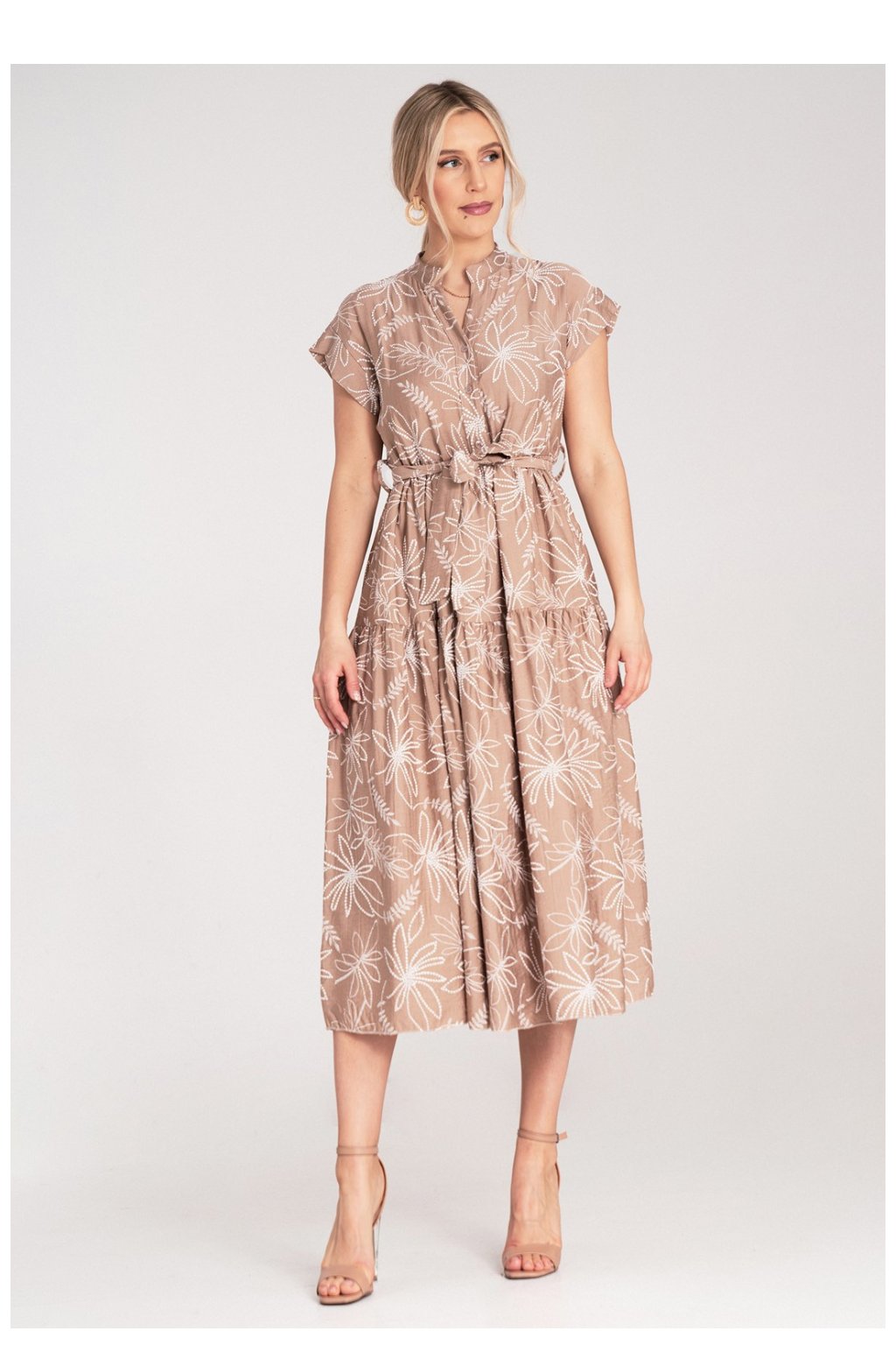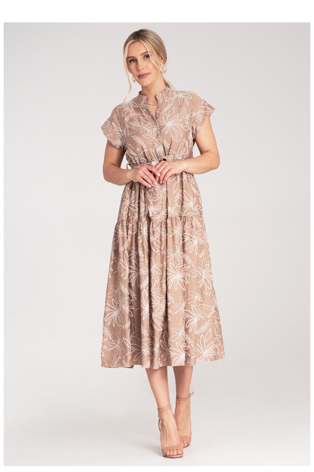Midi šaty s krátkým rukávem a stojáčkem u dekoltu. Horní část se zapíná na knoflíky. Po celé ploše je potisknutý bílý, vyvýšený květinový motiv s gumovou strukturou. V pase tenký pásek k zavázání ze stejného materiálu, dole široký volán přidávající objem.Viskóza 86 %