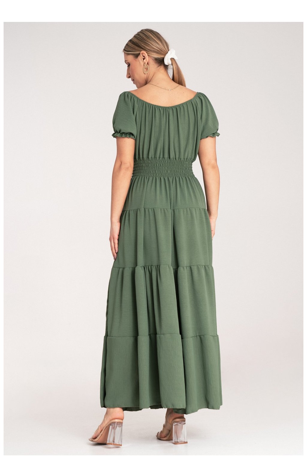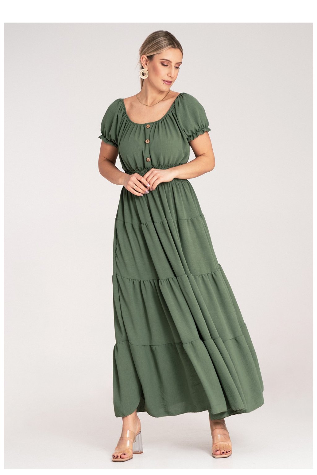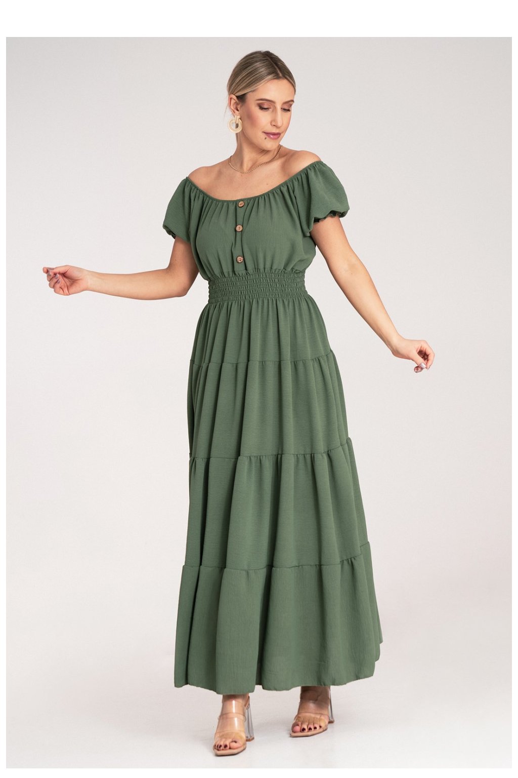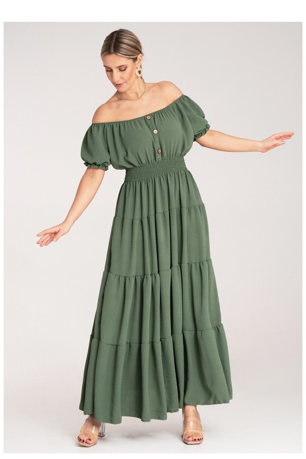 Letní maxi šaty s výstřihem ve stylu španělské ženy a krátkými rukávy. Model s dekorativními knoflíky, stahováním na hrudi. Šaty jsou elastické v pasu. Spodek je rozklosovaný, vrstvený.Polyester 95 %
